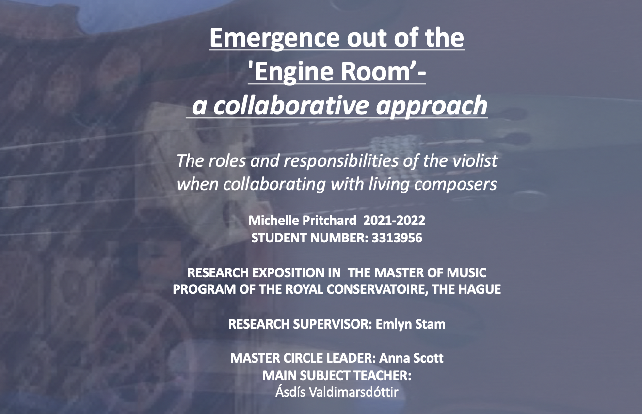 The late Nineteenth Century saw the emergence of the viola from the ‘engine room’ of the orchestra to a solo instrument in its own right, due to champions such as English violist Lionel Tertis. The viola’s rising status paved the way for collaborations between violists and composers, resulting in an expansion of a relatively limited repertoire and placing higher demands on the performer. Through theoretical and practical based research, I identify the roles and responsibilities of the classical violist when collaborating with living composers. At the centre of my practical investigations were collaborations with four composers in the realisation of new works and exploration of pre-existing works by three composers, as part of a cross-departmental/cross-cultural collaboration. These collaborations highlight the importance of a high level of musicianship and an ability to communicate with and without the instrument. Artistic and intellectual exchange through open communication results in mutually beneficial outcomes and a deeper connection with the music. Additionally, these collaborations reveal that the viola is still emerging as a solo instrument, needing further experimentation and exploration. The final aspect of my research is the curation of a lecture-recital series showcasing these new compositions, anchored with works from the standard and lesser-known repertoire. The future aim is to perform and record these new works in order to reach a wider audience. Successful collaborations contribute to the generation, promotion, and contribution to the classical viola repertoire and the status of the instrument itself now and into the future. Bio Michelle Pritchard is an Australian violist, violinist and pedagogue, studying her Master in Classical Music (Viola) with Ásdís Valdímarsdottír at The Royal Conservatoire, The Hague. In Australia, Michelle studied with Alex Todicescu, Sydney Conservatorium. Later with Jeremy Williams, obtaining an Associate of Music Diploma with Distinction, and a Graduate Diploma of Professional Music Performance Practice through the University of Tasmania. Specialising in chamber music, Michelle established a concert series in Sydney. She has toured Europe as recitalist and as a member of the Hourglass Ensemble. Additionally, she founded ‘Eisteddfod on the Mountain’ in the regional area north of Sydney