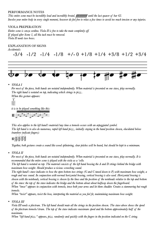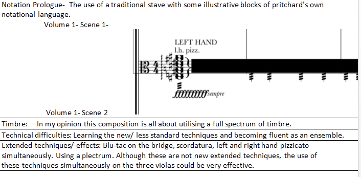 Working on a composition of this nature, predominately creating an atmospheric soundscape as a viola trio with a spectrum of new techniques will challenge my bow control, left hand micro-tonal training and ensemble skills. Working alongside Pritchard as both composer and performer adds another interesting element, especially since he is a violist of considerable skill. Working with our teacher Valdímarsdottíras a collaborator has been valuable given her open-minded approach to new music. This has resulted in extending my skills as a performer.