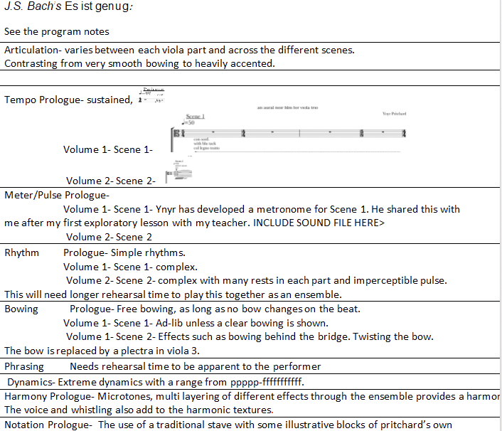 Pritchard’s style of composing is different to that of any other composer’s work I have studied. Interpreting his notation on a standard score is like learning a new language. As this collaboration is in its initial stages at this point in my Research, I need to gain a deeper understanding and have more time studying the score on my own and explore it with Pritchard and Valdímarsdottír as a trio.