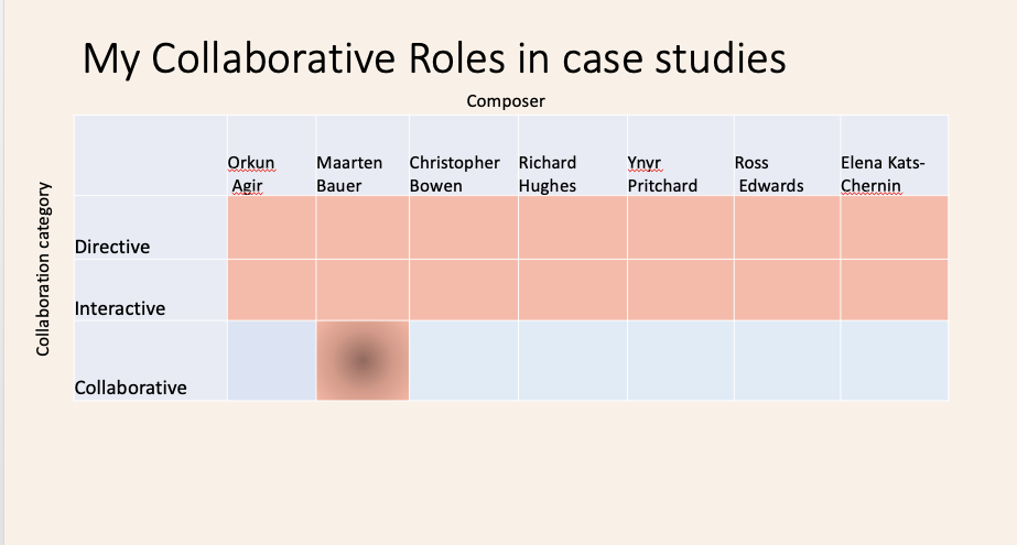 The “collective decision making process” could possibly be at home in the “Collaborative” category as initial concepts were discussed with the composers prior to the new works’ conception. The clearest example being my collaboration with Bauer who based the composition on my life story, using the audio of my interview with him in the music. Although even in this case it was he who essentially chose the parts of that interview he would structure the work around. For the other part I do not take credit for how these works were shaped structurally, melodically, rhythmically or harmonically. I have only provided ideas for instrumentation and the length of the work and indicated whether I resonated with the concept behind the music as discussed to varying degrees with each composer.