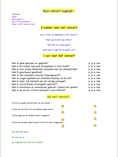 In combination with the Repertoire sheet students describe their end goals first and after this connect them to strategies and creative solutions to create a personal practice process.