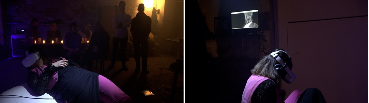 Comparing the following video showing guests trying out the VR installation with an audience watching them with the video presenting the actual VR installation as an individual experience ‘from the inside’ in the chapter ‘Presentation of the four parts joined in our transmedia test’, one notices the difference and what I would argue is an artwork to be experienced individually embedded in a larger public exhibition, a perceiver of the former becoming performer in the latter.