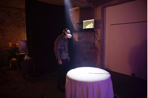 The VR experience was an installation relying both on a psychical three-dimensional space with an about 85 cm tall round column the audience was invited to touch and sit on, while they experienced and interacted with the ethereal sexual encounter on a similar but more abstract column in their VR-headset.