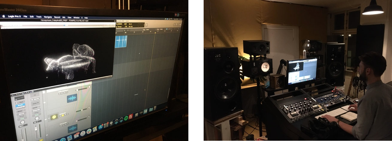 Actually, our small test was meant just as a rehearsal but I ended quite satisfied with the result and chose to use a cut-down version of the scene with some graphics mimicking the running app and minor sound design as part of the proto type of HONEYMOON IN POMPEII – and instead focus on the virtual reality experience which proved way more difficult to produce.