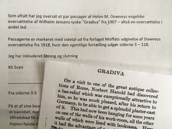 “ As agreed, I’ve translated some passages of Helen M. Downeys’ English translation of Wilhelm Jensen’s German “Gradiva” from 1907 – that is, a translation of a translation.