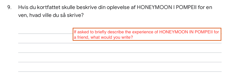 Two of the respondents knew of the project (though not in details): One knew producer Mads Damsbo and another, a student at the National Film School, had heard me present it there at a very early developmental stage. The others had no knowledge whatsoever of the project except that it was part of an artistic research project, that it would be a test of a transmedia artwork consisting of film, text, sculpture and VR, that it would be in Danish, that its title was HONEYMOON IN POMPEII, and that they would experience four different parts with 15 minutes for each part and afterwards have about 30 minutes to answer a questionnaire on a computer (anonymously or not as they preferred).
