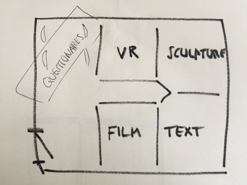 We asked into each specific connection drawn between all possible pairs of two: Film-Text, Film-Sculpture, Film-VR, Text-Sculpture, Text-VR, Sculpture-VR. In the following I reflect on some of the answers regarding the perceived connections.