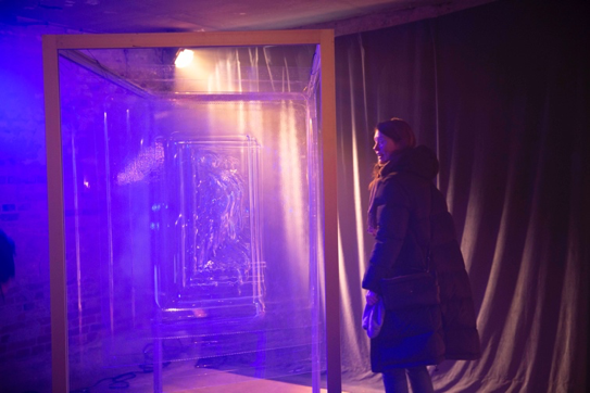 The VR experience was an installation relying both on a psychical three-dimensional space with an about 85 cm tall round column the audience was invited to touch and sit on, while they experienced and interacted with the ethereal sexual encounter on a similar but more abstract column in their VR-headset.