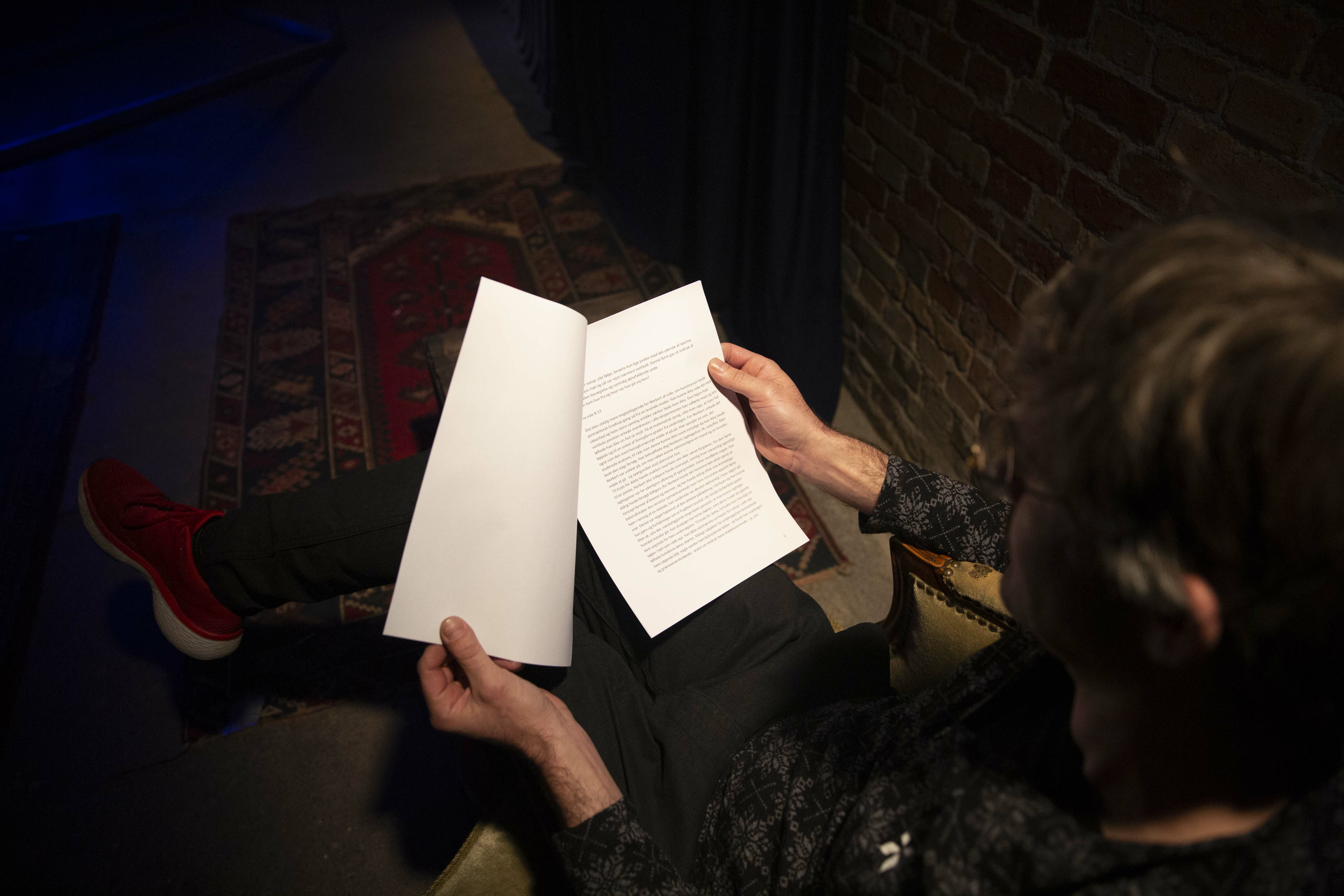 Producer Mads Damsbo and my ambitions were to invite 12 persons to experience the prototype of HONEYMOON IN POMPEII and allow them 15 minutes perceiving each media (artefact) in a random order before answering a questionnaire on a computer. We rented a well-suited place, divided it into four separate ‘rooms’ with intermittent stage walls so the audience would only experience one part (the film, text, VR or sculpture) at a time without having any knowledge of the other parts, except, that they would eventually watch a short film, read a text, try out a VR experience, and perceive a sculpture which would all be part of the work exhibited.