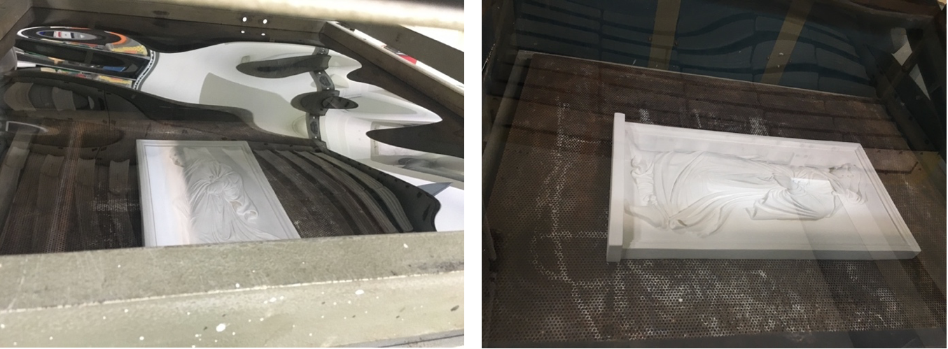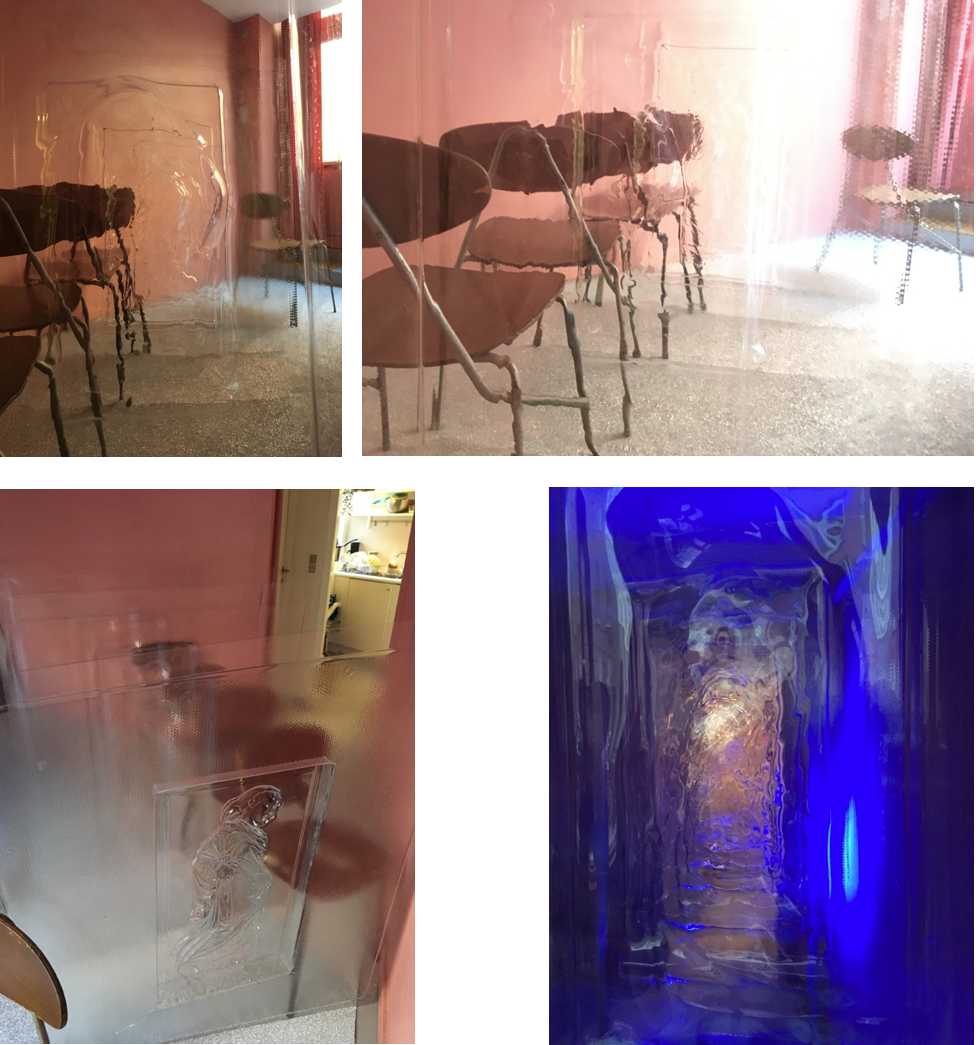 Independently of the film- and VR-work, I visited associate professor Malene Bang who’s in charge of the laboratory for sustainable materials at the Royal Danish Academy of Fine Arts. She had offered to help with the vacuum-casting of the Gradiva-relief I had purchased from the Staatliche Museen’s Gipsformeri (Replica Workshop) in Berlin. It was exiting to gain insight to the technique and having done a few test ‘prints’, I decided to make different copies where the relief would go from an almost invisible abstract form to a very precise although transparent copy of the plaster copy.