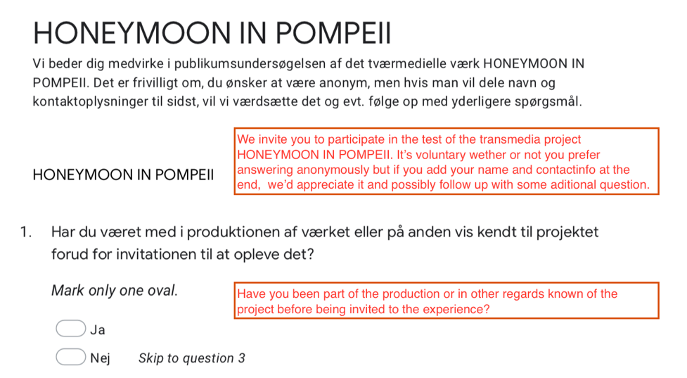 Two of the respondents knew of the project (though not in details): One knew producer Mads Damsbo and another, a student at the National Film School, had heard me present it there at a very early developmental stage. The others had no knowledge whatsoever of the project except that it was part of an artistic research project, that it would be a test of a transmedia artwork consisting of film, text, sculpture and VR, that it would be in Danish, that its title was HONEYMOON IN POMPEII, and that they would experience four different parts with 15 minutes for each part and afterwards have about 30 minutes to answer a questionnaire on a computer (anonymously or not as they preferred).