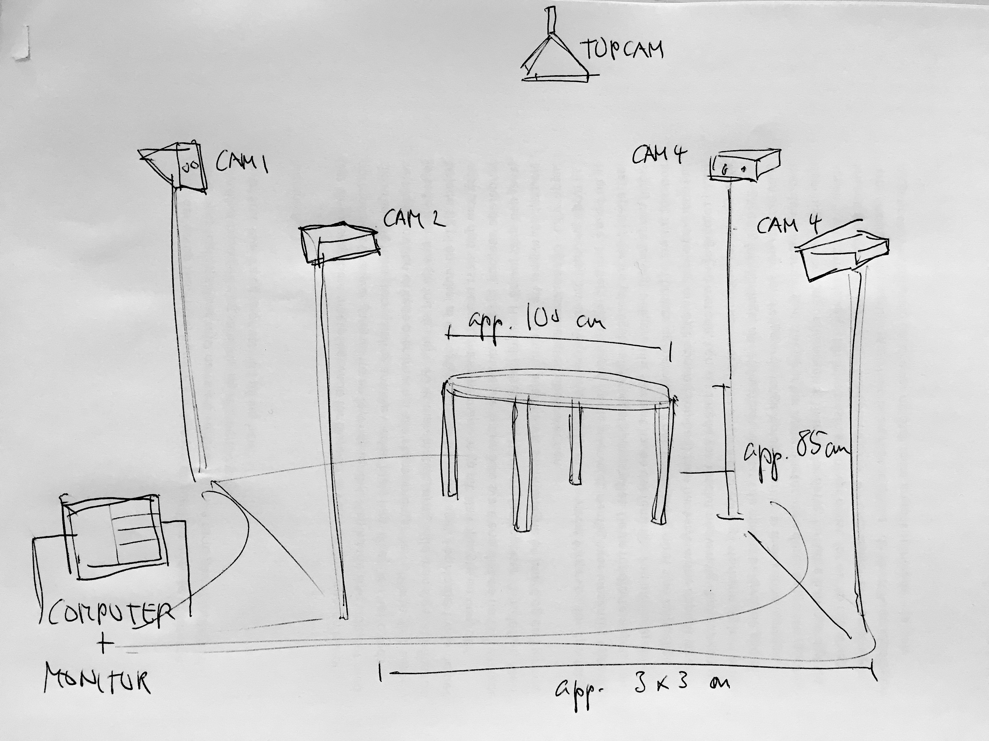 On this sketch, I’ve tried to illustrate our set-up with four cameras shooting volumentric footage (with a fifth camera from above as a back-up)
