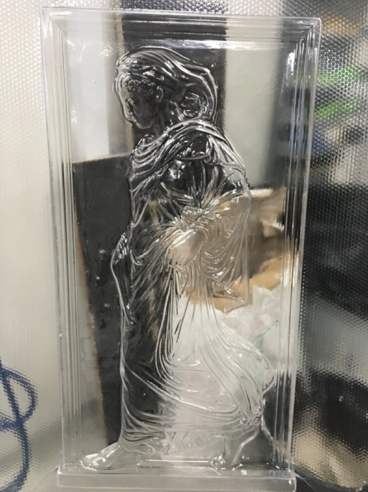 Independently of the film- and VR-work, I visited associate professor Malene Bang who’s in charge of the laboratory for sustainable materials at the Royal Danish Academy of Fine Arts. She had offered to help with the vacuum-casting of the Gradiva-relief I had purchased from the Staatliche Museen’s Gipsformeri (Replica Workshop) in Berlin. It was exiting to gain insight to the technique and having done a few test ‘prints’, I decided to make different copies where the relief would go from an almost invisible abstract form to a very precise although transparent copy of the plaster copy.