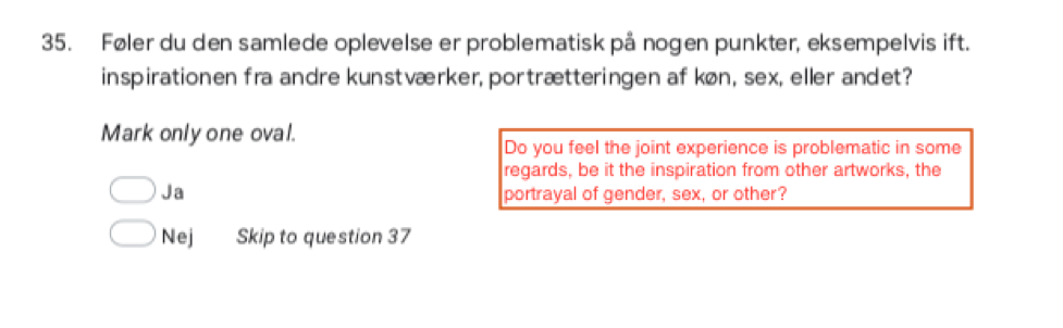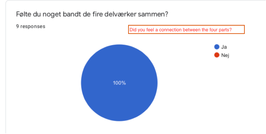 Asked if the respondents felt something linked the four parts together, all answered ‘yes’. I had chosen the word ‘something’ (noget) instead of more specifically, theme, story, or the like, to keep it open for interpretation. However, this poses a dilemma because of course ‘something’ links the four media: The mere fact that they are presented in an artistic research project links them, that they are experienced within a certain timeframe or at a specific site link them together, etc. Fortunately, all the respondents reflect on other aspects I find interesting for the research project.