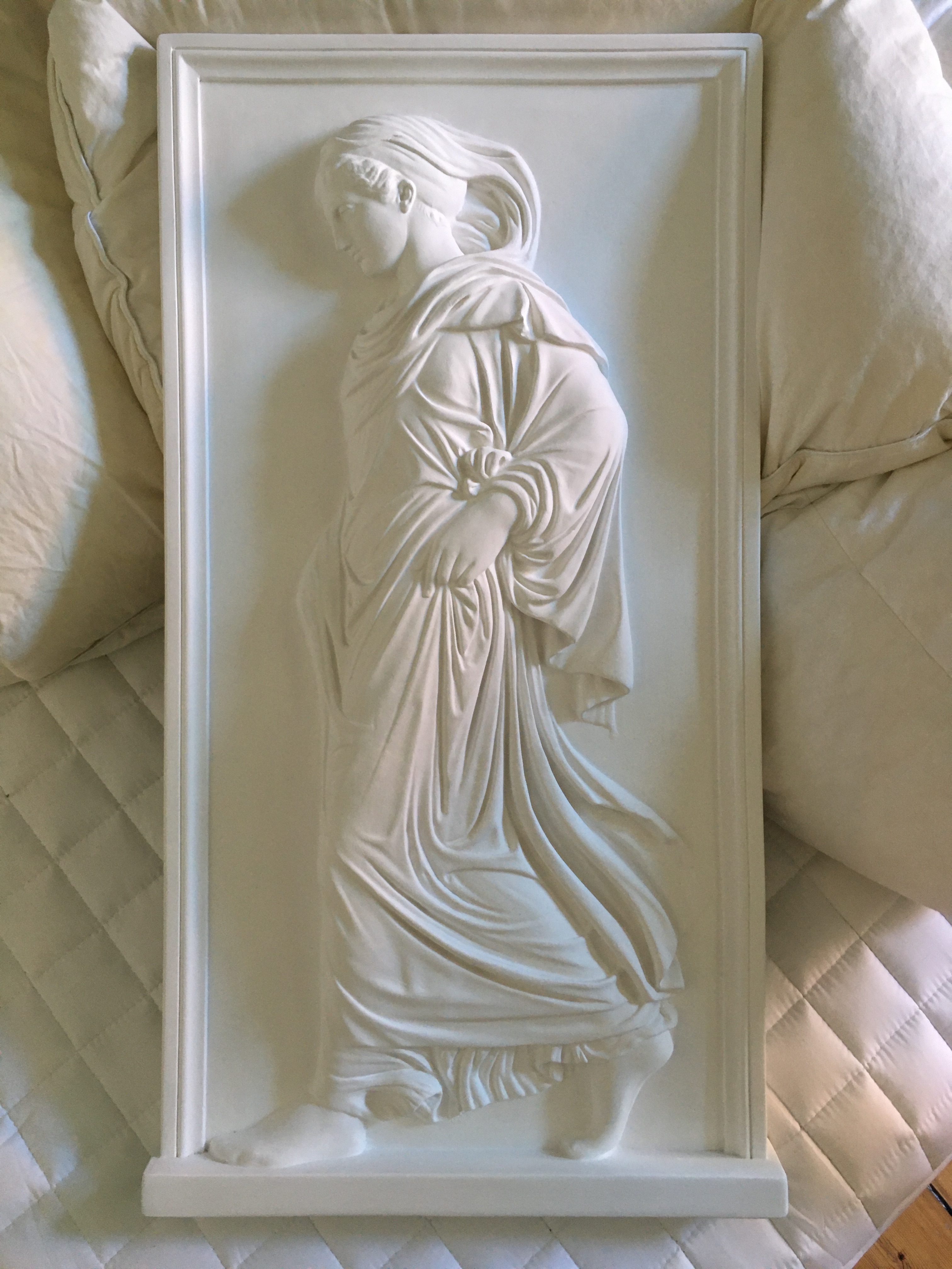 Simultaneously, I considered the sculptural part of the project. I thought of a sculptural three-dimensional representation of a couple either as a cast from a mold or maybe printed from the volumetric footage of our virtual reality work. But instead, I chose to work more directly with inspiration from Wilhelm Jensen’s “Gradiva” and quite spontaneously chose to order a plaster copy of the bas-relief from the Staatliche Museen’s Gipsformeri (Replica Workshop) in Berlin. I had discussed possible ways of sculpturally interpreting the relief with another artist and asked Malene Bang, associate professor at the School of visual arts at the Royal Danish Academy of Fine Arts if she could help vacuum-casting the bas-relief with different sheets of plastic. As mentioned regarding inspiration, I felt some Derridean archive fever or at least felt some similarities to the archeologist’s obsession with the bas-relief in regards to my own decade-long fascination with the Pompeian plaster casts. Receiving the relief sort of aligned myself with Norbert Hanold who likewise orders a plaster copy of the relief on returning from a trip to Rome where he has seen the original.