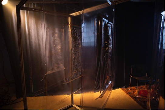 Producer Mads Damsbo and my ambitions were to invite 12 persons to experience the prototype of HONEYMOON IN POMPEII and allow them 15 minutes perceiving each media (artefact) in a random order before answering a questionnaire on a computer. We rented a well-suited place, divided it into four separate ‘rooms’ with intermittent stage walls so the audience would only experience one part (the film, text, VR or sculpture) at a time without having any knowledge of the other parts, except, that they would eventually watch a short film, read a text, try out a VR experience, and perceive a sculpture which would all be part of the work exhibited.