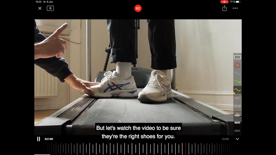 It was great fun working with actors Aske Bang and Minna Flyvholm Tode on the short film about the young man helping a costumer buying running shoes. I named him Norbert as the archeologist in Jensen’s novel. Before rehearsing, I’d been at a shoe store, tried on running shoes and discussed how the employees filmed the costumer’s running on a treadmill using a specific app on an iPad. Aske and Minna visited me twice. First, I rehearsed with them without any recording devices. The second time, we simply shot the scene from the fixed perspective one would shoot a running test, letting the characters walk off screen, rewind and watch the video and discuss it, a technique I had thought interesting as it relies on an intradiegetic camera turning into a intradiegetic viewing device for the characters (being able to rewind, slow, or stop) in visual alignment with the perceiving audience.