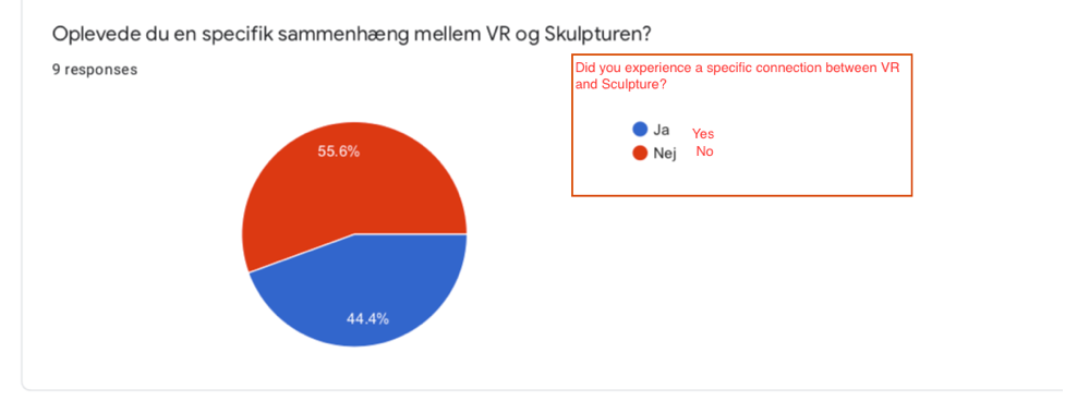 Only one of the pairs had less than half of the 9 respondents perceive of a specific connection and it was the Sculpture-VR. ‘(…), not so strong a connection, but I had noticed the sculpture’s (the first part I experienced) position of the feet, and when the VR started with touching of feet, I felt a connection. It is also possible this was first realized explicitly when watching the film’ (Igen ikke så stærk en sammenhæng, men jeg have bemærket skulpturens fod position (det første delværk jeg så) som noget særligt, så da VR startede ud med berøring af fødder, synes jeg at fornemme en sammenhæng. Det er også muligt at dette først blev rigtig tydeligt for mig da jeg efterfølgende så filmen.). Another sees a very different connection not relying on the represented feet but merely perceptual qualities (answer in English): ‘The VR piece is wonderfully sculptural. A sculpture in light. When I was observing the sculpture, I looked at the most defined piece and all the other “planches” behind. It gave a similar sense of depth and infinity as the VR’. Having worked with the VR installation as a ‘living sculpture’ I find this answer interesting. Due to their specific qualities as interactive, the sculpture and the VR experience invite the audience to choose their own perspectives from which to perceive the artefacts. I’ve often considered if VR is comparable to theater, film, or sculpture and of course it depends on the specific work at hand. However, it’s interesting to notice the respondent’s reflections on the perceptual qualities being similar and not necessarily what is being represented. A third answer regarding the VR-Sculpture connection refers to the overall title: ’The title explains the connection – it’s set in Pompeii’ (‘Værkets titel forklarer mig sammenhængen - det foregår i Pompeii’). As mentioned, this raises the question as to whether or not the title in itself can be interpreted as a media channeling information that unites the other media characteristics.