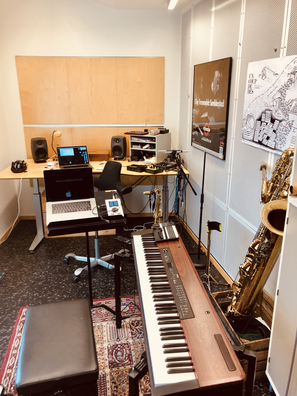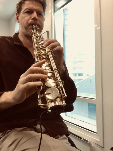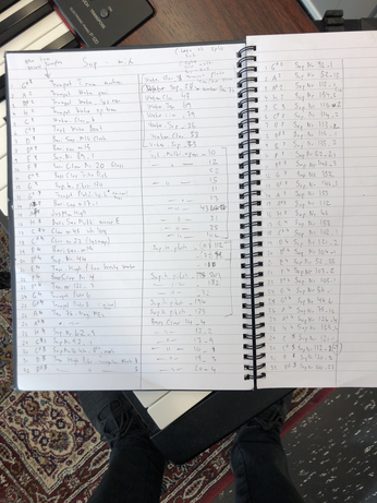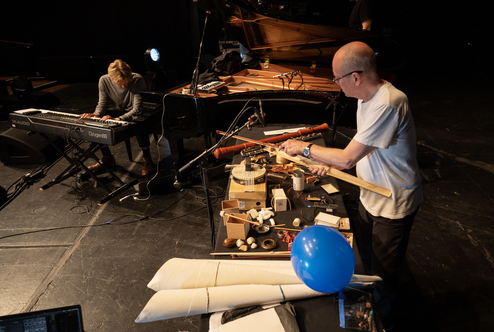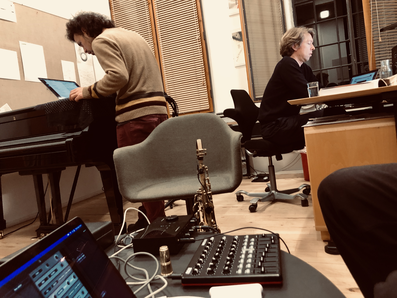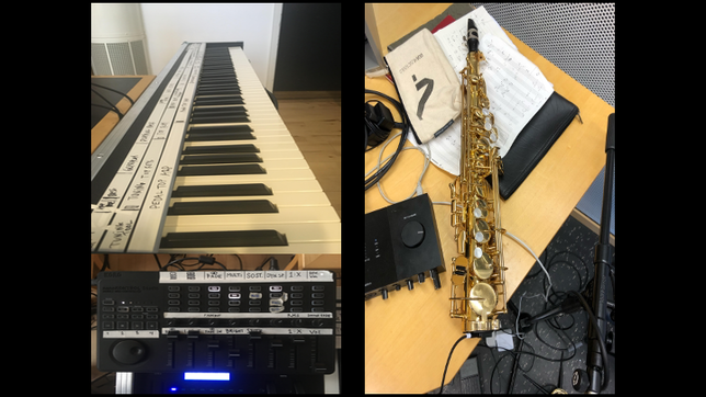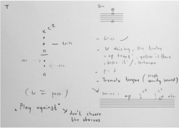 Ex. 2 is another excerpt from the same piece mentioned above. It exemplifies related yet distinct samples that carry different contexts, such as the samples from Kjærgaard's solo piano album 'Concrescence'. The bleed from Snekkestad's acoustic saxophone can be heard as sustained notes when he triggers piano samples from 'Concrescence'. Meanwhile, Toop's bone conduction microphone is audible, (re)playing samples on drum skins. Once again, the listening experience is transcribed, mapping out new territories and laying the foundation for further explorations.