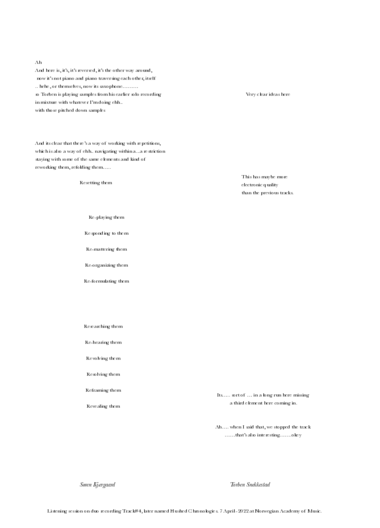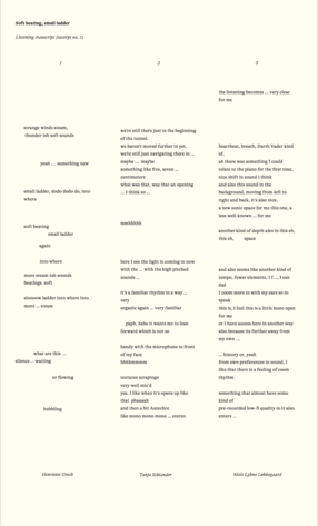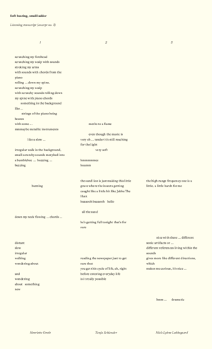 Ex. 1. illustrates the process, encompassing mapping, sampling, sharing, embedding, embodying, and listening to specific sounds (piano and reeds) as they undergo a sonic transformation. The listening transcripts form a new mapping of the sonic territories, which are then sampled, re-cut, and shared as track titles, poetic text snippets, and, concretely, as sampled voices and words. Ex. 1. is excerpted from the piece, 'Soft beating, Small ladder', released on the album 'Traversing Sonic Territories' (see Published Works)