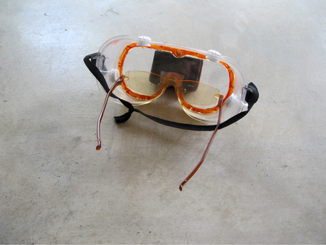 The facilitating device that offers an interior space from which the world is perimetered by the imploded oval of orange glasses, echoed by the orange painting of the larger rim of the goggles, then in front and outside of both, an action camera eccentrically mounted by means of screw supports and elastic.