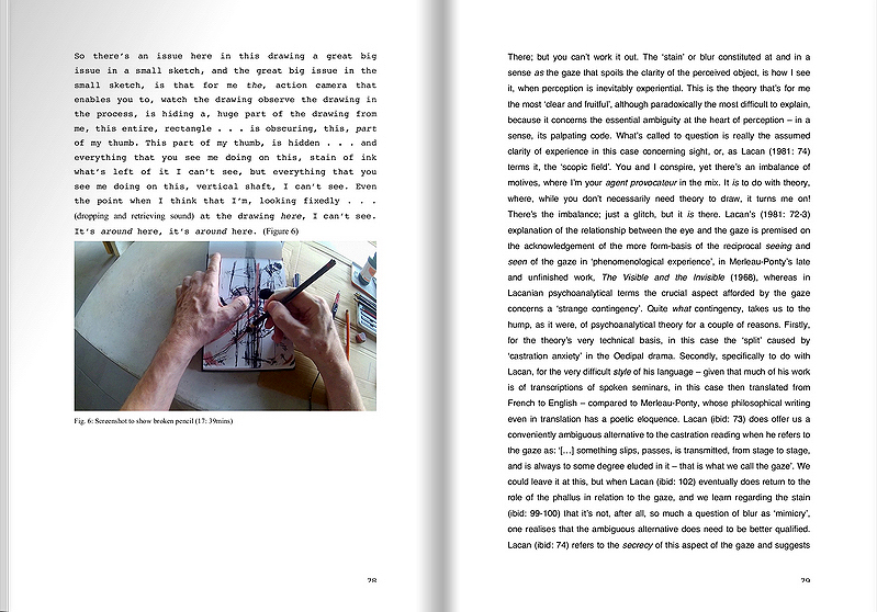 Here also, you see, you’ve referred to the camera’s physical obstruction of your view as reading, as noticeably availing itself to you in its capacity to hide aspects of your drawing from your own view, as a blind spot encoded in your drawing [....]