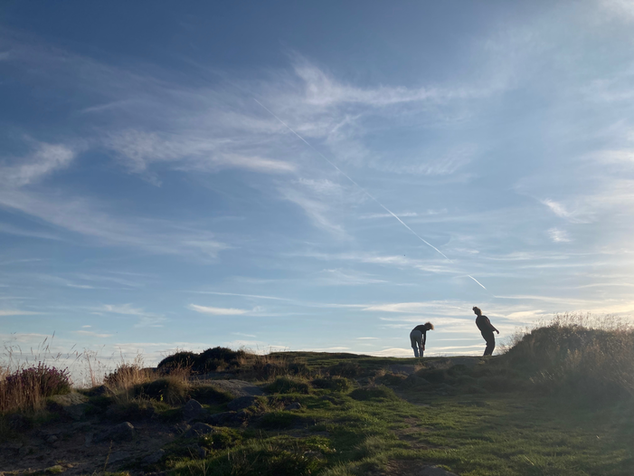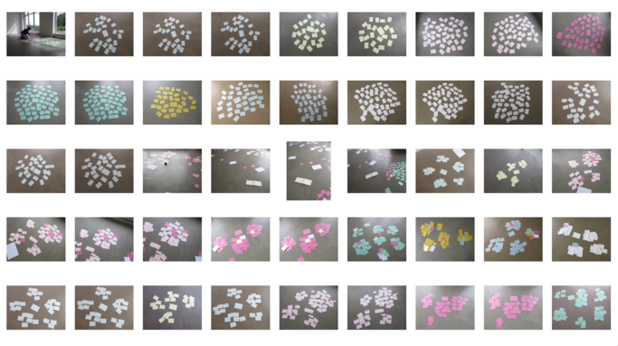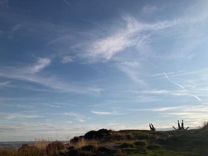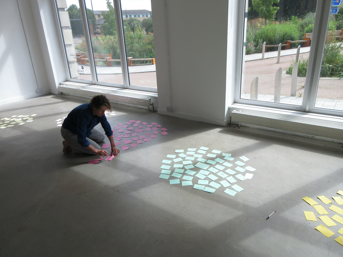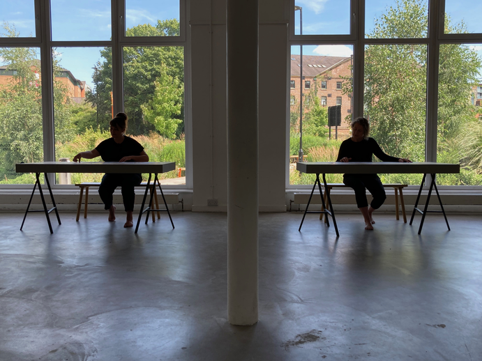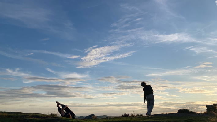 Between 12 – 19 July 2024, we – Katrina Brown and Emma Cocker – were working together (in person) within the frame of a short residency at Exchange Place (Yorkshire Artspace), Sheffield, to further develop our ongoing collaboration Dorsal Practices. We have been collaborating on this artistic research project since January 2021 and are currently in the process of exploring different ways for sharing this body of work with others, including through live ‘readings’, experiential testings and different forms of publication. During this week together, we engaged in different ways for returning to and reactivating material generated over the last few years – as a starting point for exploring how we might distil and organise research content in the direction of a future publication. We undertook several 2-hour ‘blocks’ of shared practice for returning to different foci or thematics within our enquiry – e.g. exploring the back and a dorsal orientation through lying, rotating, transitioning, moving-shaping, walking. At times, this involved a process of engaging in a period of physical movement practice, followed by an improvisatory ‘reading’ of textual material generated through our previous conversations and readings, and then a process of ‘dorsal’ conversation. Through this residency, we have been able to recognise distinct thematic constellations and emergent vocabularies (see documentation of the process below) for addressing different dimensions of the dorsal experience, which we will now further evolve by distilling textual scores and prose descriptions/evocations. We also activated various movement and reading practices for exploring dorsality in different locations (see images above), including both within the studio and outdoors in the landscape. Over the coming year, we are working together to bring this research project into the form of an artists’ publication.