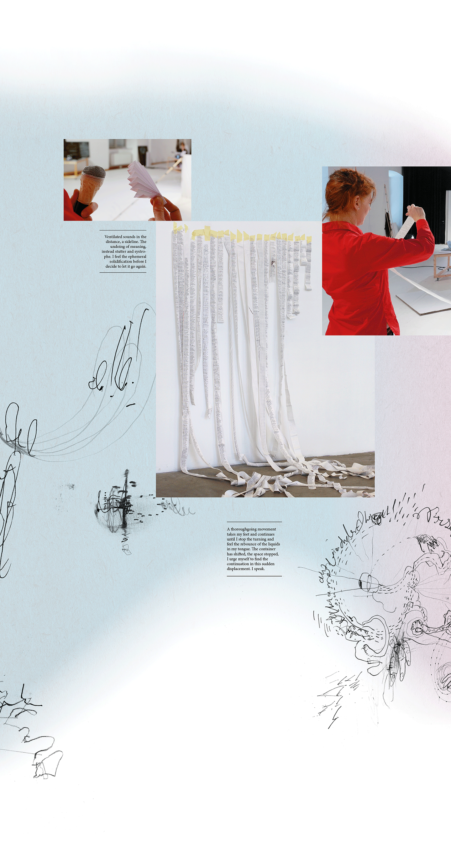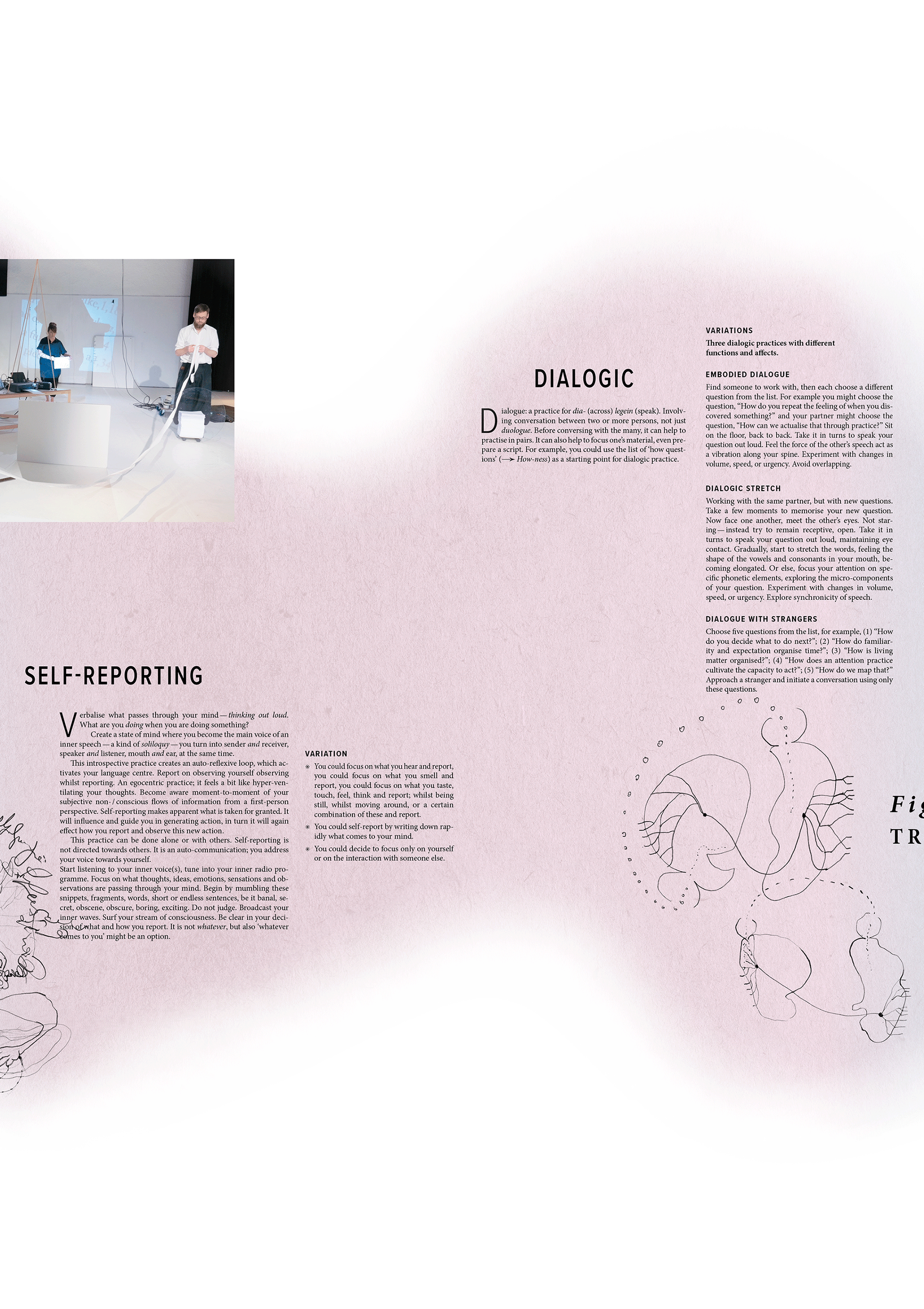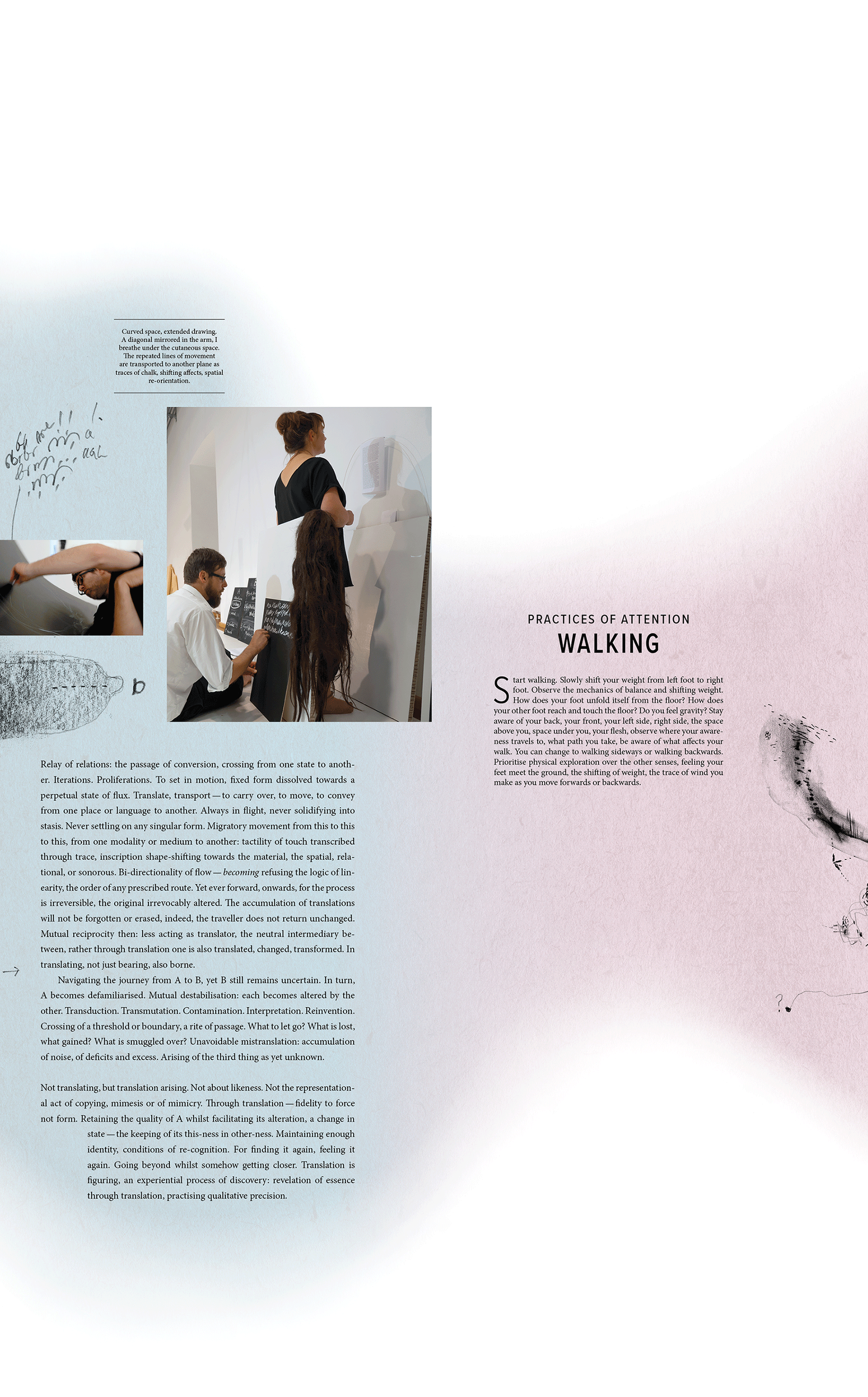 This exposition forms part of a chapter entitled ‘Choreo-graphic Writing – Towards More-Than-One Means of Inscription’ by Emma Cocker, Nikolaus Gansterer and Mariella Greil, published in Leena Rouhiainen, Kirsi Heimonen, Rebecca Hilton and Chrysa Parkinson (eds.), Writing Choreography: Extending the Conventions of Dance (Routledge, 2023). Abstract for the chapter: Choreo-graphic Figures - Deviations from the Line is an artistic research project by writer-artist Emma Cocker, artist-performer Nikolaus Gansterer and dancer-choreographer Mariella Greil, for exploring those modes of thinking-feeling-knowing emerging between the lines of choreography, drawing and writing. This research project involved the cultivation of various modes of “choreo-graphic writing” [more-than-one / means of inscription] at the interstice of choreography, drawing and writing, the evolution of experimental language practices as artistic research. Drawing on various “practices” and “figures” developed within Choreo-graphic Figures, Cocker, Gansterer and Greil explore how different performative, sensuous and experimental textual practices and bodily inscriptions emerge as immanent means of articulation for that which remains strictly beyond words: the embodied, relational, affective and material sensitivities and sensibilities of collaborative, co-emergent sense-making taking place in and through the interaction between bodies, between human and non-human agencies. The chapter comprises two parts: PART I — an “exposition” (encountered here) showing how Cocker, Gansterer and Greil performed choreography/writing beyond the page within the context of Choreo-graphic Figures presented online using the Research Catalogue (RC), an online platform for publishing artistic research; PART II — an “essay” (within the printed publication, Writing Choreography: Extending the Conventions of Dance (Routledge, 2023) for exploring the different resonances of and implications for these various approaches to choreo-graphic writing. The exposition is designed in dialogue with Simona Koch.