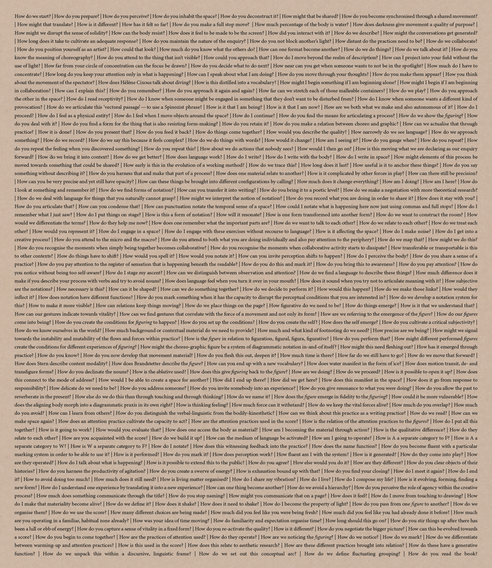 This exposition forms part of a chapter entitled ‘Choreo-graphic Writing – Towards More-Than-One Means of Inscription’ by Emma Cocker, Nikolaus Gansterer and Mariella Greil, published in Leena Rouhiainen, Kirsi Heimonen, Rebecca Hilton and Chrysa Parkinson (eds.), Writing Choreography: Extending the Conventions of Dance (Routledge, 2023). Abstract for the chapter: Choreo-graphic Figures - Deviations from the Line is an artistic research project by writer-artist Emma Cocker, artist-performer Nikolaus Gansterer and dancer-choreographer Mariella Greil, for exploring those modes of thinking-feeling-knowing emerging between the lines of choreography, drawing and writing. This research project involved the cultivation of various modes of “choreo-graphic writing” [more-than-one / means of inscription] at the interstice of choreography, drawing and writing, the evolution of experimental language practices as artistic research. Drawing on various “practices” and “figures” developed within Choreo-graphic Figures, Cocker, Gansterer and Greil explore how different performative, sensuous and experimental textual practices and bodily inscriptions emerge as immanent means of articulation for that which remains strictly beyond words: the embodied, relational, affective and material sensitivities and sensibilities of collaborative, co-emergent sense-making taking place in and through the interaction between bodies, between human and non-human agencies. The chapter comprises two parts: PART I — an “exposition” (encountered here) showing how Cocker, Gansterer and Greil performed choreography/writing beyond the page within the context of Choreo-graphic Figures presented online using the Research Catalogue (RC), an online platform for publishing artistic research; PART II — an “essay” (within the printed publication, Writing Choreography: Extending the Conventions of Dance (Routledge, 2023) for exploring the different resonances of and implications for these various approaches to choreo-graphic writing. The exposition is designed in dialogue with Simona Koch.