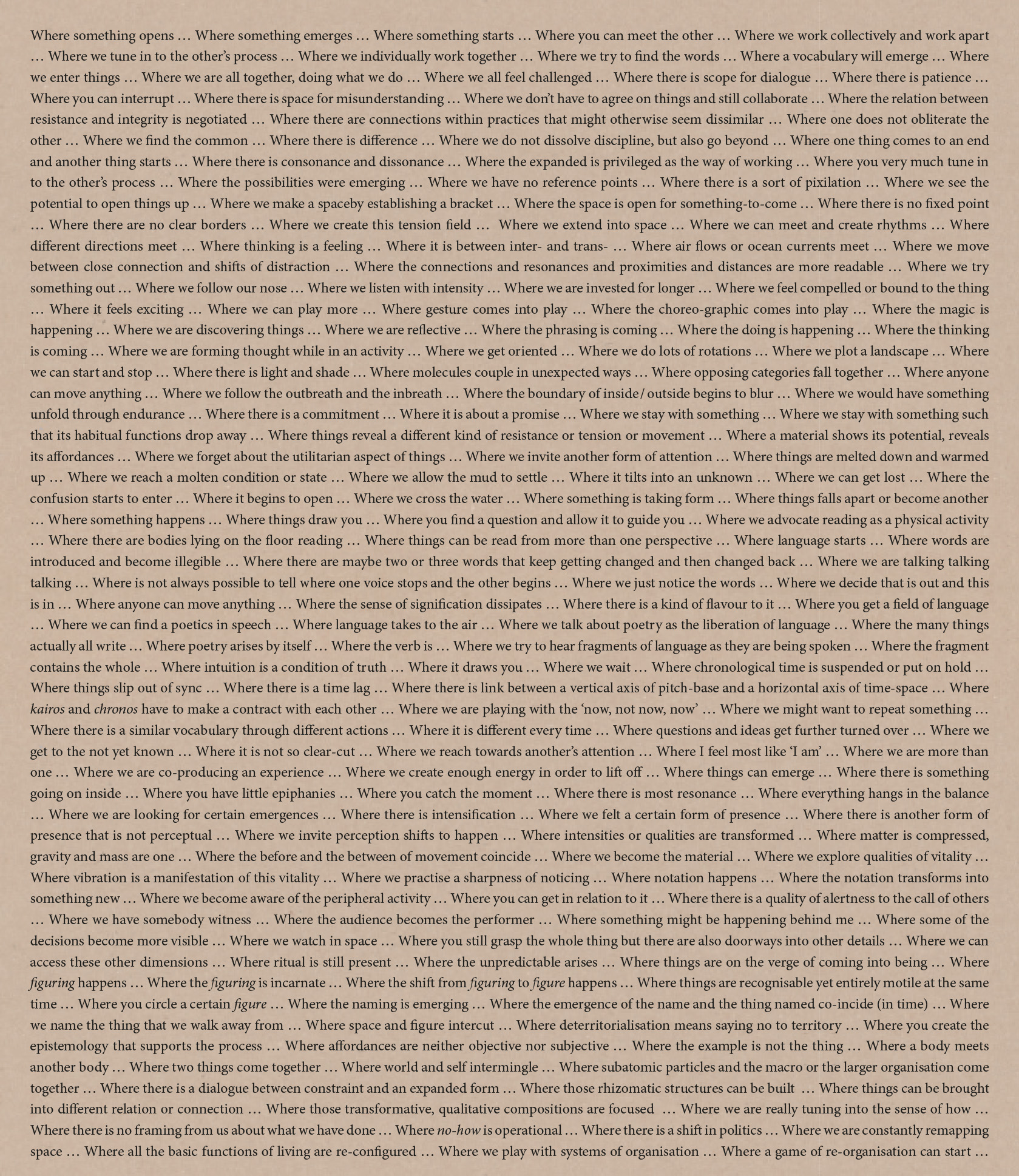 This exposition forms part of a chapter entitled ‘Choreo-graphic Writing – Towards More-Than-One Means of Inscription’ by Emma Cocker, Nikolaus Gansterer and Mariella Greil, published in Leena Rouhiainen, Kirsi Heimonen, Rebecca Hilton and Chrysa Parkinson (eds.), Writing Choreography: Extending the Conventions of Dance (Routledge, 2023). Abstract for the chapter: Choreo-graphic Figures - Deviations from the Line is an artistic research project by writer-artist Emma Cocker, artist-performer Nikolaus Gansterer and dancer-choreographer Mariella Greil, for exploring those modes of thinking-feeling-knowing emerging between the lines of choreography, drawing and writing. This research project involved the cultivation of various modes of “choreo-graphic writing” [more-than-one / means of inscription] at the interstice of choreography, drawing and writing, the evolution of experimental language practices as artistic research. Drawing on various “practices” and “figures” developed within Choreo-graphic Figures, Cocker, Gansterer and Greil explore how different performative, sensuous and experimental textual practices and bodily inscriptions emerge as immanent means of articulation for that which remains strictly beyond words: the embodied, relational, affective and material sensitivities and sensibilities of collaborative, co-emergent sense-making taking place in and through the interaction between bodies, between human and non-human agencies. The chapter comprises two parts: PART I — an “exposition” (encountered here) showing how Cocker, Gansterer and Greil performed choreography/writing beyond the page within the context of Choreo-graphic Figures presented online using the Research Catalogue (RC), an online platform for publishing artistic research; PART II — an “essay” (within the printed publication, Writing Choreography: Extending the Conventions of Dance (Routledge, 2023) for exploring the different resonances of and implications for these various approaches to choreo-graphic writing. The exposition is designed in dialogue with Simona Koch.