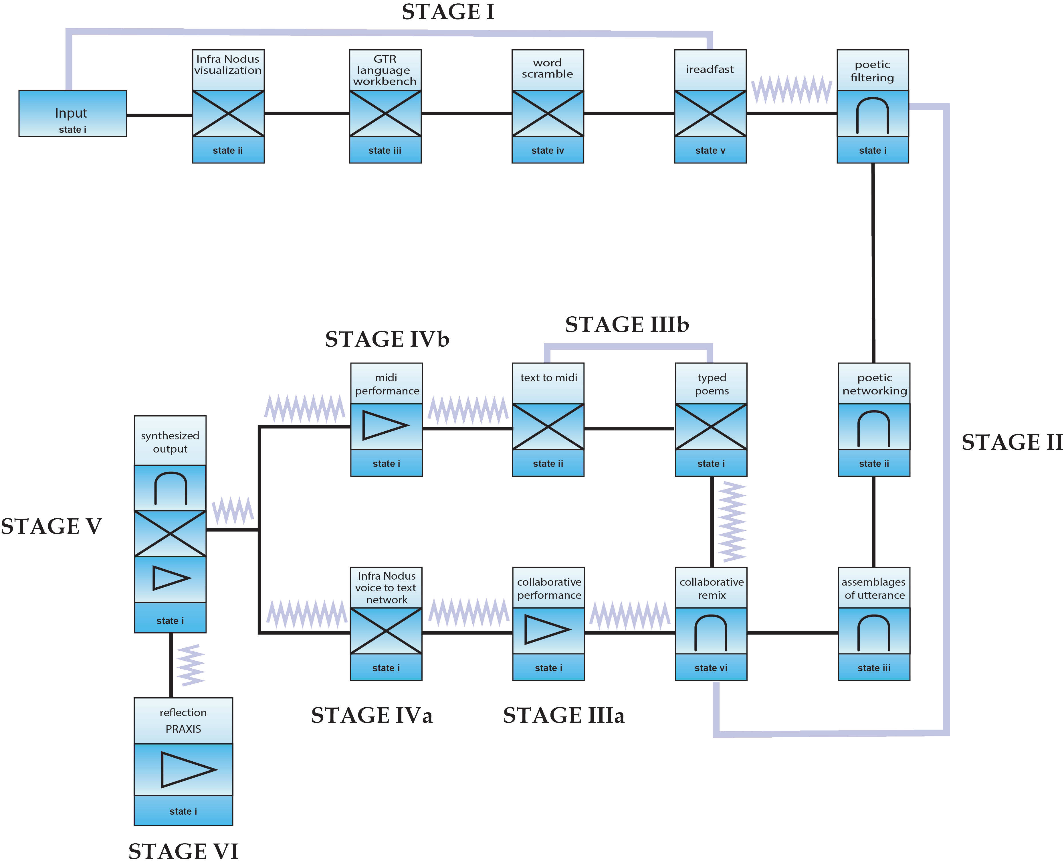 To continue confounding static representation, we took the words of our original composition and entered them into recombinant format called a Stir-Fry text, authored by poet/programmer Jim Andrews. In this hyperscript, the reader’s cursor triggers the replacement of one selection of text with another. This seemed like the perfect solution for nonlinear and non-hierarchical text compositions, providing a nuanced assemblage of text fragments that vary for each reader depending on their individual interactions with the text, adding a “liveness” to the reading reflecting the synchronous simultaneity of its composition. Naturally, this became another chapter of Skunk tales, one in which the individuality of the reader becomes a compositional agent in the recounting of the tale. This exposition of Skunk Tales is an attempt to gather together our various lines of flight into one representational space.
