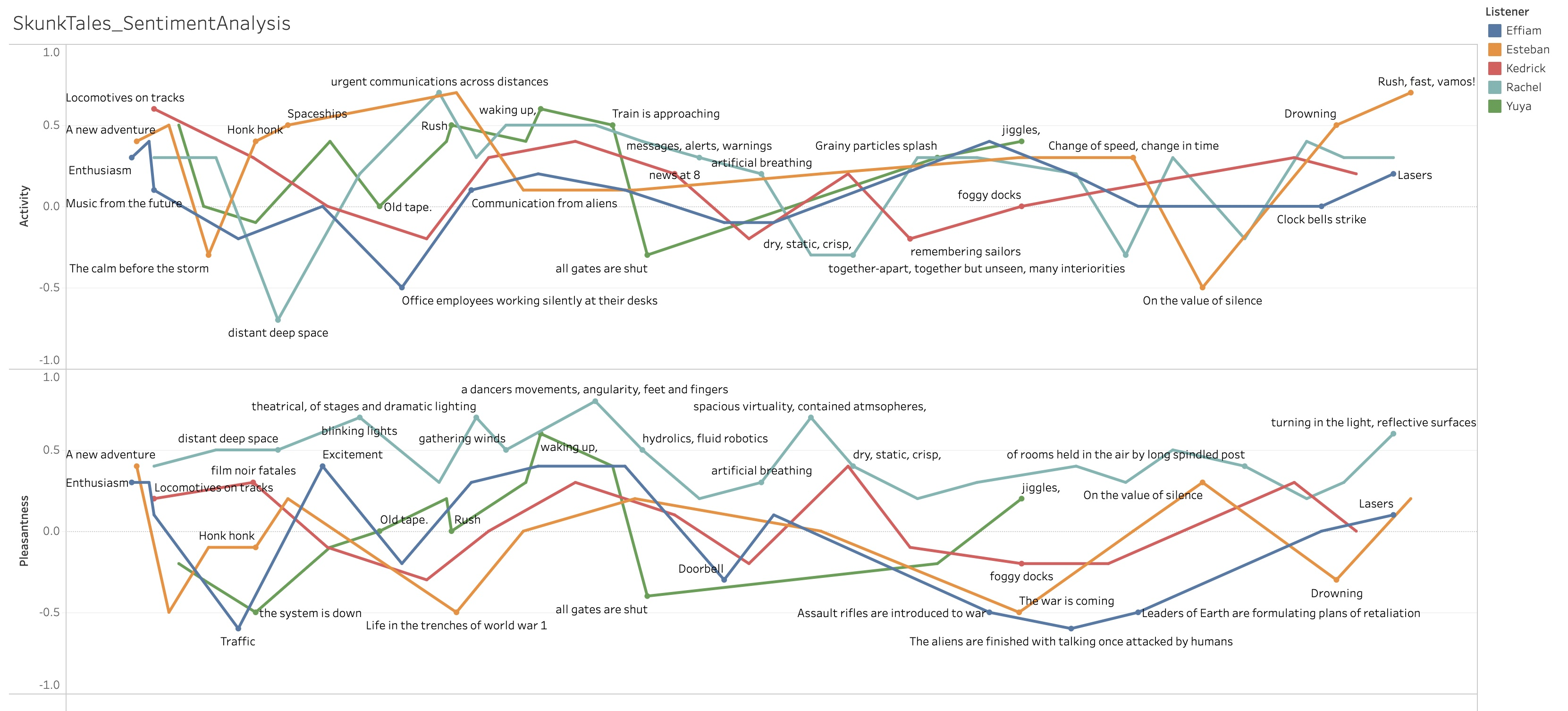 We each listened to the collective sonification and responded freely using poetic imagery. We then ranked our poetic responses on two scales: Activity (extremely active = +1, extremely inactive = -1) and Pleasantness (extremely pleasant = +1, extremely unpleasant = -1)