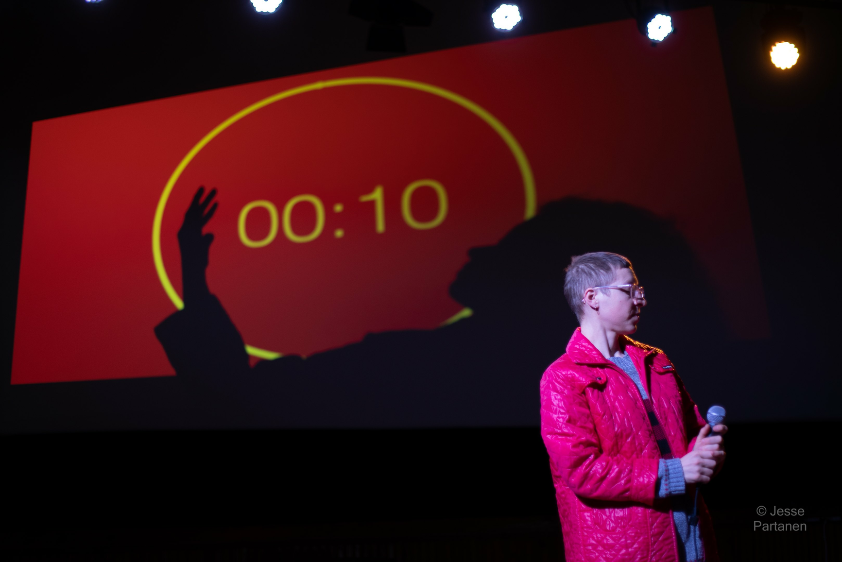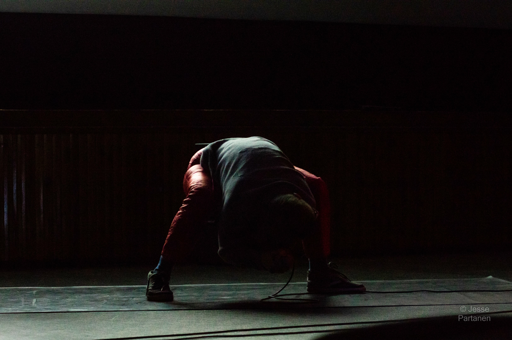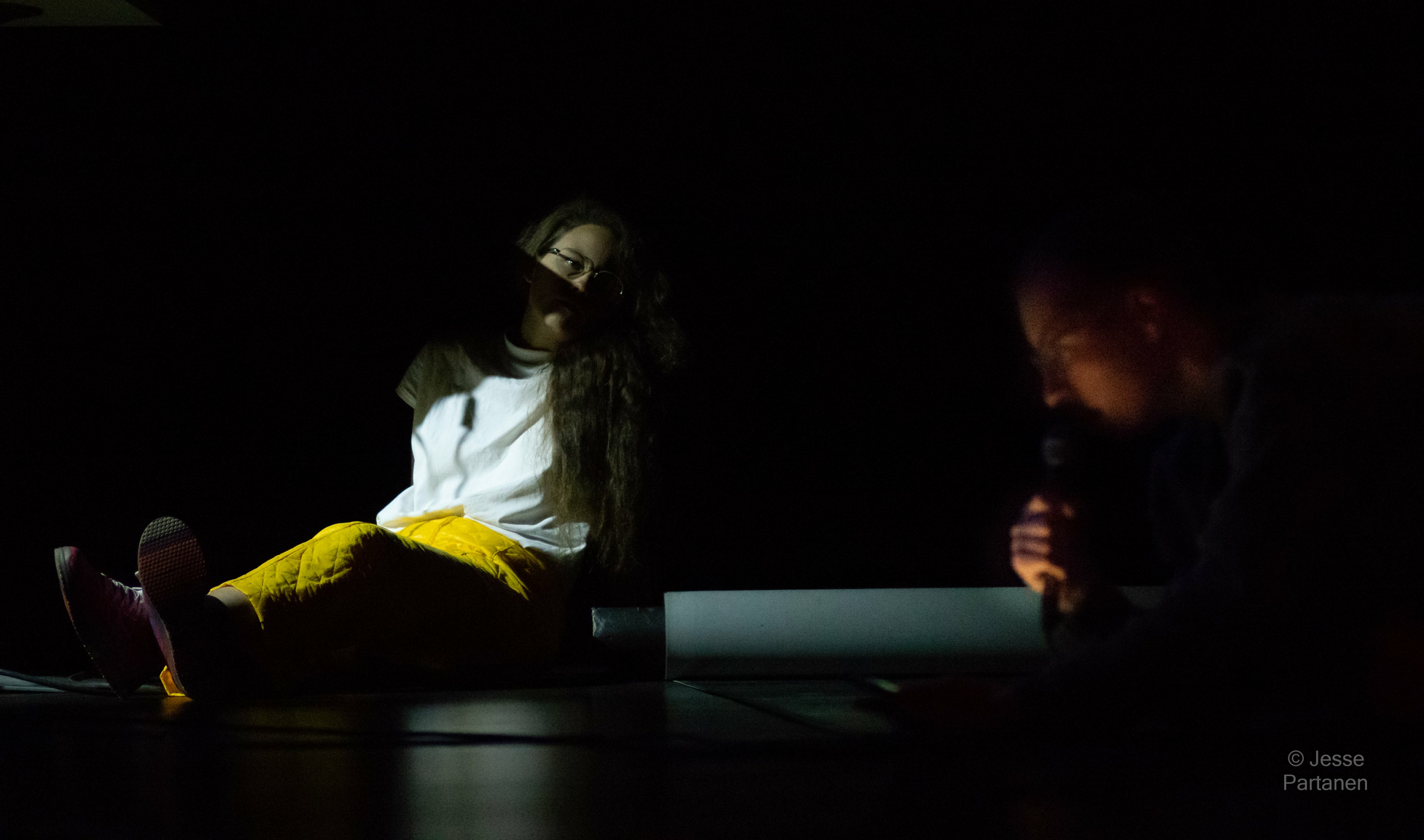 One of the Artists: We had slightly different versions of the same story, the details of the stories were documented in our notebooks and will be attached as separate documents. We reserved one hour for the actual event and we got to Kino Marita about one hour in advance. First, One of the Artists suggested a practice where we rolled on the floor of the stage and told parts of the story in Finnish, Russian and English, speaking on top of each other sometimes, yawning, not paying attention to the linearity of the narrative.