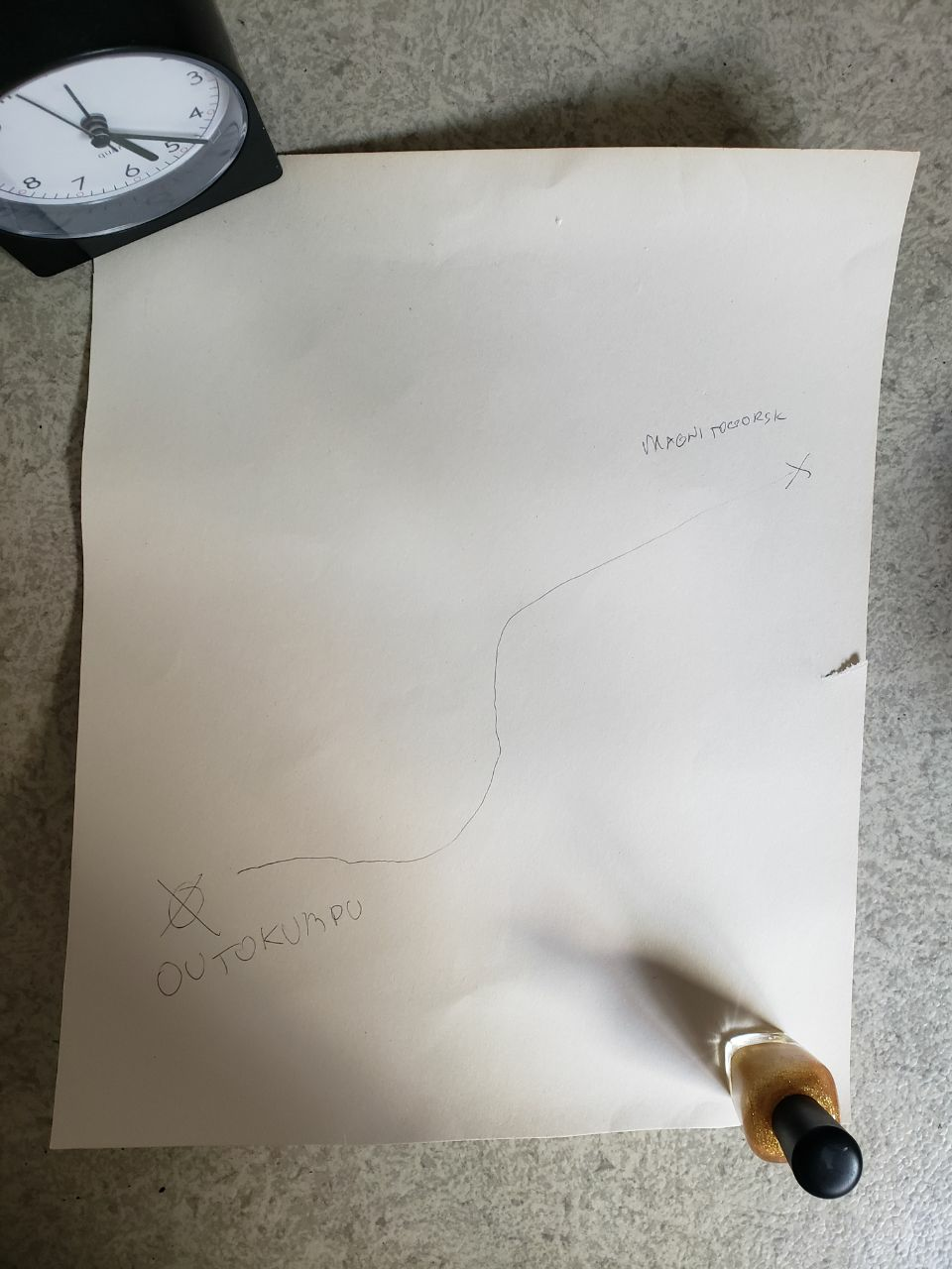 One of the Artists: We took the poster and the papers. We wanted the town people to draw a fictional (or imaginary) pathway from Outokumpu to Magnitogorsk after we told them our fictional story.