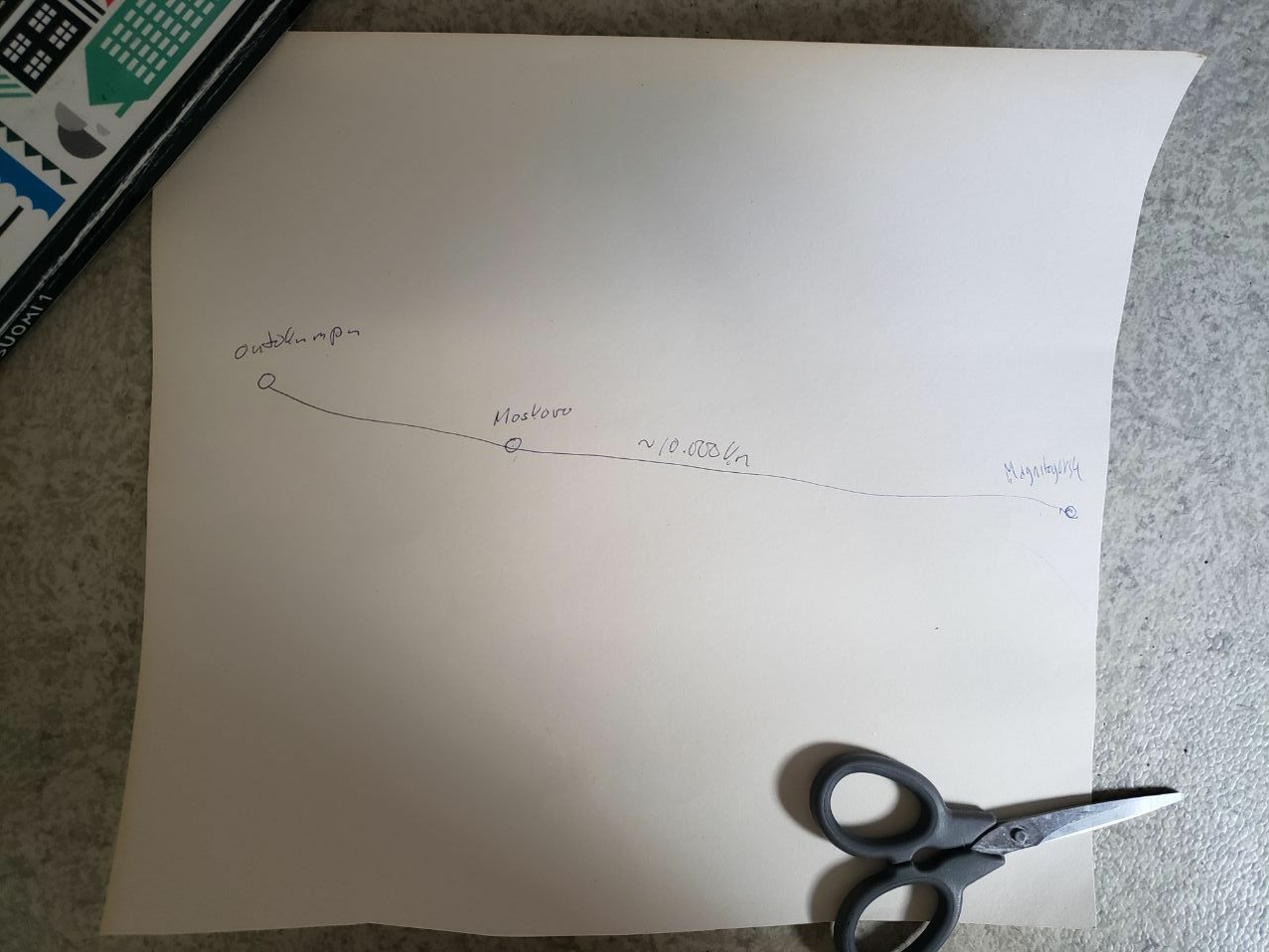 One of the Artists suggested that we would still walk up the hill further toward the mine. We did that. On the way we discussed that, it is likely that we looked like political or environmental activists, with the hand-made large poster, or maybe having Russian written there, made people more cautious. We met a group of dance students who we met a few days before. They were also in a hurry but we were able to ask for a few minutes from them. We split the group in two: One of the Artists spoke in Finnish and One of the Artists did in English. One of the Artists told a story about their grandpa who was injured and then started the group of workers who found intimate touch with industrial machines. Interestingly, the students nodded and when One of the Artists asked one if they heard anything about this, they said that they thought so. In the end we asked them to draw the schematic map of the Outokumpu - Magnitogorsk connection. They asked why, and we explained that we collected the documentation of the story that we told.