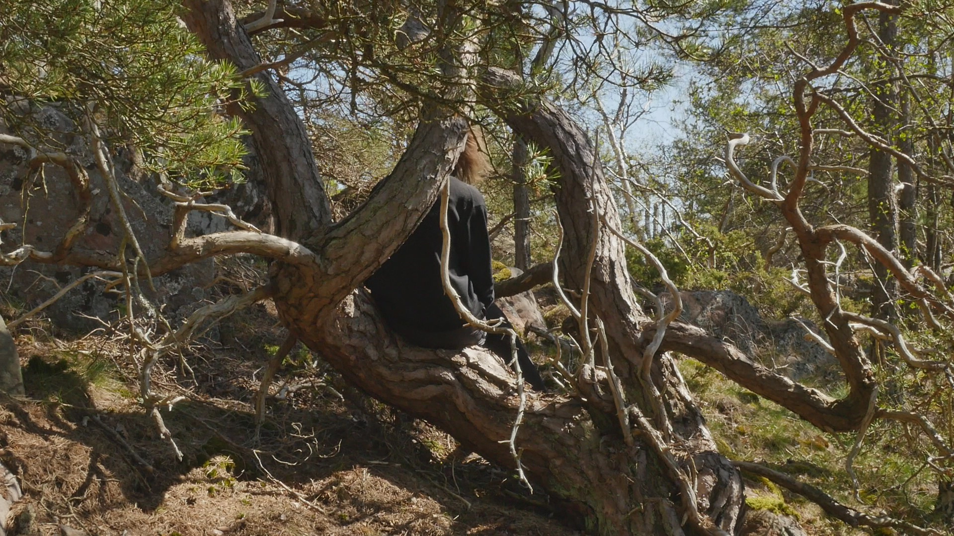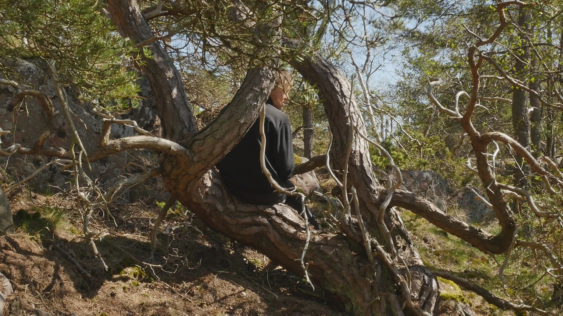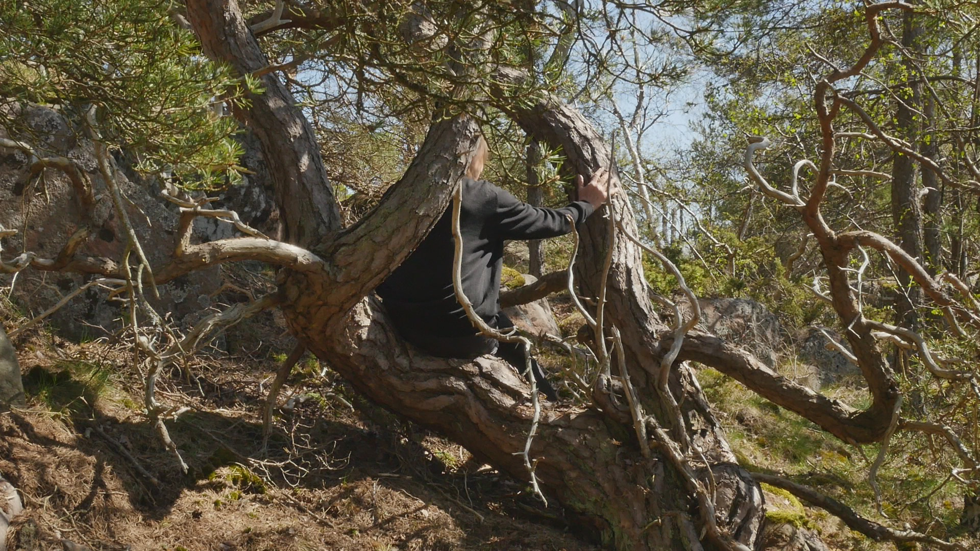 Kära tall, martall or Dear pine. Thank you for allowing me to sit on your trunk or one of your branches. I'm not really sure if I should address you as you, one pine, or as you, many pines growing from the same root but in English that doesn't make much difference, I guess. I thought I would ask you or talk to you about lichen because many of the pines on Örö Island do have beautiful lichen living on their trunks. But funny enough you don't have that many; there are some pale gray, greenish gray but rather small compared to some of the other ones. So maybe you don't, they don't bother you, I guess or and maybe lichen don't bother pines in general. But there is something fascinating about lichen as life forms because they are like collaborative endeavours by algae and fungi, several independent creatures that have started to collaborate and then they're very tough and hardy. Some can survive in very harsh circumstances. Why I thought about lichen was because the first time I was on this island in November 2020 I was collecting lichen, no not collecting them but photographing lichen every day. And I remember I was impressed by some of the interesting lichen that I could find on the trees here. But now when I think of it not all of them were pines, of course. And I guess what is needed is a humidity, like damp circumstances for the lichen to really stand out on the bark. Actually now in May, when it's fairly dry here I notice more of the lichen that grow on the cliffs, on the rocks. And they're quite big, like the type of lichen that reindeer eat and so on, which is not at all the same as the stains, colourful stains that sometimes grow on your bark. Instead of lichen I can see plenty of ants climbing around. And that's of course an other life form that seems to enjoy the circumstances that you provide. Not that I really know why ants climb on your bark, what kind of food do they find on your surface? Or do they create nests in the crevices in your bark? There are of course, insects that can be harmful to you, but I don't think ants will do you any harm. Your lower branches look rather dry. And I wonder if it's just because you're old, because you're not any youngster that I can see. Or is it because you don't have enough humidity here because you're quite high up on the hill. High up is not maybe the right expression, because the hills are not high, but high in the sense of in the part of the hill where there is not that much soil but where the bedrock is near the surface. Only less than a 100 meters from here, there are like small valleys with lots of soil even resembling swamps because the water gathers there. Today it's rather quiet, so I cannot hear the wind. We're not that close to the sea, but there is a mist coming in from the sea. And your branches are barely moving, so the wind is very soft. Usually the wind on Örö is very strong. When I look at your trunk very closely, I can see something that could be lichen, but that is very small, so it might be that there are different types of them. I'm not sure but I think I remember I read somewhere that actually the part of you that is living or like, well, living tissue is quite a thin layer under the bark, and on top of the wooden trunk. So most of your trunk is actually dead material or like remains of former living cells. I don't know if this is true, but that makes of course your relationship to your bark quite different. Or maybe like human hair. So if there would be an ant climbing on my head, near or on my skin on my head, I would surely sense it and wouldn't like it probably. But if there would be an ant crawling around in my hair, I wouldn't maybe notice it immediately. Unless it was big enough to somehow be felt by distance. Well, strange to look at such analogies with humans. I have to accept that I really cannot understand how it feels to have a bark like yours or to have several trunks like you have or to have lichen growing on your skin. Although of course, human skin has a lot of life forms, some sort of bacteria or even fungi living both inside and also on the skin. Yeah, probably the idea of addressing you as, whether you as a group of trunks from the same root or as one tree with several branches like a family, is a mistake. And I should try to see you or all of you more as a system, a systemic part, engaging in collaborations of various kinds, and on different levels, beginning from the molecular level, and cellular and then different types of life forms and... It is difficult because we're so accustomed as humans to consider ourselves as persons and individuals and somehow separate from our environment, that it's so easy to expand that sort of thinking to other creatures like trees. So, if I would think of you as a city instead, that might be more correct. But on the other hand, I have to stick to the species specific behaviour that is given to me. That is the way that I'm programmed to think and react and sense and so on. Funny to think of being programmed but of course, we are also genetically programmed, you are and I am, although, at least humans tend to pride themselves that they are adaptable and they can learn new things and that's why they've survived and covered the earth so to speak. But sure you pines are adaptable, too. When I look at the different pines on this small island, and how different the circumstances they are living in, some on very dry soil and some in damp places, some like solitary on a cliff and completely helpless against the wind and the storms and some in thickets of small pines growing next to each other and then tall, twisted, huge, weird, contorted pines. Well, sorry for saying that but you are a small, weird and contorted pine, your trunk is divided in several and the part or the branch that I'm sitting in is bent in a very strange way, but a way that is very comfortable for me to sit on. Well, I don't know what else to say except thank you for listening to me today. And thank yo