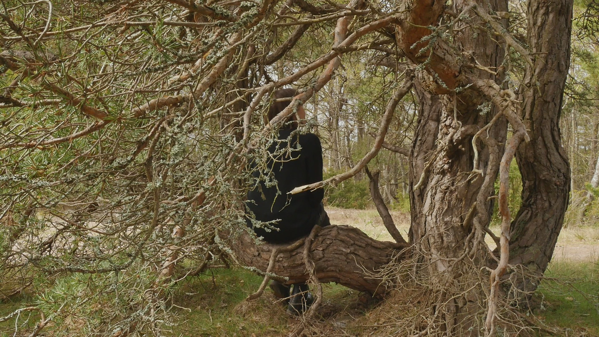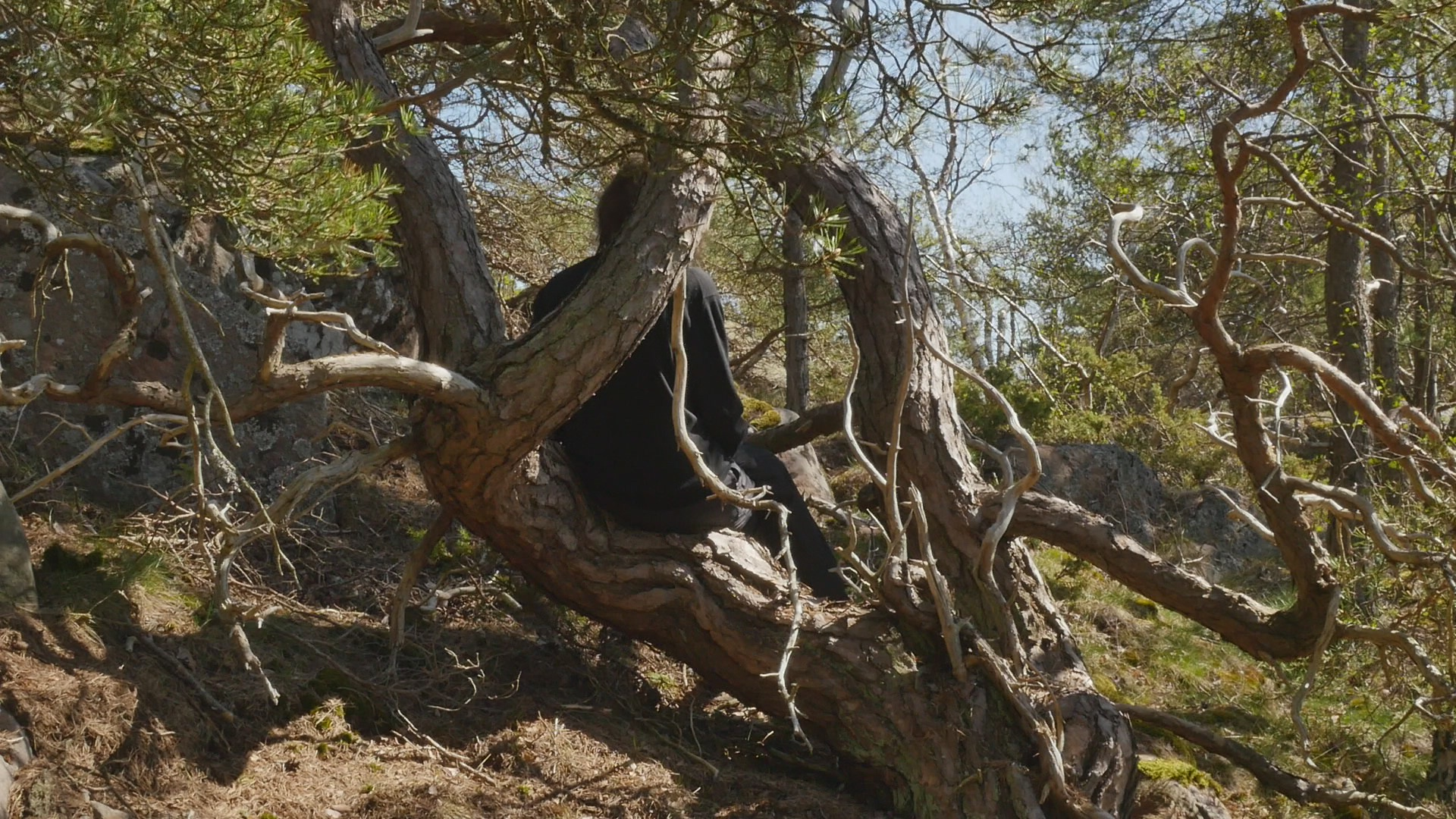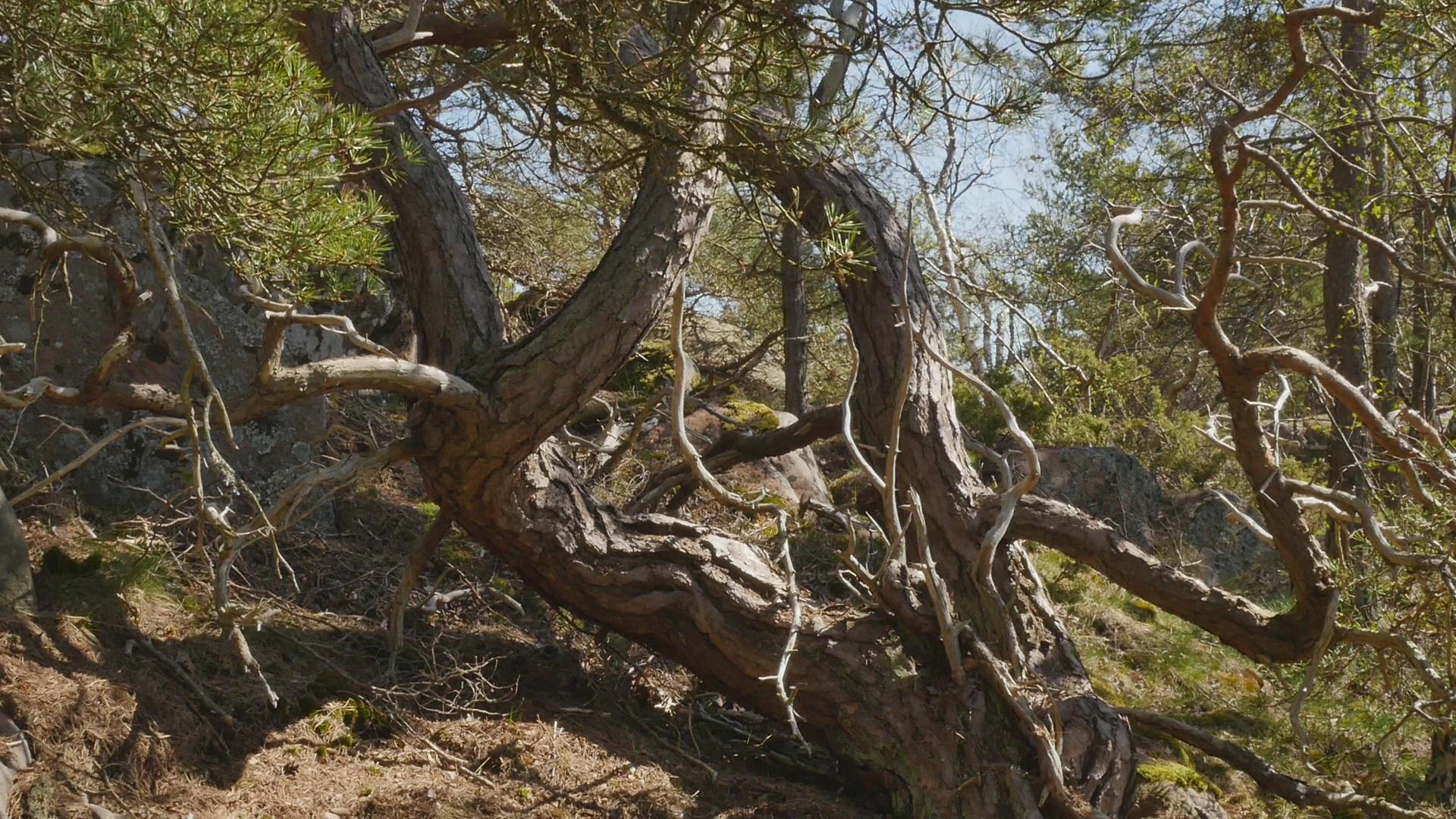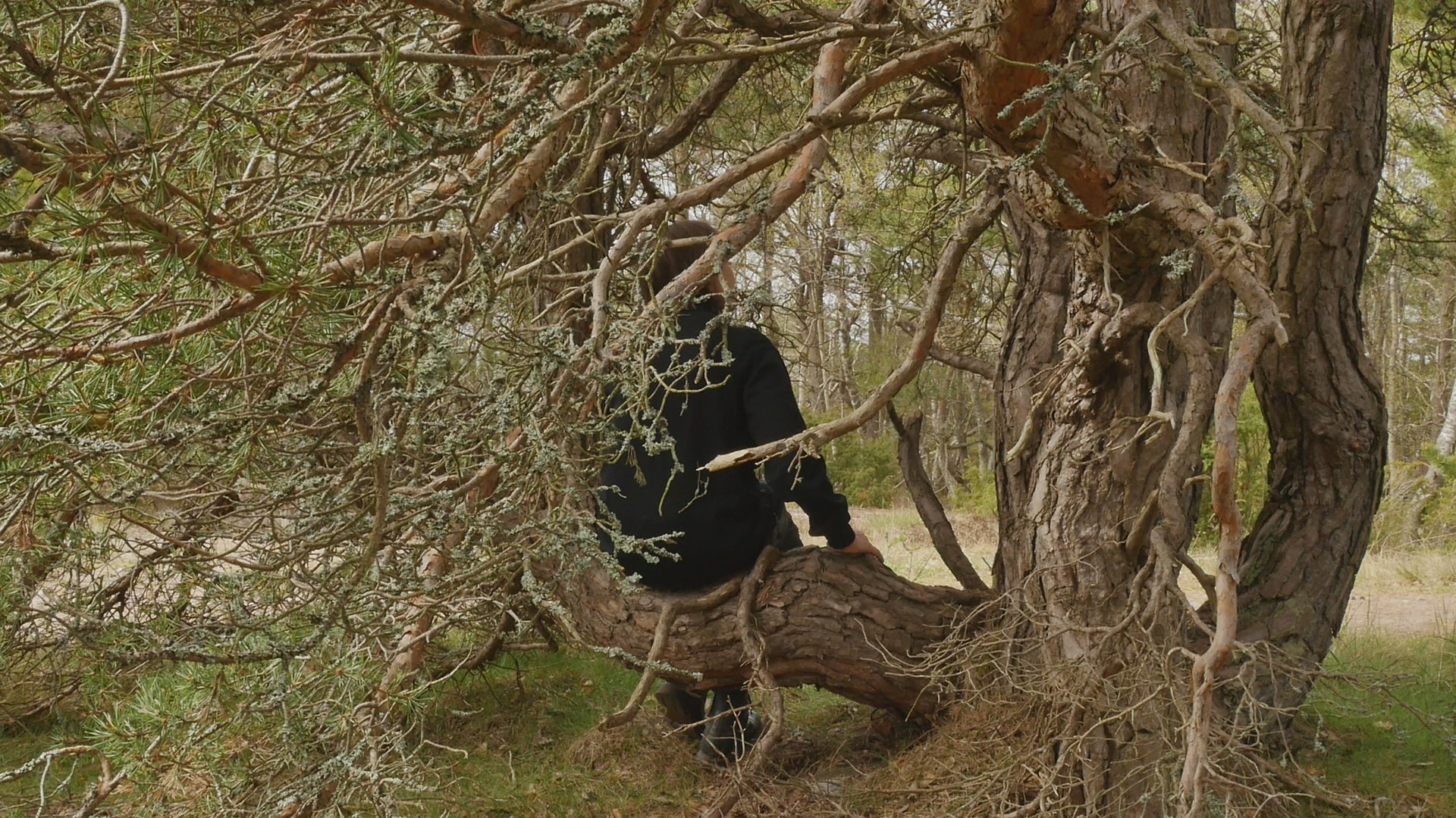 Kära tall, martall or Dear pine. Thank you for allowing me to sit on your trunk or one of your branches. I'm not really sure if I should address you as you, one pine, or as you, many pines growing from the same root but in English that doesn't make much difference, I guess. I thought I would ask you or talk to you about lichen because many of the pines on Örö Island do have beautiful lichen living on their trunks. But funny enough you don't have that many; there are some pale gray, greenish gray but rather small compared to some of the other ones. So maybe you don't, they don't bother you, I guess or and maybe lichen don't bother pines in general. But there is something fascinating about lichen as life forms because they are like collaborative endeavours by algae and fungi, several independent creatures that have started to collaborate and then they're very tough and hardy. Some can survive in very harsh circumstances. Why I thought about lichen was because the first time I was on this island in November 2020 I was collecting lichen, no not collecting them but photographing lichen every day. And I remember I was impressed by some of the interesting lichen that I could find on the trees here. But now when I think of it not all of them were pines, of course. And I guess what is needed is a humidity, like damp circumstances for the lichen to really stand out on the bark. Actually now in May, when it's fairly dry here I notice more of the lichen that grow on the cliffs, on the rocks. And they're quite big, like the type of lichen that reindeer eat and so on, which is not at all the same as the stains, colourful stains that sometimes grow on your bark. Instead of lichen I can see plenty of ants climbing around. And that's of course an other life form that seems to enjoy the circumstances that you provide. Not that I really know why ants climb on your bark, what kind of food do they find on your surface? Or do they create nests in the crevices in your bark? There are of course, insects that can be harmful to you, but I don't think ants will do you any harm. Your lower branches look rather dry. And I wonder if it's just because you're old, because you're not any youngster that I can see. Or is it because you don't have enough humidity here because you're quite high up on the hill. High up is not maybe the right expression, because the hills are not high, but high in the sense of in the part of the hill where there is not that much soil but where the bedrock is near the surface. Only less than a 100 meters from here, there are like small valleys with lots of soil even resembling swamps because the water gathers there. Today it's rather quiet, so I cannot hear the wind. We're not that close to the sea, but there is a mist coming in from the sea. And your branches are barely moving, so the wind is very soft. Usually the wind on Örö is very strong. When I look at your trunk very closely, I can see something that could be lichen, but that is very small, so it might be that there are different types of them. I'm not sure but I think I remember I read somewhere that actually the part of you that is living or like, well, living tissue is quite a thin layer under the bark, and on top of the wooden trunk. So most of your trunk is actually dead material or like remains of former living cells. I don't know if this is true, but that makes of course your relationship to your bark quite different. Or maybe like human hair. So if there would be an ant climbing on my head, near or on my skin on my head, I would surely sense it and wouldn't like it probably. But if there would be an ant crawling around in my hair, I wouldn't maybe notice it immediately. Unless it was big enough to somehow be felt by distance. Well, strange to look at such analogies with humans. I have to accept that I really cannot understand how it feels to have a bark like yours or to have several trunks like you have or to have lichen growing on your skin. Although of course, human skin has a lot of life forms, some sort of bacteria or even fungi living both inside and also on the skin. Yeah, probably the idea of addressing you as, whether you as a group of trunks from the same root or as one tree with several branches like a family, is a mistake. And I should try to see you or all of you more as a system, a systemic part, engaging in collaborations of various kinds, and on different levels, beginning from the molecular level, and cellular and then different types of life forms and... It is difficult because we're so accustomed as humans to consider ourselves as persons and individuals and somehow separate from our environment, that it's so easy to expand that sort of thinking to other creatures like trees. So, if I would think of you as a city instead, that might be more correct. But on the other hand, I have to stick to the species specific behaviour that is given to me. That is the way that I'm programmed to think and react and sense and so on. Funny to think of being programmed but of course, we are also genetically programmed, you are and I am, although, at least humans tend to pride themselves that they are adaptable and they can learn new things and that's why they've survived and covered the earth so to speak. But sure you pines are adaptable, too. When I look at the different pines on this small island, and how different the circumstances they are living in, some on very dry soil and some in damp places, some like solitary on a cliff and completely helpless against the wind and the storms and some in thickets of small pines growing next to each other and then tall, twisted, huge, weird, contorted pines. Well, sorry for saying that but you are a small, weird and contorted pine, your trunk is divided in several and the part or the branch that I'm sitting in is bent in a very strange way, but a way that is very comfortable for me to sit on. Well, I don't know what else to say except thank you for listening to me today. And thank yo