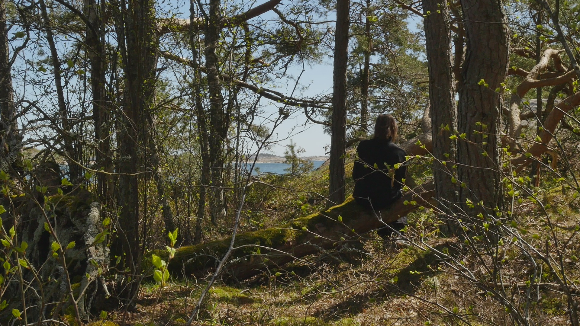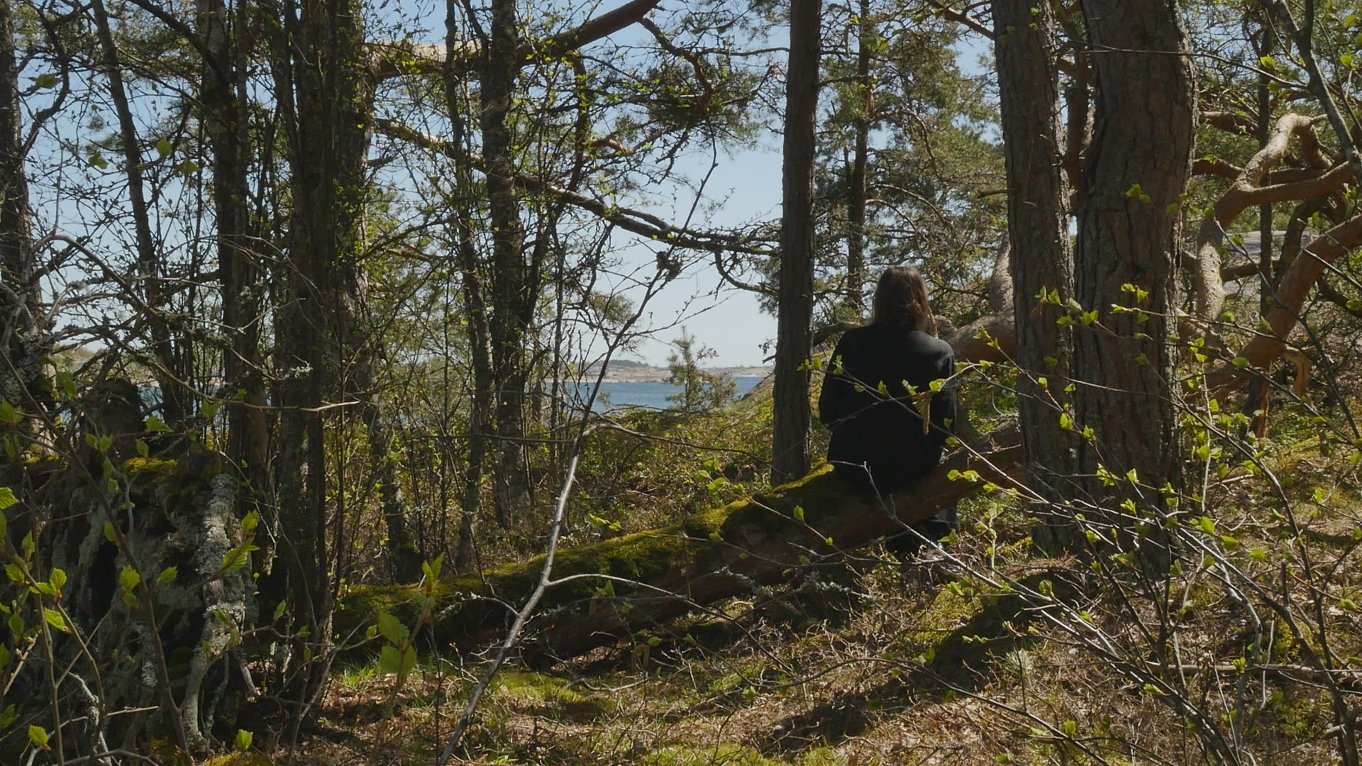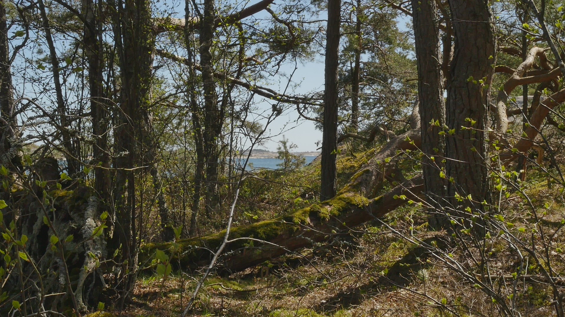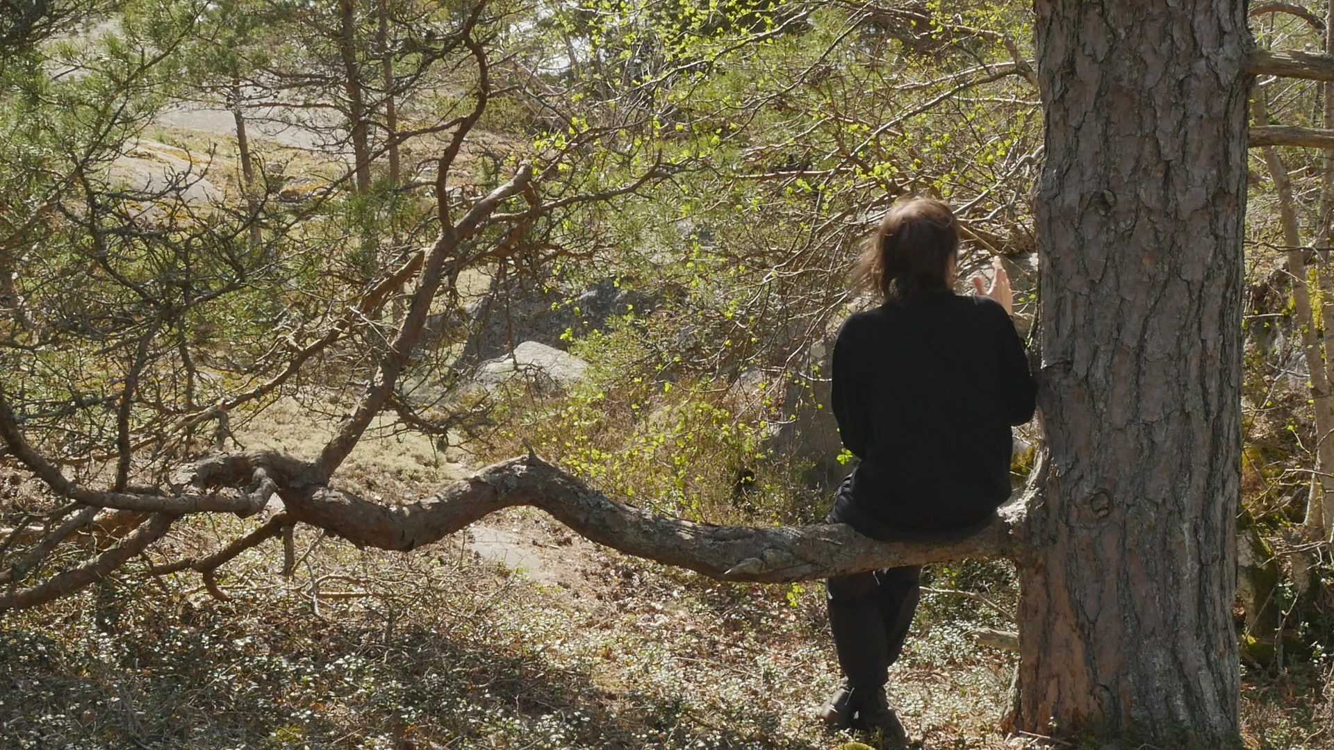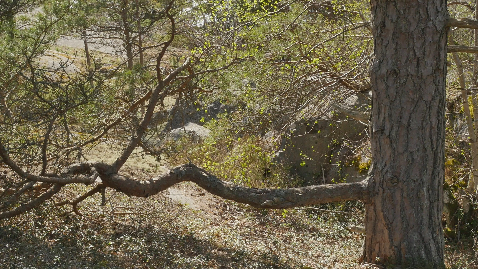 Kära tall eller kära fura. Or actually I should say dear pine. I want to address you in English although it might be more natural to speak Swedish with you, but since it's not so natural to talk to you anyway, I might as well speak English. It's funny, I've never seen you before, although I've visited this island of Örö several times and walked around a lot and I've also been looking for pines with branches I could sit on. But I've usually followed the shoreline or then the marked paths and you're growing here, sort of a little bit inland, although here I can see the sea through the shrubs now when they don't have big leaves. Actually, I haven't been on this island in May before, so maybe I haven't seen you because you're covered up by the forest normally. Or then maybe you felt like you wanted to have somebody to sit on your lap today and invited me. Who knows. Or, there might have been somebody here before me, because it looked like almost a path leading up to you here. I wonder if you find this sunshine and this mild wind as pleasant and enjoyable as I do. I suppose you enjoy the light and the warmth but especially the light because that means energy for you. I've come to the island now only for a few days. And I thought I would like to make acquaintance with one pine every day. And first I thought I would go and visit one beautiful little pine on the shore on the western shore that I used to talk Swedish with last year, every time when I visited the island. And I only wanted to take a walk and look around and somehow sense how the island was now in this time of year. And then on the way back from the southern tip I just felt like I should come and follow the path and then I saw you. I have nothing special to discuss with you today. And it's maybe not so nice to intrude and come and disturb you. But I trust my sense of invitation. And it's so fun that you have this one big branch, which really looks like created for humans to sit on. Because you're growing more inland, you're not bent and twisted like many of the pines on the shore. On the contrary, you're very handsome, tall, and quite thick, so you must be ancient. You've met the Russians when they were here, probably. And then the Finnish Army and now all the tourists. And you have a great good luck in living in a national park now. So there is a great likelihood that you can live your life to the full. I know the forest department is reducing some of the pines by the shore, strangling them so to speak, letting them die slowly by taking away the bark around the trunk, but in order to maintain the landscape more open, which it has been. Because, dear pine, you're really a very strong and in some sense invasive species. Of course, you're not an invasive species here. This is your home. Except that when the land was rising, there were of course no forests on the islands to begin with. But now, you're not coming from abroad. You're .. Well, yeah, that's a good question. Everybody has come from abroad at some point, because earlier, there was only ice here. But anyway, it tends to be that when you grow, you proliferate in such amounts, that you prevent other species from surviving, especially those plants that need more open vistas and more sun. But of course, you're very resilient, as they say nowadays, because you can survive in quite harsh circumstances, not only the wind and the cold here, but the soil which is not... There is not much soil, on the cliffs, on the rocks and on the shore. Except that you produce a soil of sorts, of course, through your needles and pine cones when they fall to the ground. Well, I'm talking sort of nonsense with you or something that is trivial knowledge for humans. And for you even more trivial because it's knowledge of pines from a human perspective. But how could I sensitise myself to be able to listen to you, to take in your perspective? Well, that's a task. If I listen, I don't hear you. I hear the sea, the wind and the sea; sometimes when the wind is strong I can hear the wind in the pines too, but not now. I wonder if you can hear the sea as well. Some plants clearly can hear, so why not? It would be quite amazing if you could hear my speech, not necessarily understand what I'm saying, but if you could hear my voice. And if you could sense that I'm wishing you well, that I'm not trying to hurt you. And I'm not going to eat your bark or dig small holes into your wood, that then make it difficult for you to thrive. Although in Finland, people used to make bread, when there were bad years, when the crop was freezing, there was like, there is a part of your bark, or between your wood and your bark, there is a part that can be collected and dried and made into a flour of sorts and added to wheat or rye, or oats or barley, like half and half or something like that. I've never tasted that kind of bread. And they also say that it's not very good for you. It's really like, that it makes you sick, or then you have to prepare it in the right way. But it helped people to survive when, or at least they tried to survive by that means if there were hunger years. Well, if you're privileged in living in this national park, opposed to most of your relatives in Finland, which are living on plantations, and will be cut down before they reach old age, I must say I'm privileged too, to live in this time, when there is such abundance in this country. Right now, it doesn't feel like a privilege because there is war in Europe, and a lot of discussions about military alliances and nuclear weapons and horrible not suicidal but 'omnicidal' weapons as somebody called them. But still compared to ancient times when there was always war, but there was also famine. And now there is no famine. Even if the price of energy goes up, and we have to learn to live in a different way, there is nothing compared to the struggles before. Well, but that's again from a human perspective. Sorry for bothering you with my chatting, but I re
