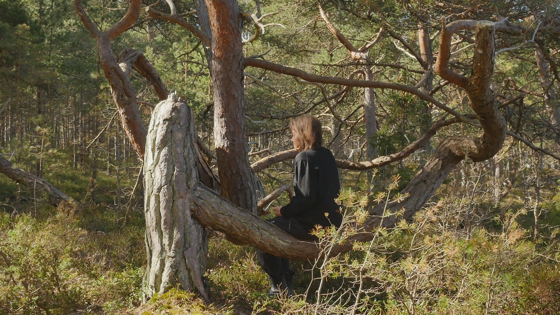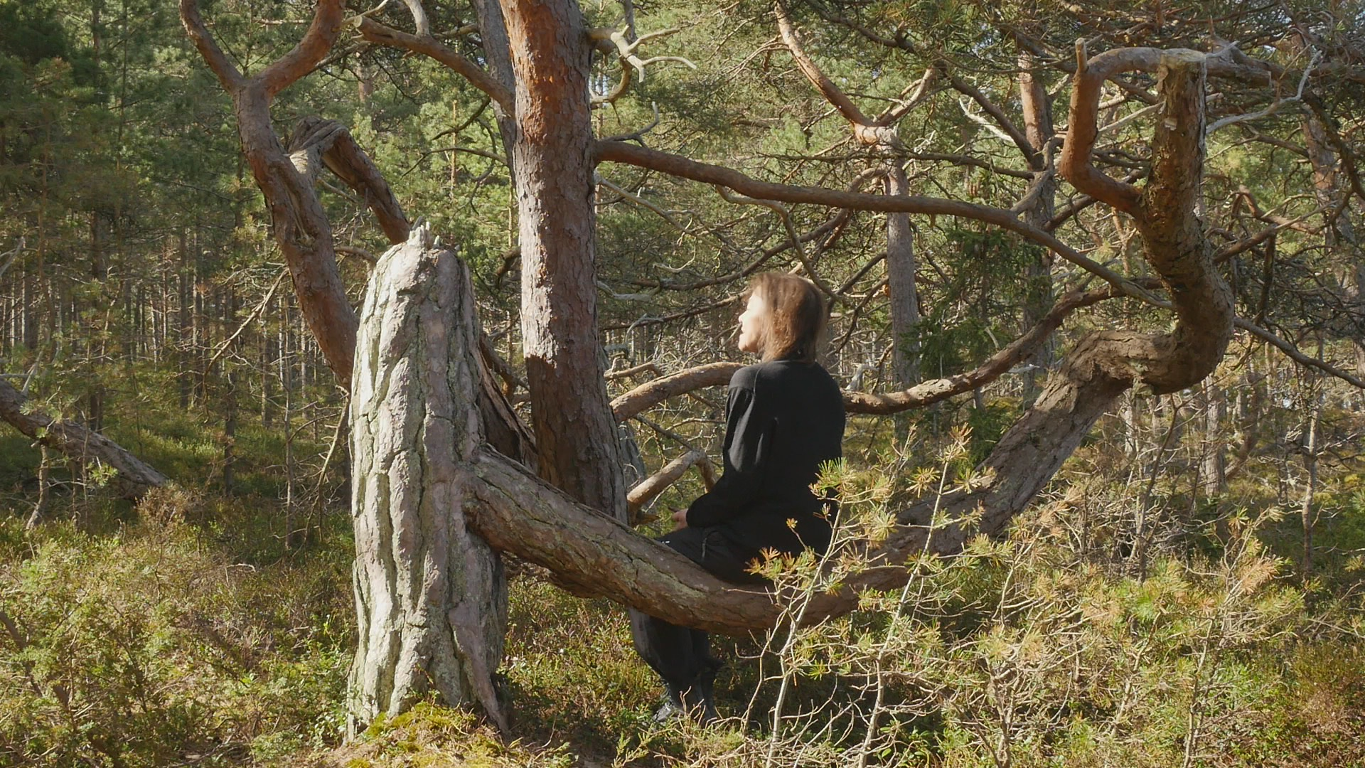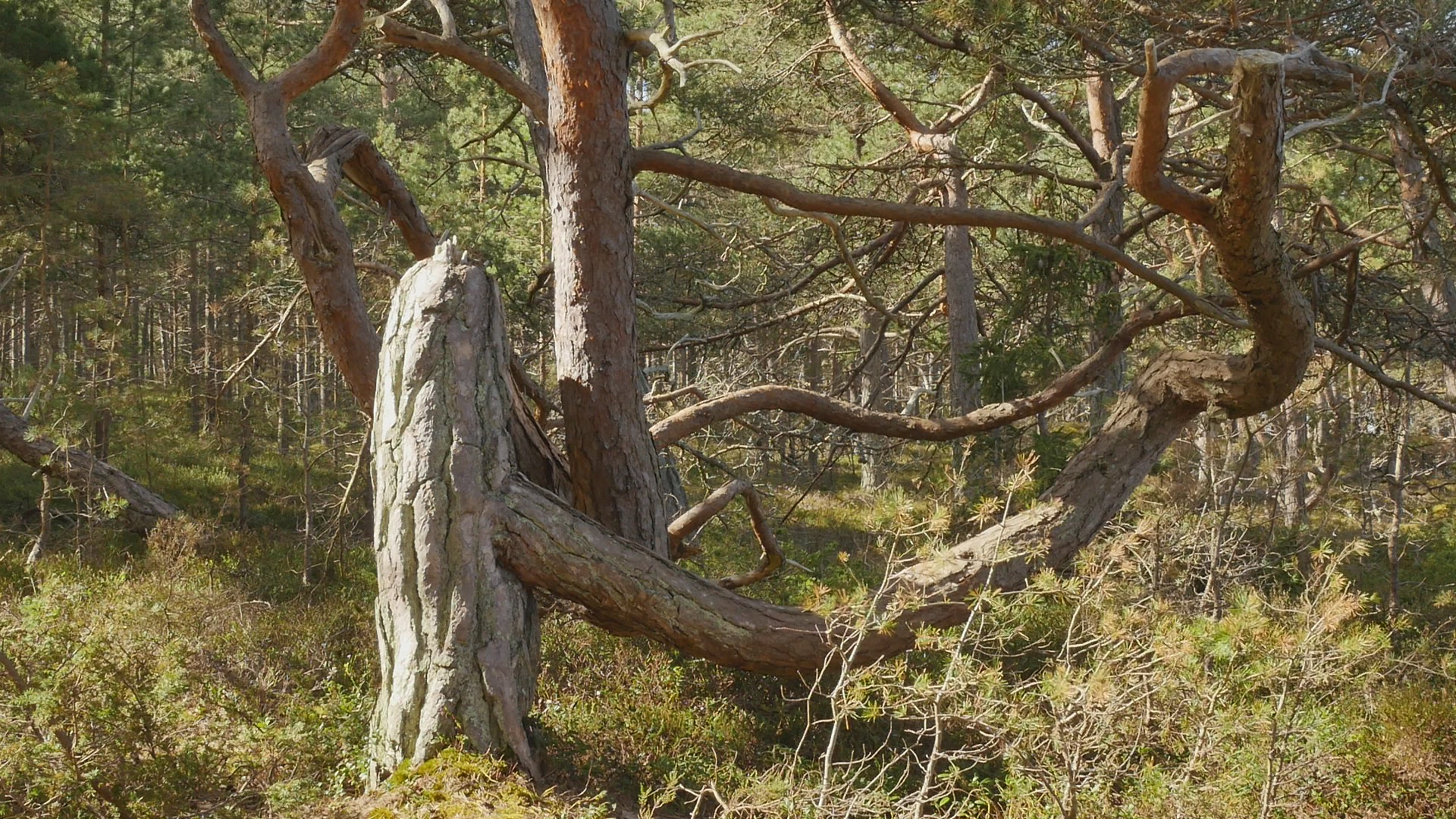 Hello, pine, or good morning. Although you're growing here on the western shore, the sun reaches you beautifully and me sitting on you from the east because of the opening in the forest. I came to you early this morning, well, it's not early but morning anyway, because there is less wind now. And they have forecasted that the wind will return around noon. And I wanted to try to talk with you here on the western shore, now when the wind hopefully doesn't destroy the recording. You're a spectacular pine tree and I remember you from my first visit to the island in November 2020. This is my last day on Örö during this trip, so I wanted to come and say hello. And also to talk with you, because although I did pose with you earlier, I've never tried to address you before. I realise you're very familiar with attention because your trunk is bent in such a spectacular way. And the place where I'm sitting as well as some other place nearby are really marked by small paths leading up to these seats so to speak. So obviously, visitors and tourists have found you a perfect selfie spot or photographic spot in any way. The site where you're growing is spectacular because we have the open sea and the long sandy shore right behind my back. But I'm facing the forest now to face the sun, but also to avoid the wind, which is almost always from the west. Well not always, but usually. I have no specific topic to discuss with you today except this idea of returning which is somehow fascinating. I used to earlier, I used to focus on this idea of returning repeatedly to the same tree or the same spot. And I did it partly to create time lapse videos to show the changes and to experience the changes but also as a form of routine or habit, something that became like a substitute for meditation even or substitute for any kind of mindfulness practice or whatever you prefer to call that. And that also created a specific bonding with the tree. So this idea that I've experimented with now on this short visit to Örö, to befriend a new tree, or at least make acquaintance with a new tree every day, is a very different idea. And now, when I come back to you it's also different from these regular returns; it's one and a half years since we met last time. Well, I've been walking past here many times, but not sitting in your lap or on your branch to be correct or trunk actually. And in some sense, I feel a little bit guilty to have chosen you to visit now, because your performance is so obviously spectacular. And there are so many, many, many small pines contorted, and bent and twisted in various ways, all along the shore. But then I thought that maybe I can honor you, and your sort of old age also, by foregrounding you instead of some of the other ones. Also, this idea of enjoying the sculptural form that you created of your trunk is of course controversial, because these beautiful forms are the result of accidents and misfortunes and small catastrophes but they're also the evidence of your tenacity and resilience and will to live and to accommodate. I thought I would sit here and rest and find a moment of stillness instead of this eternal babble but I realise the wind is so chilly that I really can't relax while I'm sitting here. I understand that there is no way I can feel what you feel or experience what you experience. But simply this sense of cold that comes to my bones from this little wind which is nothing compared to the ordinary winds here, and of course nothing to compare with the winter storms, gives me an idea of the sort of conditions that you're living in. That said something in this idea of calmly adapting to the situation that you find yourself in is admirable. There was, I was asked to create a provocation or an assignment of sorts for a project called Designing the pluriversity or something like that a year ago. And now we're going to have a symposium online with all the people who participated by creating provocations. My provocation was the assignment to go and interview a tree, or try to talk with a tree with paper and pen and to try to receive whatever comes to mind when staying with that tree. The assignment was formulated in a slightly different manner but anyway, and I also made a video with an old Tarri pine in Hailuoto Island up in the north. They call old thick pines for Tarri pines there, I wonder if you would be called a Tarri pine according to their preferences, I'm not sure. But anyway, the responses to that video and to that assignment by the various students, and participants who responded to it and uploaded stuff online are fascinating. I looked at them now because of the symposium and many of them emphasised exactly this calmness or stillness or invitation to rest for a moment. Some people also emphasised the rootedness and the importance of that. But I think the interesting thing is, if you could teach us humans to rest, to stay for a while, even to reflect, to find the capability of enduring the moment. It sounds strange to speak of enduring the moment instead of enjoying it. But most people, including me, are restless. And being in one place, for real, for a while, is almost like an endurance test. Well, this moment, which I expected to be a lovely sort of encounter or the joy of seeing you again, and sitting here aware of the fact that these rare moments will soon pass, is now destroyed by the simple fact that it's so cold. It's amazing how life is sensitive and vulnerable. Humans are but not only humans. And probably you're also sensitive and vulnerable in your own manner, although your trunk shows that you have managed to thrive despite that vulnerability. But the conditions for life are quite narrow in the sense, in terms of temperature, in terms of humidity, in terms of light and darkness, in terms of chemical compounds in the atmosphere. As researchers tell us, it's really very little is needed for life in its current form on Earth, to have difficulties. Of course, there are bac