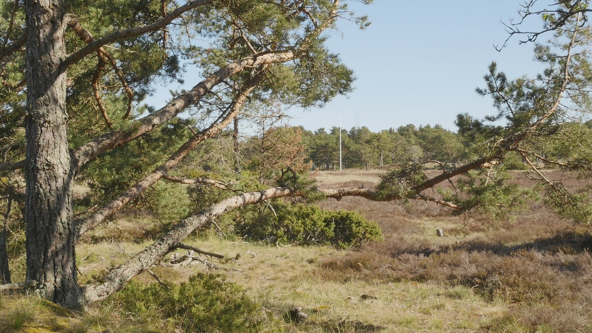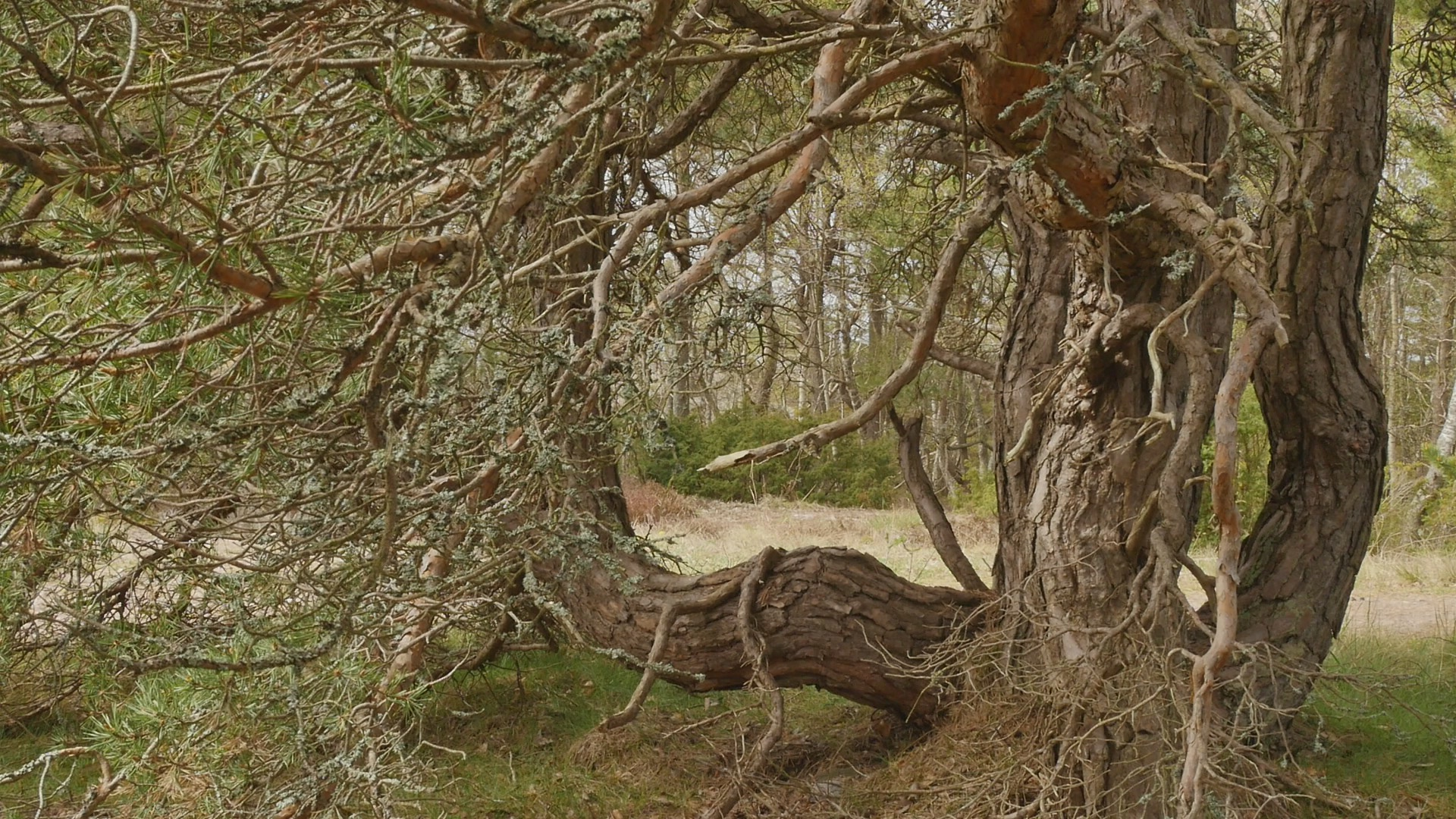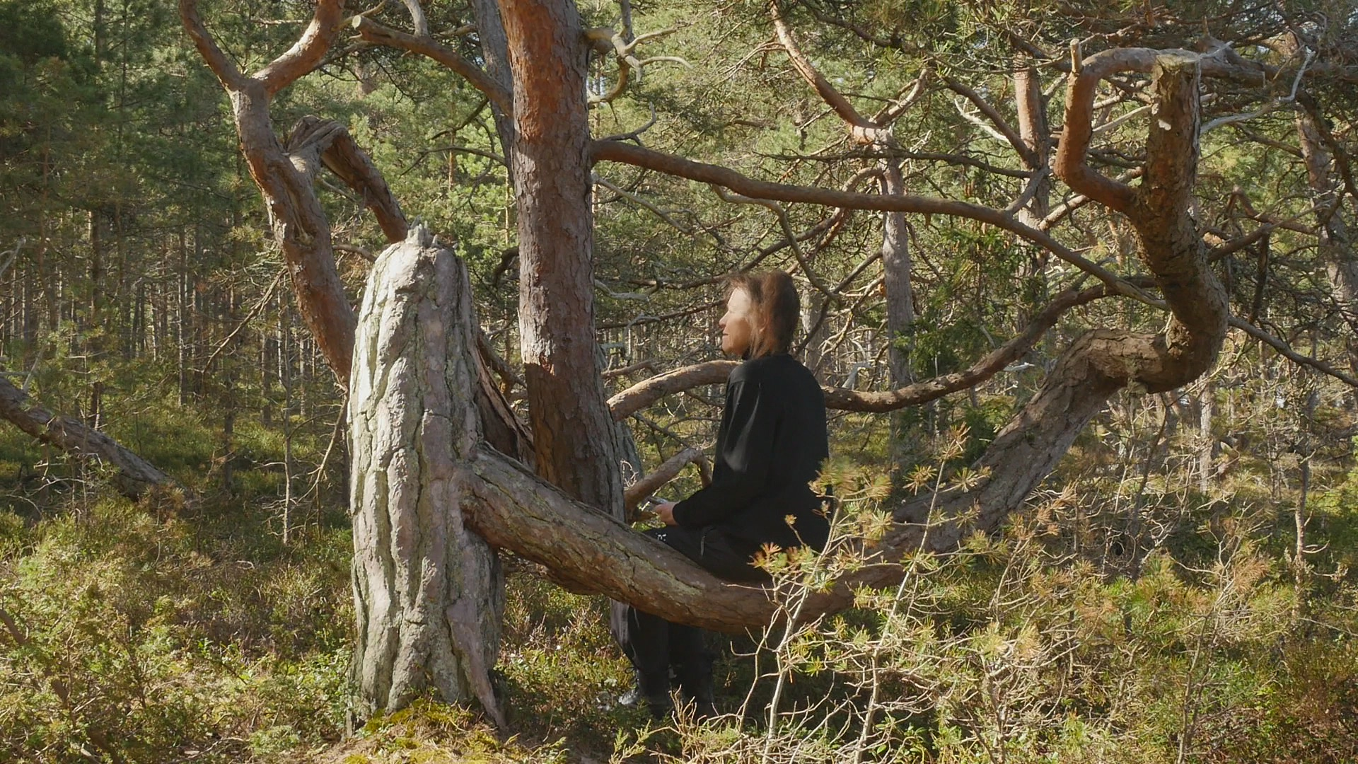 Hello, pine, or good morning. Although you're growing here on the western shore, the sun reaches you beautifully and me sitting on you from the east because of the opening in the forest. I came to you early this morning, well, it's not early but morning anyway, because there is less wind now. And they have forecasted that the wind will return around noon. And I wanted to try to talk with you here on the western shore, now when the wind hopefully doesn't destroy the recording. You're a spectacular pine tree and I remember you from my first visit to the island in November 2020. This is my last day on Örö during this trip, so I wanted to come and say hello. And also to talk with you, because although I did pose with you earlier, I've never tried to address you before. I realise you're very familiar with attention because your trunk is bent in such a spectacular way. And the place where I'm sitting as well as some other place nearby are really marked by small paths leading up to these seats so to speak. So obviously, visitors and tourists have found you a perfect selfie spot or photographic spot in any way. The site where you're growing is spectacular because we have the open sea and the long sandy shore right behind my back. But I'm facing the forest now to face the sun, but also to avoid the wind, which is almost always from the west. Well not always, but usually. I have no specific topic to discuss with you today except this idea of returning which is somehow fascinating. I used to earlier, I used to focus on this idea of returning repeatedly to the same tree or the same spot. And I did it partly to create time lapse videos to show the changes and to experience the changes but also as a form of routine or habit, something that became like a substitute for meditation even or substitute for any kind of mindfulness practice or whatever you prefer to call that. And that also created a specific bonding with the tree. So this idea that I've experimented with now on this short visit to Örö, to befriend a new tree, or at least make acquaintance with a new tree every day, is a very different idea. And now, when I come back to you it's also different from these regular returns; it's one and a half years since we met last time. Well, I've been walking past here many times, but not sitting in your lap or on your branch to be correct or trunk actually. And in some sense, I feel a little bit guilty to have chosen you to visit now, because your performance is so obviously spectacular. And there are so many, many, many small pines contorted, and bent and twisted in various ways, all along the shore. But then I thought that maybe I can honor you, and your sort of old age also, by foregrounding you instead of some of the other ones. Also, this idea of enjoying the sculptural form that you created of your trunk is of course controversial, because these beautiful forms are the result of accidents and misfortunes and small catastrophes but they're also the evidence of your tenacity and resilience and will to live and to accommodate. I thought I would sit here and rest and find a moment of stillness instead of this eternal babble but I realise the wind is so chilly that I really can't relax while I'm sitting here. I understand that there is no way I can feel what you feel or experience what you experience. But simply this sense of cold that comes to my bones from this little wind which is nothing compared to the ordinary winds here, and of course nothing to compare with the winter storms, gives me an idea of the sort of conditions that you're living in. That said something in this idea of calmly adapting to the situation that you find yourself in is admirable. There was, I was asked to create a provocation or an assignment of sorts for a project called Designing the pluriversity or something like that a year ago. And now we're going to have a symposium online with all the people who participated by creating provocations. My provocation was the assignment to go and interview a tree, or try to talk with a tree with paper and pen and to try to receive whatever comes to mind when staying with that tree. The assignment was formulated in a slightly different manner but anyway, and I also made a video with an old Tarri pine in Hailuoto Island up in the north. They call old thick pines for Tarri pines there, I wonder if you would be called a Tarri pine according to their preferences, I'm not sure. But anyway, the responses to that video and to that assignment by the various students, and participants who responded to it and uploaded stuff online are fascinating. I looked at them now because of the symposium and many of them emphasised exactly this calmness or stillness or invitation to rest for a moment. Some people also emphasised the rootedness and the importance of that. But I think the interesting thing is, if you could teach us humans to rest, to stay for a while, even to reflect, to find the capability of enduring the moment. It sounds strange to speak of enduring the moment instead of enjoying it. But most people, including me, are restless. And being in one place, for real, for a while, is almost like an endurance test. Well, this moment, which I expected to be a lovely sort of encounter or the joy of seeing you again, and sitting here aware of the fact that these rare moments will soon pass, is now destroyed by the simple fact that it's so cold. It's amazing how life is sensitive and vulnerable. Humans are but not only humans. And probably you're also sensitive and vulnerable in your own manner, although your trunk shows that you have managed to thrive despite that vulnerability. But the conditions for life are quite narrow in the sense, in terms of temperature, in terms of humidity, in terms of light and darkness, in terms of chemical compounds in the atmosphere. As researchers tell us, it's really very little is needed for life in its current form on Earth, to have difficulties. Of course, there are bac