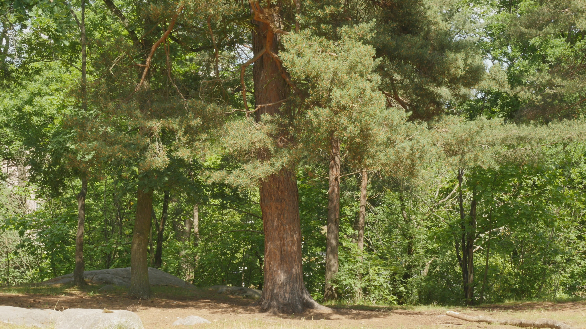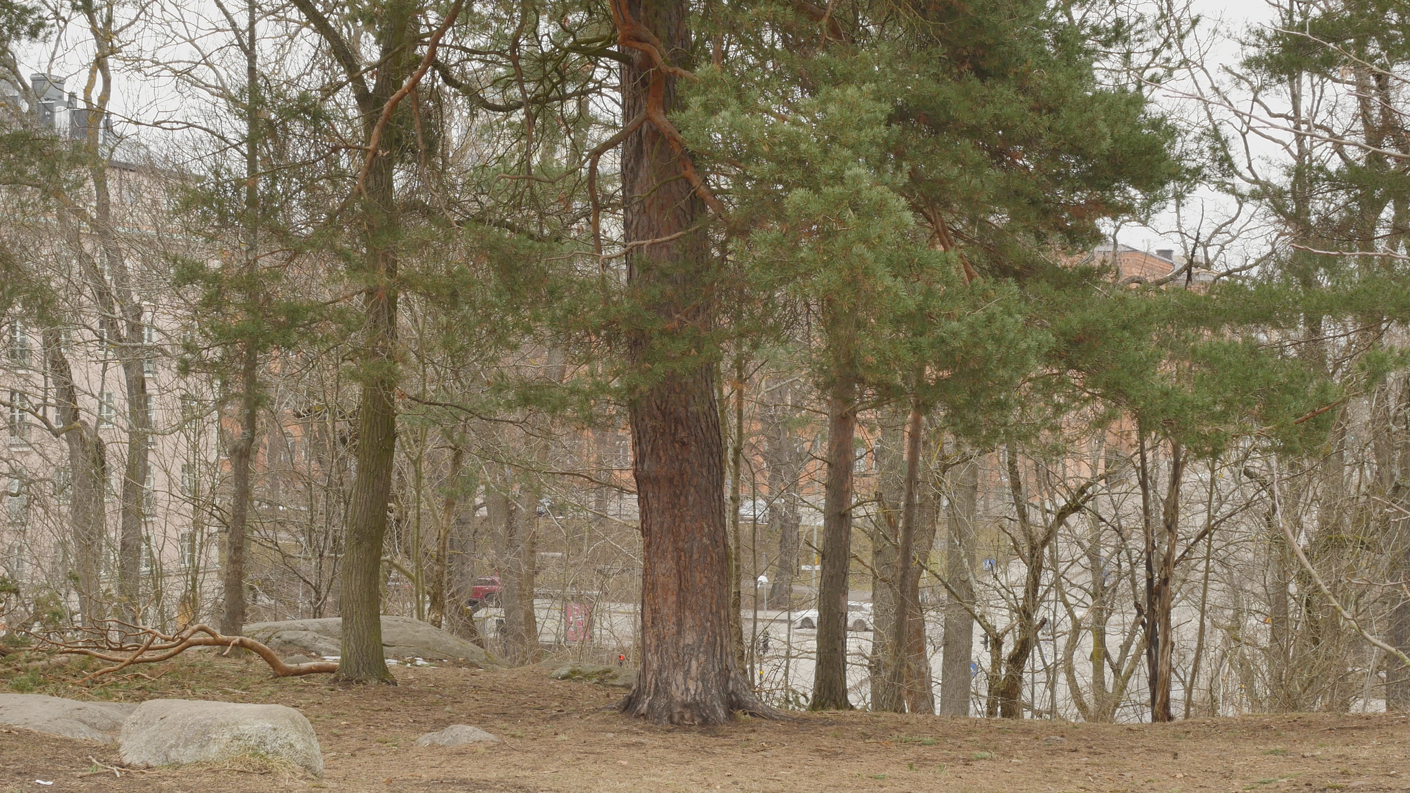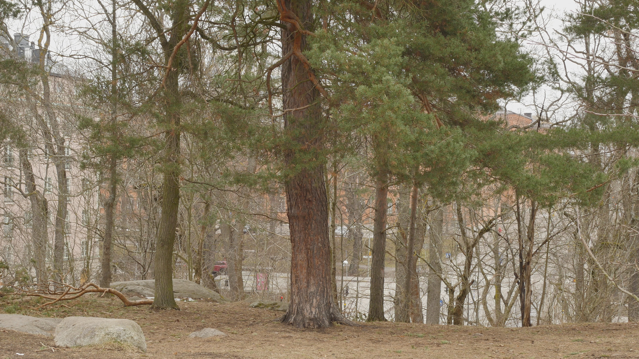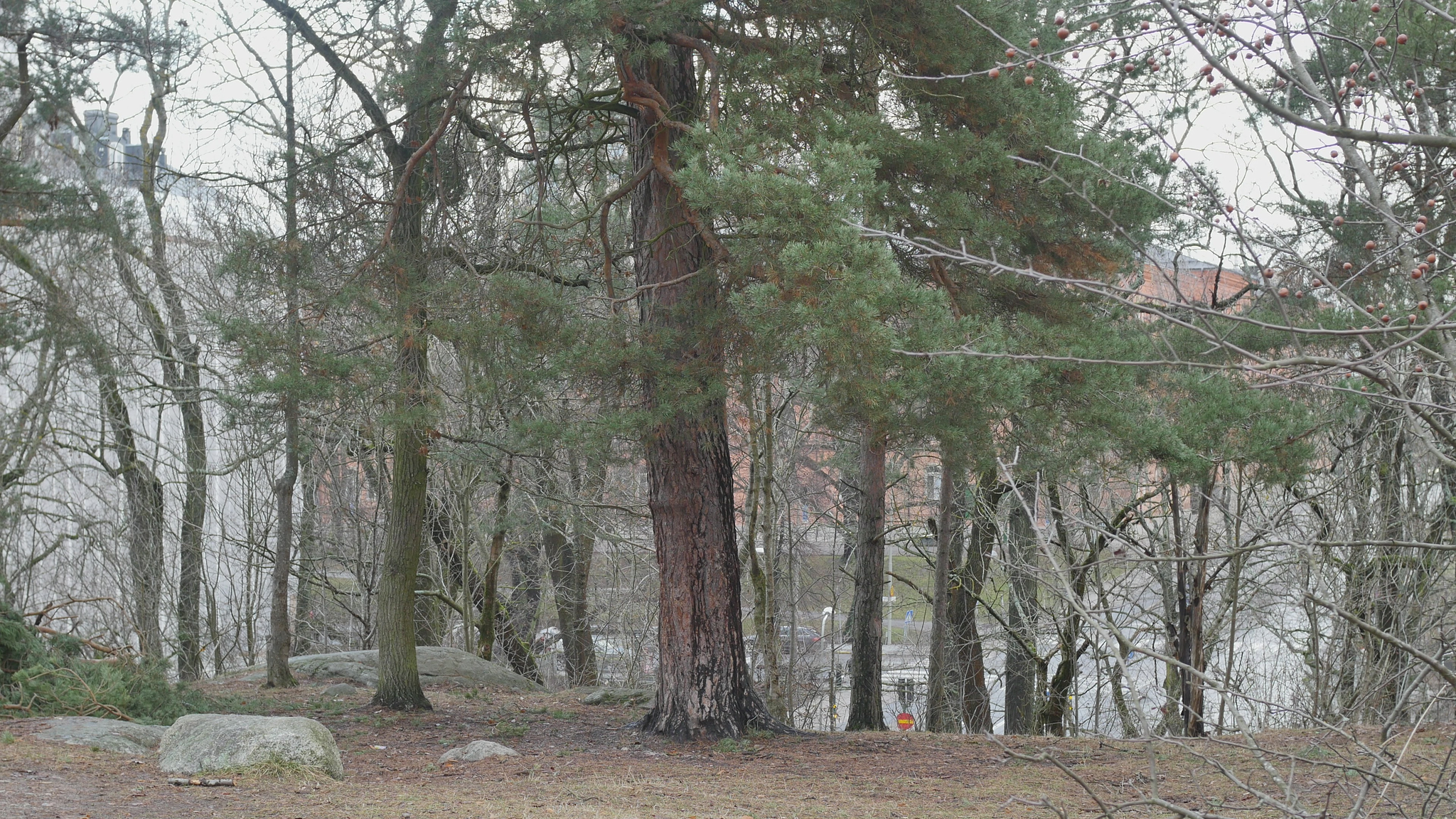 Plötsligt ökar vinden, så det kan bli svårt att uppfatta det jag säger, men det viktigaste är att jag vill så väldigt gärna inleda ett samtal oss talar emellan. Vi finns ju överallt och hör till de vanligaste träden i Sverige som i Finland också, för vi klarar oss där andra inte gör det, om det är för torrt eller för vått för andra träd så klarar vi oss nog bara det finns tillräckligt med ljus. Men det är just ljus det är ont om så här års. Men även om vi är många i riket i stort, så är det ont om tallar i Stockholms innerstad. Här uppe på kullen i Nobelparken växer det en klunga av oss och jag tror nog jag är den äldsta av oss. Men annars är det rätt få tallar i parkerna här. Vi är inte parkträd på samma sätt som ekar, lindar, almar osv. Och jag har nog inte planterats här utan hittat hit på eget bevåg, med hjälp av något djur, en gnagare eller fågel kanske. Men det minns jag inte längre.