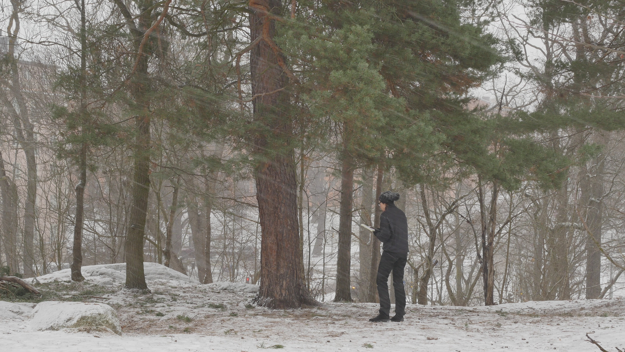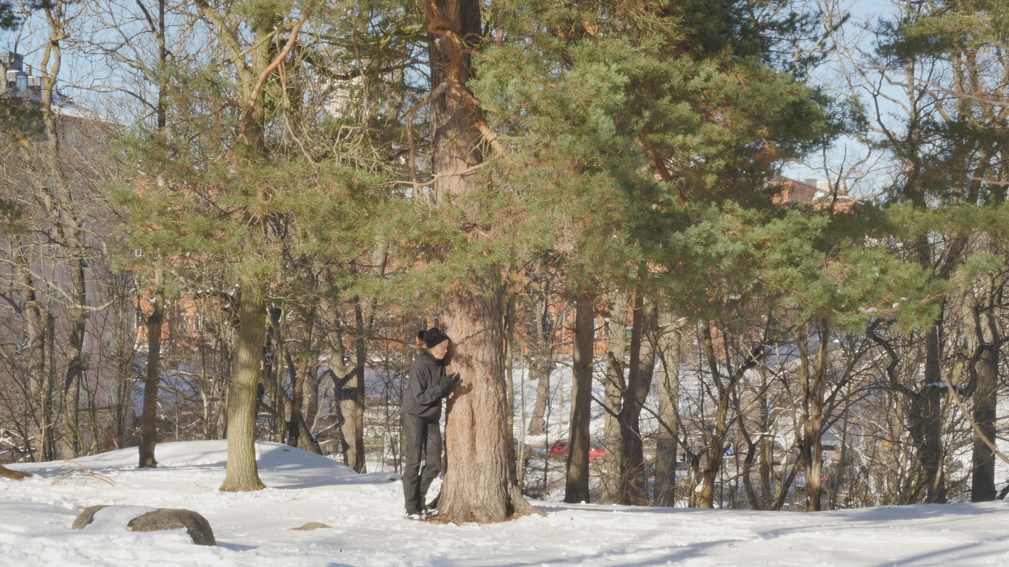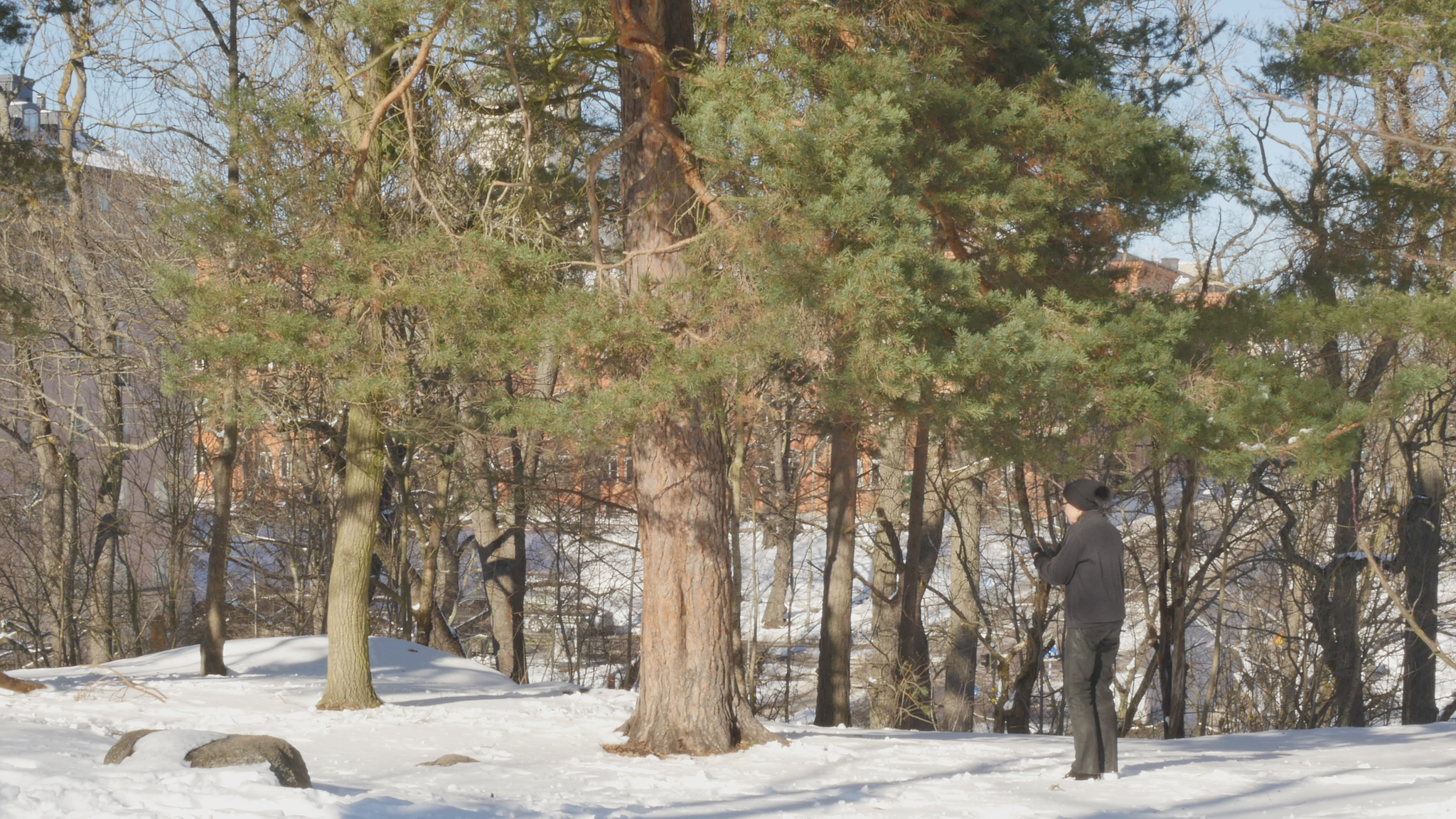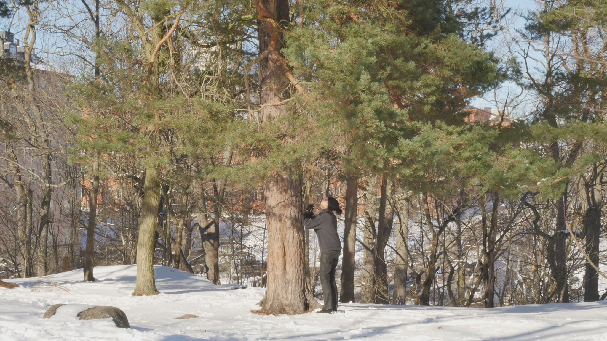 Kära kollega, tack för ditt brev, tack för ditt bud. Här snöar det igen, vintern återvänder, men du har rätt, ljuset kommer nog tillbaka. Jag föreslog åt budbäraren att tala in mitt brev eller mitt bud snarare än att skriva ner det på papper, för det är ju lite konstigt att vi tallar skulle umgås via cellulosa som material. Nåja, papper görs ju av cellulosa och cellulosa görs också av tallar så det skulle vara lite groteskt egentligen att använda döda kolleger som underlag. Och hon gick med på att försöka. - Så här vintertid är det inte så mycket trafik här uppe på kullen, men det kommer småbarn med någon slags daghemsgrupp eller liknande ofta på vardagarna. De för ett väldigt liv men egentligen är det roligt med lite oväsen ibland. Du talade om att du växer i en pulkabacke och sånt finns nog inte här, men däremot tycker barnen om att bygga kojor av nedfallna grenar och sånt. - Tidigare i vinter eller under senhösten var det hårda stormar i samband med tung snö och då gick många grenar av. Lyckligtvis klarade jag mig utan att tappa en enda gren, men här i grannskapet var det flera av oss som hade svåra benbrott, kunde man väl säga som människor talar om dem, men alltså brutna grenar. - Det är rätt mycket trafikljud som når oss här på kullen, slår det mig nu när jag försöker göra mig hörd, men sommartid blir det lättare när det finns lövträd som mjukar upp lite grann. Nu är det kallt och kalt. - Snön som faller ner just nu är mjuk och flingorna är små. Dessutom blåser det inte särskilt mycket, så just nu är det bara behagligt egentligen. Jag vet inte riktigt vad jag kunde berätta från Stockholm just nu. Jag har inte hört så mycket eller sett eller känt av så mycket spännande saker. Eftersom det inte är så mycket fåglar eller djur eller människor eller insekter i rörelse så är jag också lite ovetande om vad som är på gång. Men jag hoppas i varje fall att du har det bra där på sluttningen eller i backen i Helsingfors och att du hör av dig igen. Vi går mot våren sakta men säkert. Ha det bra hälsar Tallen på kullen.