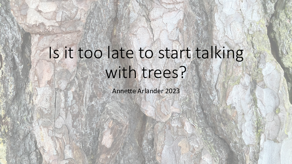 Is it too late to start talking with trees? Or, rather, a bit too early, considering the rapid developments in our understanding of vegetal life? In this presentation I describe my experiments with the podcast Talking with Trees, a series of attempts at addressing specific trees in Swedish, Finnish, or English. As part of the artistic research project Pondering with Pines, in the border zone of environmental, media, and performance art, the main concern is to develop ways to recognize and engage with the subjectivity of life forms such as trees, which we tend to consider as wholly “other.” How can we develop acts of thinking, reflecting, pondering or speaking with trees? How can we develop imaginative and poetic ways of encountering pine trees and engaging with them? What possible ways of communicating could be developed between trees and non-trees like humans? These experiments are repetitive, circular, and low-tech, not innovative as such. Rather than claim direct impact or provide “solutions,” they explore alternative and intimate forms of documenting and sharing, and they strive to participate in the cultural transition that is taking place. As author Amitav Ghosh, among others, has noted, the task of imaginatively restoring agency and voice to nonhumans is a task that is at once aesthetic and political and of pressing moral urgency.