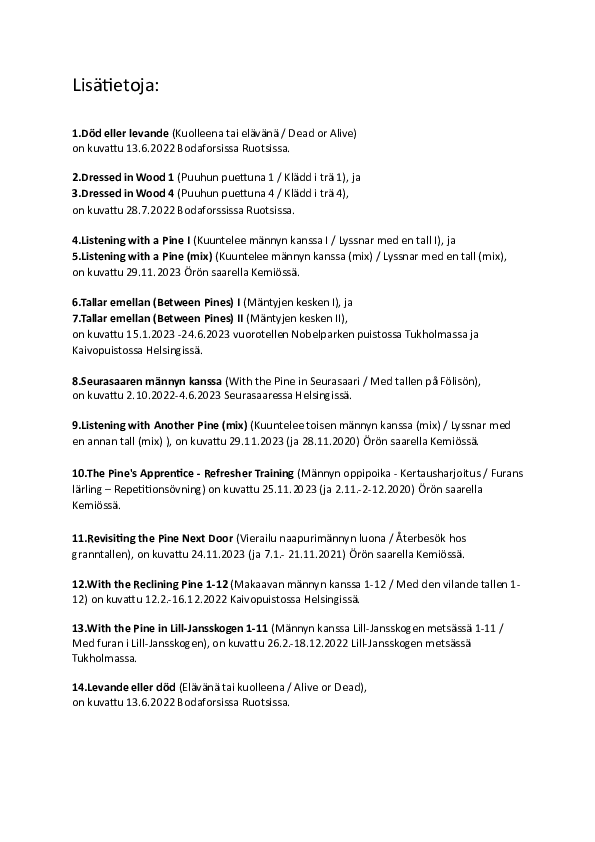 This exposition documents my explorations of pondering with pine trees. Tämä ekspositio dokumentoi yritykseni miettiä mäntyjen kanssa. Den här ekspositionen dokumenterar mina försök att fundera med furor.