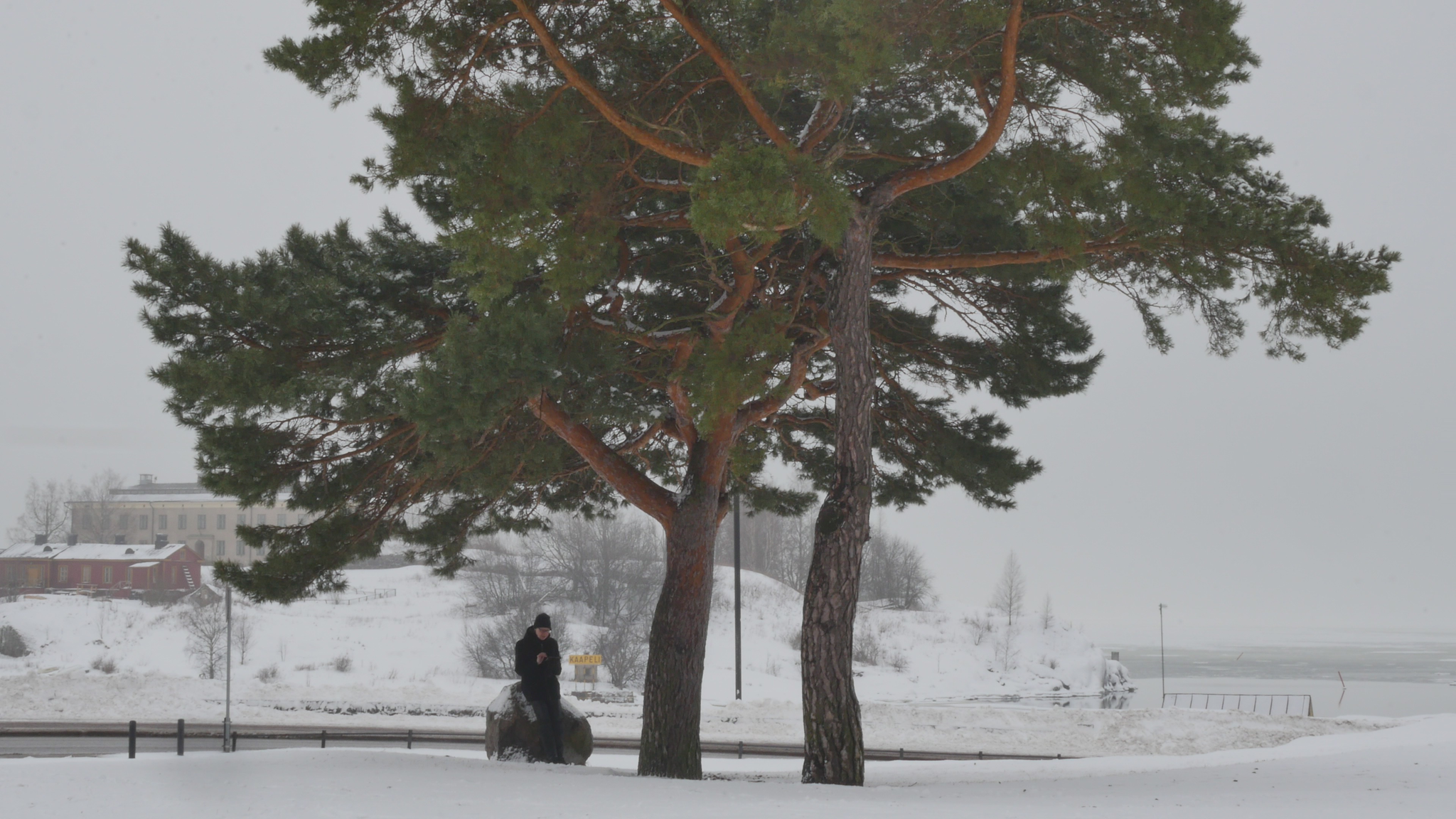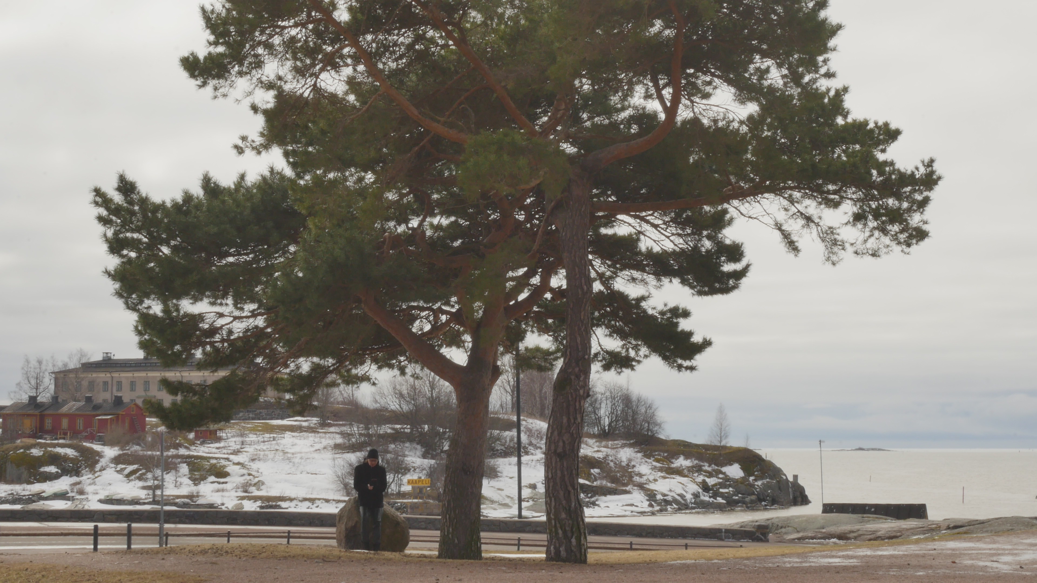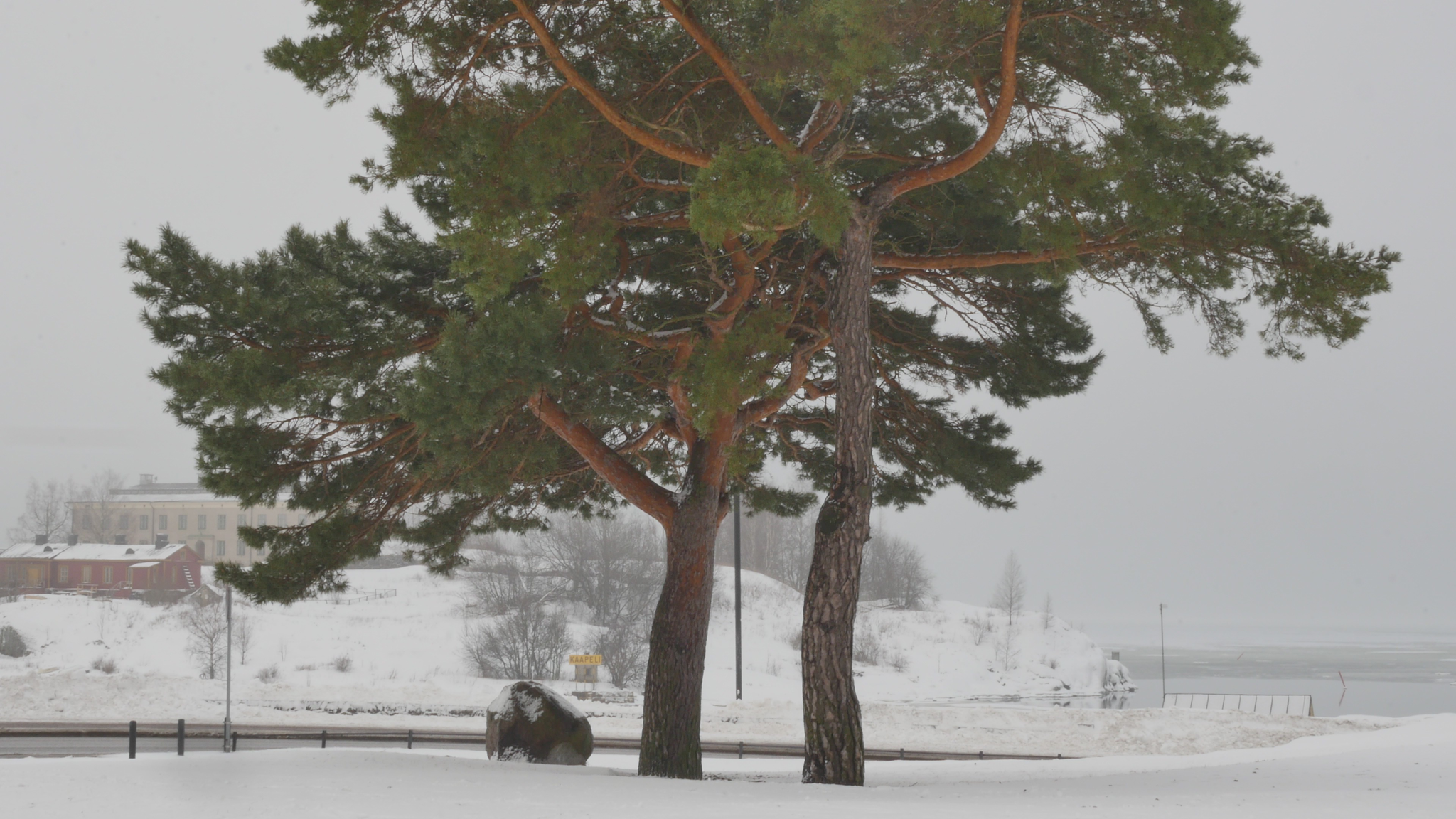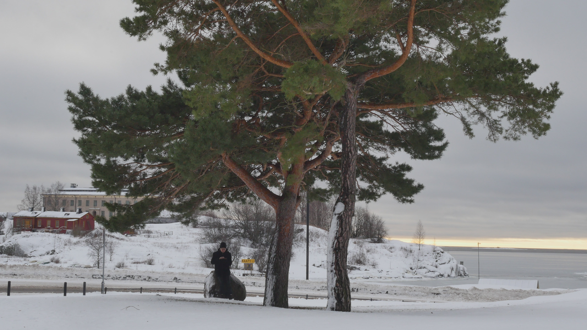 Hello Pines, both of you, pleased to meet you. It's the 9th of January 2024. The cold, really cold weather has changed into plus degrees, so the snow in your crown is melting and dripping on me here when I sit on this bolder. There is a sign on the other side of the bolder that it's brought here from the area around Viborg by the ice during the ice age. Well, the area of Viborg was not the aerea of Viborg by then, but anyway it comes from the east, and is very ancient. But you, if we think of you as a family, are much much more ancient than that. You came here at the time of the dinosaurs, or even before. I decided - well I hope you don't mind, but - I decided I needed to study a little bit more about pine trees, to know more about pine trees, and what best way to do that to do it together with you. Since I met some of the other pine trees in the same park I decided I need to read a little bit also, so I found a book. And the other pines here in the park, they have their own specific character, but I guess most people walking by here would think of you as the real landmark, because you grow here, the two of you, on the... near the road and near the shore. So you're sort of easily recognisable. There are a lot of people walking and also skiing now in the park even though it's wet but never mind. So back to the book. I found a book by, written or compiled by, a huge book, by somebody called David Richardson, and it's called The Ecology and Biogeography of Pinus. So there is a lot of information of all kinds and I began by reading the introduction, or part of the introduction and I'm going to, yeah. And that's where I learned that you are a part of the so-called gymnosperms and not the angiosperms like most plants or flowers and so on, and that you're very ancient. And yes, so maybe I should quote the text so I don't invent something. So yes, when the earliest angiosperms were appearing in the early Cretaceous, that's 120 million years ago, you were already here. So gymnosperms arose much earlier in the middle Devonian, 365 million years ago. And I quote: "Evidence from fossilised cones shows that ancestors of Pinaceae", that's your family however that's pronounced "had evolved by the Mid Jurassic and that Pinus", your kind " had evolved by the lower Cretaceous." So you really, your ancestors really are ancient. No wonder that you're so strong. So now I quote further: "By the end of the Mesozoic, pines had diversified into two major groups, or subgenera; representatives of both subgenera, Strobus (... or soft pines, with one fibrovascular bundle in the needle) and Pinus", that is your kind "(... or hard pines with two fibrovascular bundles in the needle), survive today." So I understand you're probably part of this second branch of the family. But where did I find, there was... There was a beautiful passage describing why it is that you are so strong and have survived so long and are so widespread around the world, especially in the northern hemisphere. So now I quote: "Among the factors that have contributed to the rapid migration and population increases of pines in the Holocene are: their abundant output of seeds from an early age; their ability to recruit dense daughter stands on exposed sites soon after disturbance; effective mechanisms for long-distance seed dispersal; a mating system that permits inbreeding and selfing in isolated trees; and various life-history traits that confer resilience at the population level under a wide range of disturbance regimes; and the ability to colonize nutrient-poor sites." So yes, that I've noticed when I've met other pines elsewhere that you really thrive there were nobody else wants to live, tree-wise I mean. And you can take both damp and dry conditions as long as there is light. Yeah, but my purpose is not to preach to you or just to read aloud stuff, but I would like to somehow have some sort of support or refutal or confirmation of this knowledge. I understand that you can't know by heart everything that happened to your distant ancestors, but I hope you could somehow inform me, if you agree with this knowledge or not, or if it's relevant at all. Or yes, why, if it's relevant for you, I wonder, does it make a difference if your ancestors are ancient or not. But on the other hand, if we think of the genetic legacy as some sort of accumulated knowledge over millennia and so on, then you must be really really wise. I don't know what else I could, what can I expect from you except tolerance and patience with me. Even though you might not be able to teach me directly or engage in this conversation, literally through language or even comment on the text I read to you, somehow I think it makes sense to learn about you together with you. So thank you for this new start at the beginning of the New Year and see you soon again. Take care.