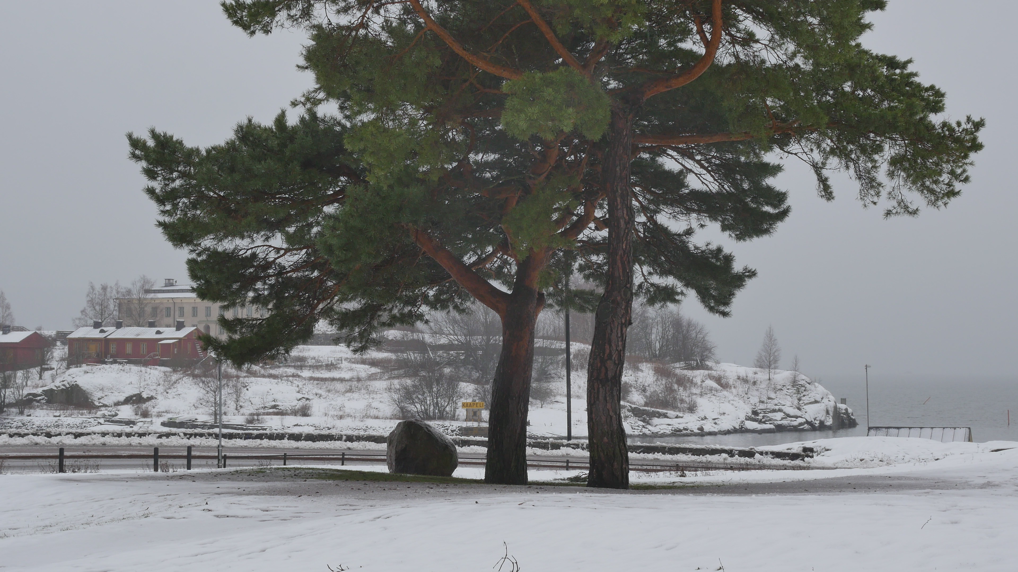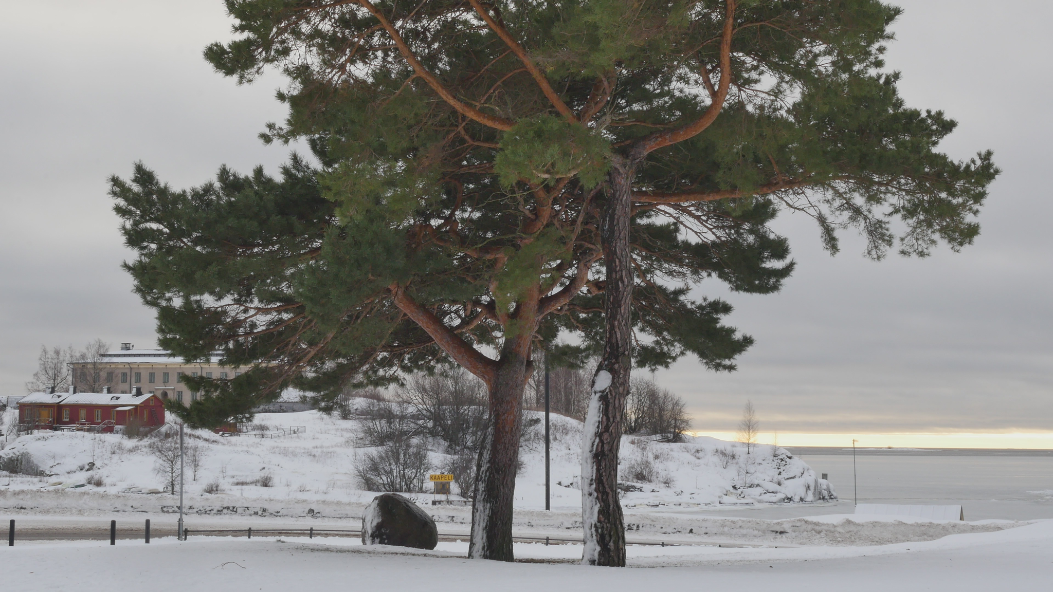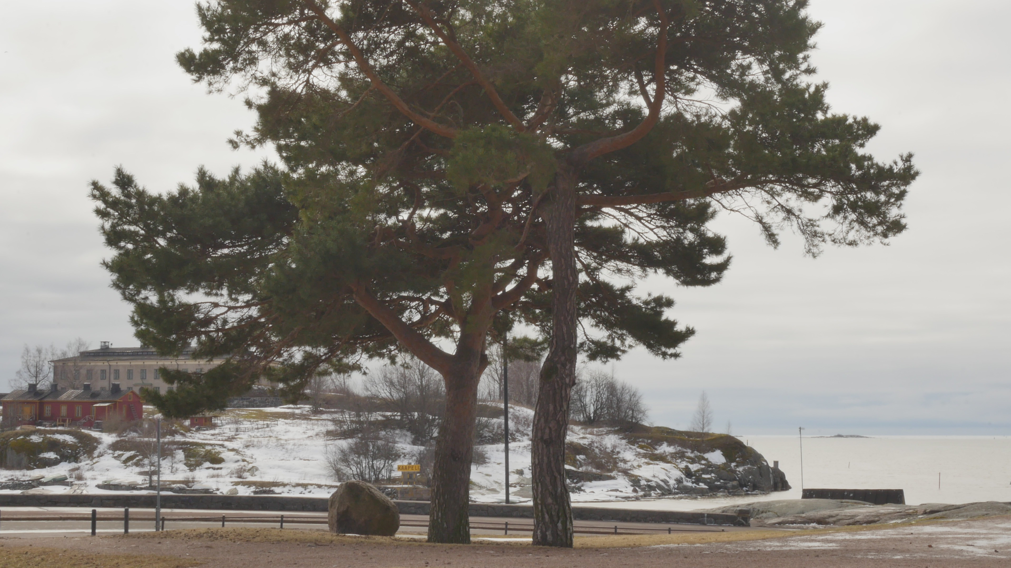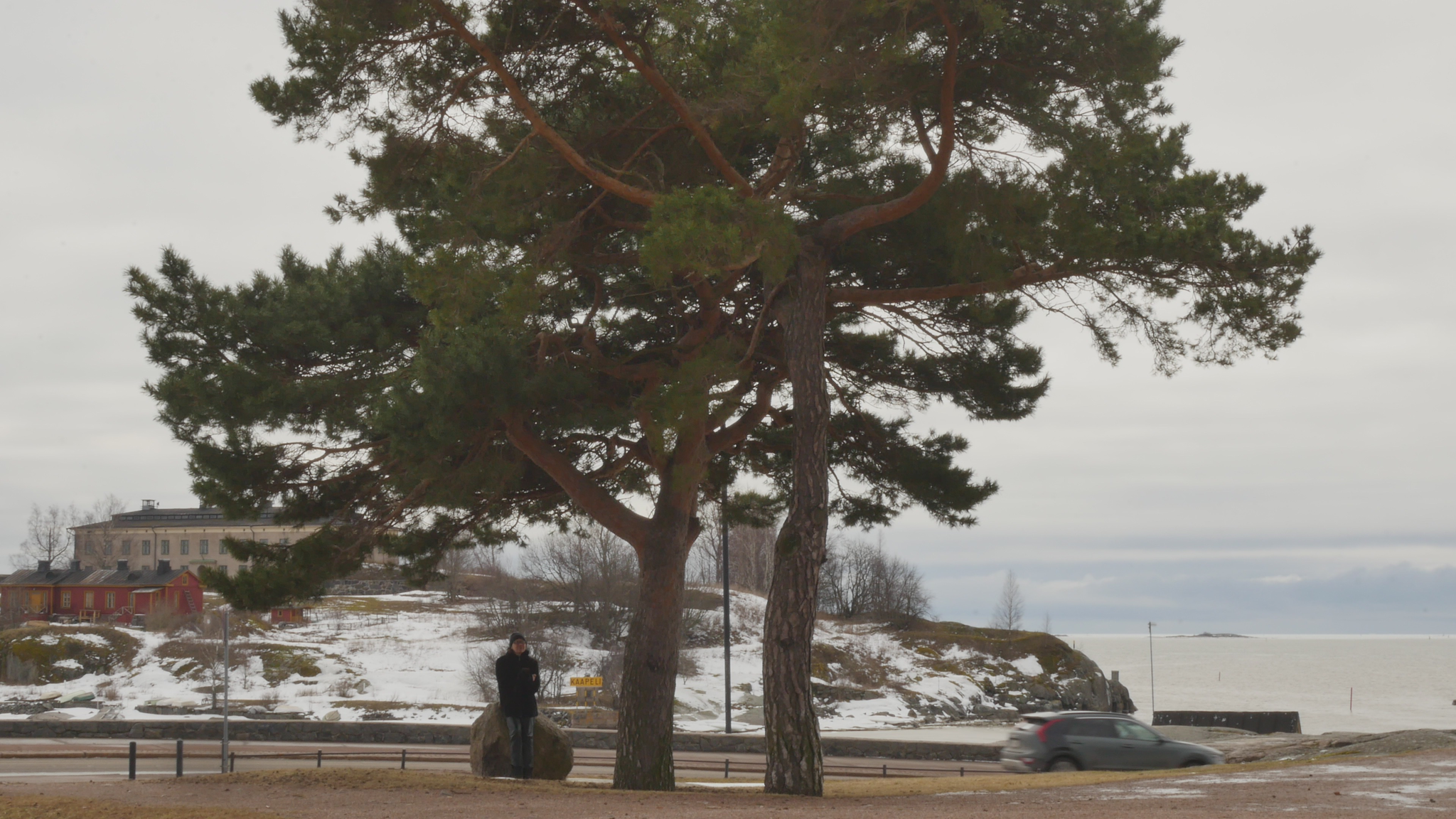 Hello Pines, both of you, pleased to meet you. It's the 9th of January 2024. The cold, really cold weather has changed into plus degrees, so the snow in your crown is melting and dripping on me here when I sit on this bolder. There is a sign on the other side of the bolder that it's brought here from the area around Viborg by the ice during the ice age. Well, the area of Viborg was not the aerea of Viborg by then, but anyway it comes from the east, and is very ancient. But you, if we think of you as a family, are much much more ancient than that. You came here at the time of the dinosaurs, or even before. I decided - well I hope you don't mind, but - I decided I needed to study a little bit more about pine trees, to know more about pine trees, and what best way to do that to do it together with you. Since I met some of the other pine trees in the same park I decided I need to read a little bit also, so I found a book. And the other pines here in the park, they have their own specific character, but I guess most people walking by here would think of you as the real landmark, because you grow here, the two of you, on the... near the road and near the shore. So you're sort of easily recognisable. There are a lot of people walking and also skiing now in the park even though it's wet but never mind. So back to the book. I found a book by, written or compiled by, a huge book, by somebody called David Richardson, and it's called The Ecology and Biogeography of Pinus. So there is a lot of information of all kinds and I began by reading the introduction, or part of the introduction and I'm going to, yeah. And that's where I learned that you are a part of the so-called gymnosperms and not the angiosperms like most plants or flowers and so on, and that you're very ancient. And yes, so maybe I should quote the text so I don't invent something. So yes, when the earliest angiosperms were appearing in the early Cretaceous, that's 120 million years ago, you were already here. So gymnosperms arose much earlier in the middle Devonian, 365 million years ago. And I quote: "Evidence from fossilised cones shows that ancestors of Pinaceae", that's your family however that's pronounced "had evolved by the Mid Jurassic and that Pinus", your kind " had evolved by the lower Cretaceous." So you really, your ancestors really are ancient. No wonder that you're so strong. So now I quote further: "By the end of the Mesozoic, pines had diversified into two major groups, or subgenera; representatives of both subgenera, Strobus (... or soft pines, with one fibrovascular bundle in the needle) and Pinus", that is your kind "(... or hard pines with two fibrovascular bundles in the needle), survive today." So I understand you're probably part of this second branch of the family. But where did I find, there was... There was a beautiful passage describing why it is that you are so strong and have survived so long and are so widespread around the world, especially in the northern hemisphere. So now I quote: "Among the factors that have contributed to the rapid migration and population increases of pines in the Holocene are: their abundant output of seeds from an early age; their ability to recruit dense daughter stands on exposed sites soon after disturbance; effective mechanisms for long-distance seed dispersal; a mating system that permits inbreeding and selfing in isolated trees; and various life-history traits that confer resilience at the population level under a wide range of disturbance regimes; and the ability to colonize nutrient-poor sites." So yes, that I've noticed when I've met other pines elsewhere that you really thrive there were nobody else wants to live, tree-wise I mean. And you can take both damp and dry conditions as long as there is light. Yeah, but my purpose is not to preach to you or just to read aloud stuff, but I would like to somehow have some sort of support or refutal or confirmation of this knowledge. I understand that you can't know by heart everything that happened to your distant ancestors, but I hope you could somehow inform me, if you agree with this knowledge or not, or if it's relevant at all. Or yes, why, if it's relevant for you, I wonder, does it make a difference if your ancestors are ancient or not. But on the other hand, if we think of the genetic legacy as some sort of accumulated knowledge over millennia and so on, then you must be really really wise. I don't know what else I could, what can I expect from you except tolerance and patience with me. Even though you might not be able to teach me directly or engage in this conversation, literally through language or even comment on the text I read to you, somehow I think it makes sense to learn about you together with you. So thank you for this new start at the beginning of the New Year and see you soon again. Take care.