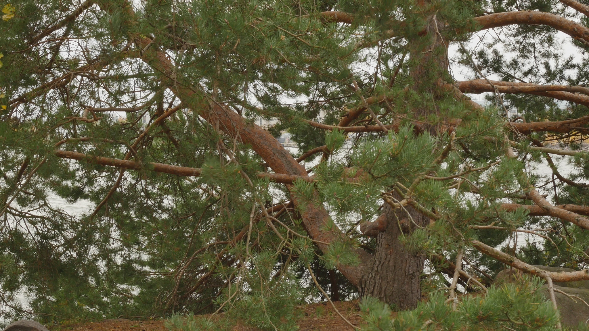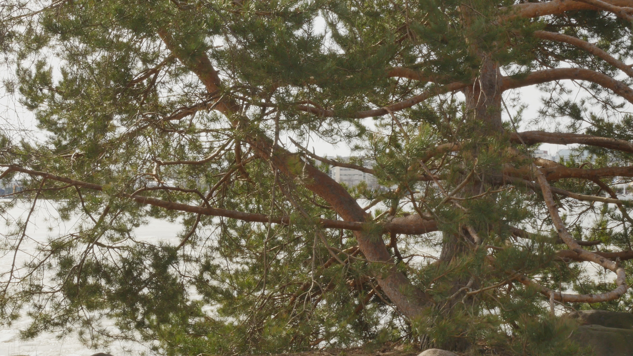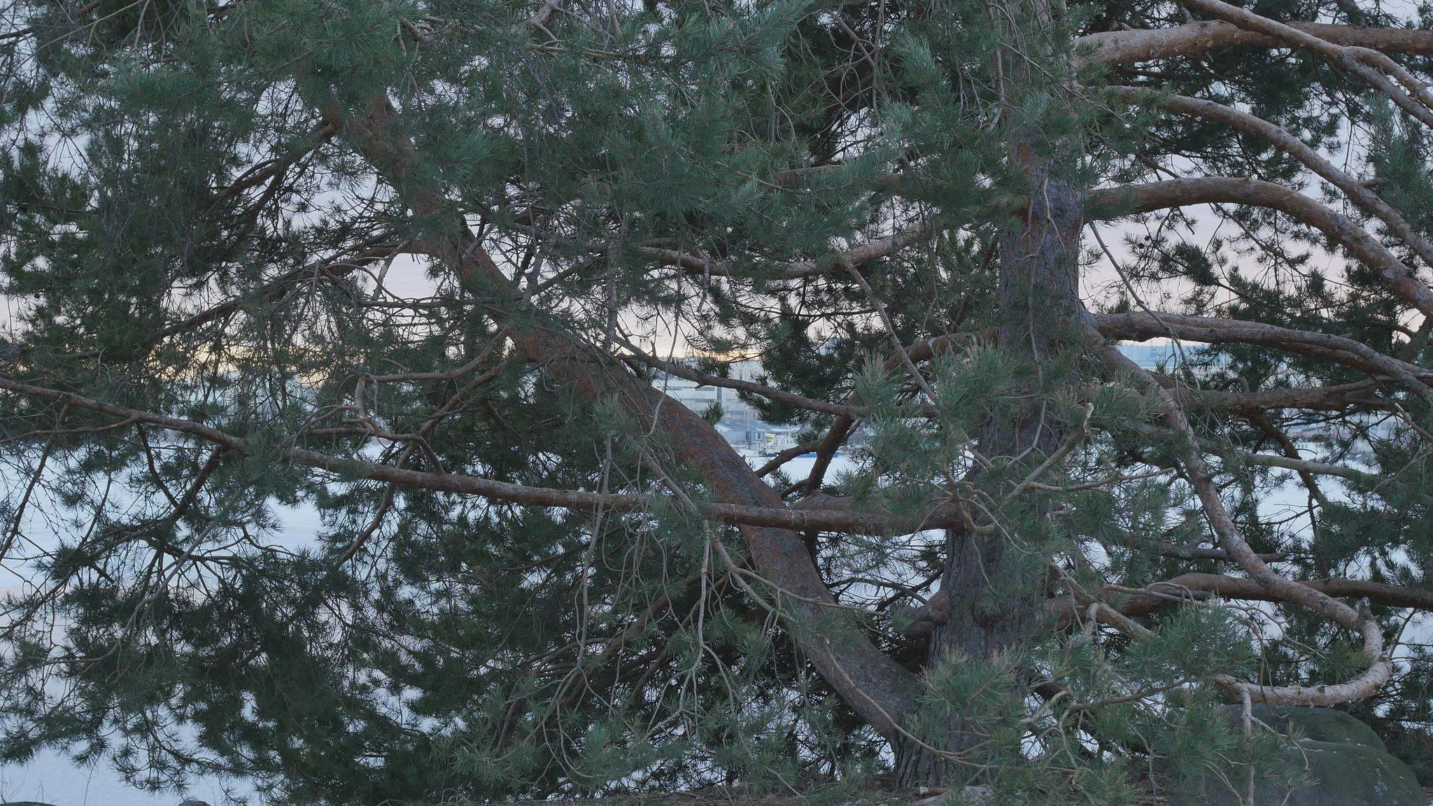 Hej kära tall, hej igen. Trevligt att träffas en andra gång. Du är ännu mer inbjudande och bekväm än vad jag kom ihåg jämfört med andra tallar som jag har besökt. Det är sent på eftermiddagen, solen går snart ner men trots att det blåser ganska häftigt så just här är det inte så illa, för det blåser från ost. På vägen hit gick jag förbi och titta på huset där jag bodde som barn som är här alldeles intill för att förfriska minnet och upptäckte att det var målat. Det var målat i en ljusare grå färg, det var liksom ganska mörk gråbrunt tidigare. Och så var det något slags vägarbete eller gårdsarbete framför. Men det märkte jag också att björkarna som växte där utanför de stora fönstren österut, ett slags, det är ett fyrtiotals- eller femtiotals-hus och det är ju inte det som man kallar för 'erkkeri' på finska [burspråk] egentligen, men alltså stora fönster som står ut från väggen. Det fanns i vardagsrummet och utanför dem fanns det björkar. Men nu var de flesta björkarna borta, det fanns några kvar i hörnet men de syntes nog inte, eller de syns inte från fönstret. Jag minns inte så väldigt mycket om det hemmet trots att jag tror att jag var någonting 13-14 när vi flytta därifrån så jag hade nog det mesta av min barndom där. Och jag minns att jag sedan som lite äldre så fick jag faktiskt det så kallade tjänarinnerummet, ett litet rum intill köket. Så jag hade till och med ett eget rum. Men i princip så var det alltså en hall och sen glasdörrar in till vardagsrummet och sen till höger glasdörrar till sovrummet och till vänster en vanlig dörr till arbetsrummet som var mot gatan. Och det minns jag att det var liksom föräldrarnas revir och min pappa rökte där så dit fick man inte gå, och om det inte var någon riktigt stor kris som till exempel om man hade ont i öra eller något sånt så då kunde man knacka på dörren på natten eller något sånt. Men sovrummet som egentligen var också barnens rum, så där fanns det en balkong mot gården, mot söder, och så var det Mumin tapeter, ljusblå Mumin tapeter, det minns jag gott. Och ja, vad mera? Alltså ett av mina allra första minnen, från en ålder när jag var ungefär fyra år, knappa fyra år eller till och med mindre, är faktiskt från vardagsrummet. Och jag skulle annars tro att det är något som man bara har berättat åt mig och som jag därför kommer ihåg, men jag har tydligt minne av det där speciella ljuset från gatlyktorna genom de kala björkarna som stod utanför, för det var mörkt i rummet. Och jag minns att pappa stod på något sätt som en figur vid dörren till arbetsrummet och så sa mamma att nu går vi på knä och nu ber vi så att Lasse ska få leva. Och det var så konstigt, det var väldigt konstigt och spännande och ovanligt för jag kommer inte alls ifrån ett religiöst hem. Men det roliga var ju att Lasse faktiskt fick leva. Alltså Lasse var egentligen Malte, min lillabror som var verkligt verkligt sjuk när han var två år eller lite under det. Han fick blindtarmsinflammation och för att han var så liten så upptäcktes det inte så att den han liksom explodera hela blindtarmen så att det blev liksom, hela buken blev inflammerad så att han opererades. Och det var på liv och död och det förstod jag ju inte då som barn men jag förstod att det var något väldigt väldigt liksom spännande eller farligt som höll på att hända. Jo, så det är minnet är liksom trovärdigt just för att jag har det där ljuset och skuggorna från det ögonblicket. Det som jag däremot inte har något minne av men som har berättats att jag har gjort, när min stackars lillebror var sjuk, så hade jag krävt att få klä mig min finaste mörkblå sammetsklänning och när läkarna kom på besök så sprang jag också i hallen och skrek att jag är också sjuk, jag också sjuk, titta på mig! Så kan det vara, men det är minns jag ju inte, det har man berättat åt mig. Men nu finns alltså inte björkarna kvar. Däremot så tittade jag lite mot gården och det stämmer att där är också vackra tallar. Där är någon slags stenmur mot granngården också såna gamla gråstenar och sen finns det tallar där intill. Men jag minns inte att jag skulle ha varit så mycket på gården faktiskt, och balkongen användes nog mest för att vädra saker och ting. Men Mumin tapeterna minns jag och Mumin figurerna fanns också på tallrikarna, när man skulle äta upp gröten så fick man se Mumin. Så att sedan när Mumin blev populära på nytt för något tiotal år sedan så tyckte jag att det var väldigt konstigt, för de hörde liksom till 50-talet eller början på 60-talet i min uppfattning. Vad annat kan jag tänka mig? Det var, jag lovade förra gången att jag skulle försöka prata barndomsminnen med dig, men jag vill ju också veta hur du mår och om allt är bra. Det är det antagligen för här växer du i lugn och ro. Det är mycket snö skottat upp här alldeles intill men inte ända upp till dig. Och din bark på de här grenarna är vacker, rödbrun gul. Vad mer kan jag säga? Kanske det får räcka för den här gången. Jag tackar för att du lyssna på mig igen och jag ska komma och hälsa på dig igen om en månad eller så. Sköt om dig till dess och ha det bra.