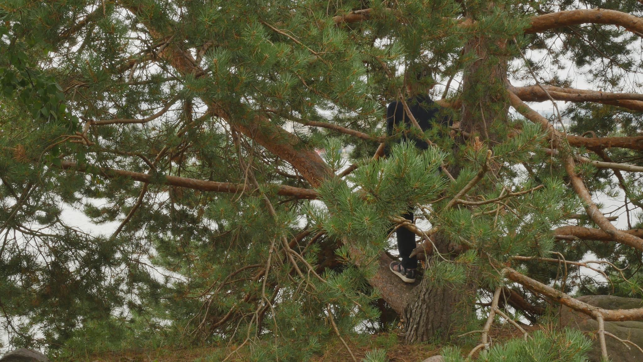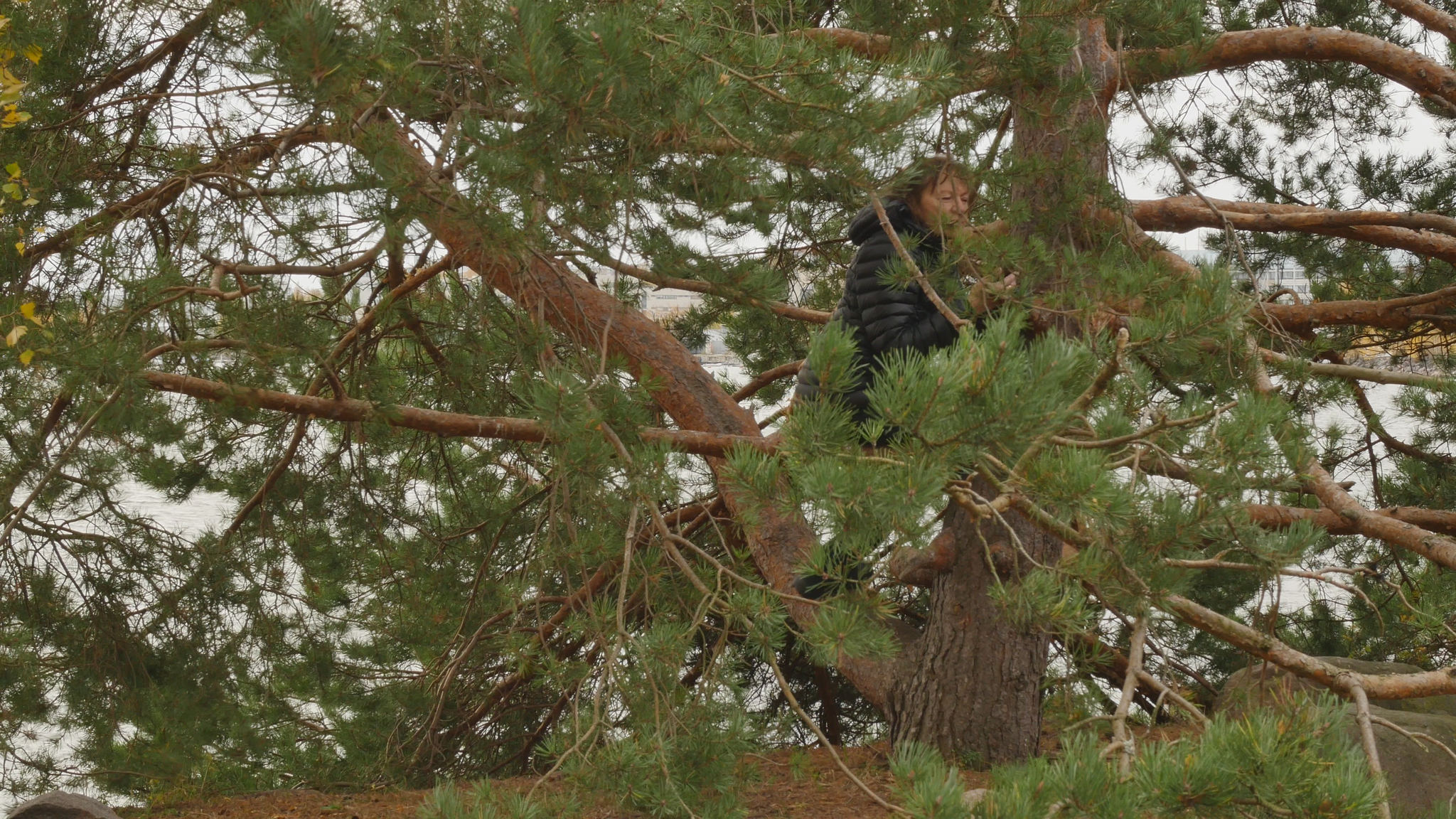 Hej på dig kära tall. Nu blåser det så väldigt att jag får kränga mig en sån här underlig position med ryggen mot vinden. Jag hoppas det fungerar. Det är länge sen sist, nu det är redan slutet på oktober, den 21 oktober, och nu börjar man märka hur speciell du är eller ni alla, tallar och granar, alla som inte fäller sina löv. Björken här bredvid dig har fällt ren hälften av sina gula löv. Snart är den helt kal. När jag promenerade hit så funderade jag vad jag skulle kunna prata med dig om och så kom jag ihåg det som jag tänkte på igår och de olika hobbyn som man hade som barn. Men allra först måste jag berätta att jag håller på att läsa en klassiker i miljö litteratur, poeten Gary Snyder, den amerikanska beat poeten skriver en bok, alltså skrev en bok på nittiotalet som heter The Practice of the Wild, som är essäer, inte dikter utan essäer, där han berättar om sin barndom och naturen och hur den har förändrats men också förstörts och missförståtts och så vidare. Men där nämnde han i förbifarten att i barndomen mellan sex och tio år så får man en uppfattning om världen genom att röra sig runt i sin närmiljö. Och då hade han sin närmiljö nånstans i norra Kalifornien på en bondgård eller gård då. Men jag började ju fundera på att ja, här var jag sitter nu hos dig så det här är min barndoms närmiljö exakt från de åren. Men jag minns inte att jag skulle ha på nåt sätt rört mig särskilt mycket här i trakten. Jo, jag minns de här klipporna och jag minns dem också från fotografier när vi var riktigt små med min bror och en barnflicka tog oss hit. Och sen förstås, det som var viktigt var skolvägen, promenaden till skolan som var på ådvägen. Och det var ju en ganska bra bit och jag har tidigare pratat om hur gräsmattorna och hur det nu finns byggnader där, hur det var liksom ett halvvilt område, sumpmark och buskar där... Men ja, nu blåser det igen väldeligen. Men egentligen så har jag inte minnen av liksom av att leka på gården riktigt eller att liksom utforska omgivningen på egen hand. Jag tror min bror gjorde det mycket mera. Jag var ganska försiktig som barn tror jag, och sen stimulerades man inte som flicka på den tiden att liksom. Eller tja, jag kan nog inte skylla på det, det är nog min egen lättja som gjorde att jag höll mig liksom till vägarna. Men jag syssla inte heller med sport. Jag kommer ihåg att jag avskydde bollspel för jag var rädd för bollen. Jag lyckades nog lära mig skida och skrinna sådär måttligt, men jag var inte särskilt förtjust i det heller. Jag minns i och för sig skridskobanan som fortfarande är kvar där i andra ändan av Drumsö och att det var ganska kallt och man frös om tårna och jag var lite rädd också där för att ramla med skridskorna. Men så minns jag, och det är ju konstigt vad man minns, jag minns en speciell sorts varm saft som de hade där, som var väldigt söt och smaka annorlunda en mormors blandsaft eller svartvinbärs saft. Nåja, men det som jag nu sen syssla med så det var ju att dansa, alltså dansa balett, det började vi med. Jag börja med det tror jag, nu ska jag vända mig igen för att undvika vinden. - Blir det bättre så här nu då. Ja, det börja vi med min vän, väninna Monica Nyman som dansa balett så då ville jag också dansa balett. Men jag hade nån slags, jag hade dessutom så hade jag ju någon hobby att jag dansa folkdans i nån grupp. Men det var nog bara en termin tror jag eller något sånt, det var inte särskilt intressant. Men som riktigt litet barn så hade mamma fört mig till tennispalatset i centrum till någon slags sagodans. Jag minns att lärarinnorna, att skolan heter Puolanne Karpio och det var väl någon slags fri dans då. Vi sprang omkring och var fjärilar och hade underliga små tossor, lädertossor med gummiband runt och så vidare. Och det var ganska roligt. Men sen baletten var ju på något sätt på mycket större allvar. Jag slutade dansa balett väl först som 14 åring. Jag har en känsla av att jag berättat om det förr, men det var i samband med liksom första upplevelsen på scen. Men ja, alltså balettskolan var viktig förstås men det var det enda liksom sportiga eller fysiska. Det var, allt det som folk bruka liksom syssla med, mina skolkamrater, sen senare i synnerhet, som att skida slalom eller att segla, det var allt helt främmande för mig. Och egentligen är det ju liksom, det var nästan som någon slags samhällskunskap, det borde man ha kunnat för att kunna delta liksom i normalt socialt umgänge. Men av någon anledning, dels var det ju förstås för att vi inte syssla med det hemma, men att om jag skulle ha villa, så skulle jag säkert ha fått lära mig det. Men ja, jag var försiktig eller som man på finska säger 'arka'. Jag vet inte om, det är inte riktigt samma sak som försiktig utan liksom räddhågsen på sätt och vis, konstigt nog, fast jag sen inte alls var rädd för liksom i andra sammanhang, för att säga vad jag tänkte och så vidare. Men sen andra hobbyn, alltså det var ju, några år så var det ju verkligt stressigt för att det var så många hobbyn. Så pianolektioner och de höll jag på med i många år, men, och det var ju liksom, det var motigt. Jag minns att jag hade flera lärarinnor men en talade väldigt bred dialekt och klagade över att jag inte kunde, aldrig, jag förstod liksom inte nånting och var verkligen omusikalisk, det kan man väl säga. Men sen ville mamma också föra min bror och mig för att ta sånglektioner. Hon hade sökt upp någon sångerska och vi var där och provsjöng men, och där fick jag då veta att jag egentligen hade eller skulle haft en alröst. Men hon tyckte att vi inte var begåvade, eller hon tyckte att min lillabror skulle ha haft liksom någon slags möjligheter men jag var helt hopplös så att det blev inga sånglektioner lyckligtvis. Och vad mera? Alltså det är ju vikti
