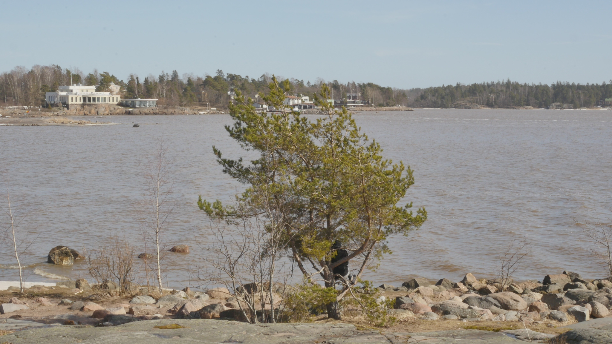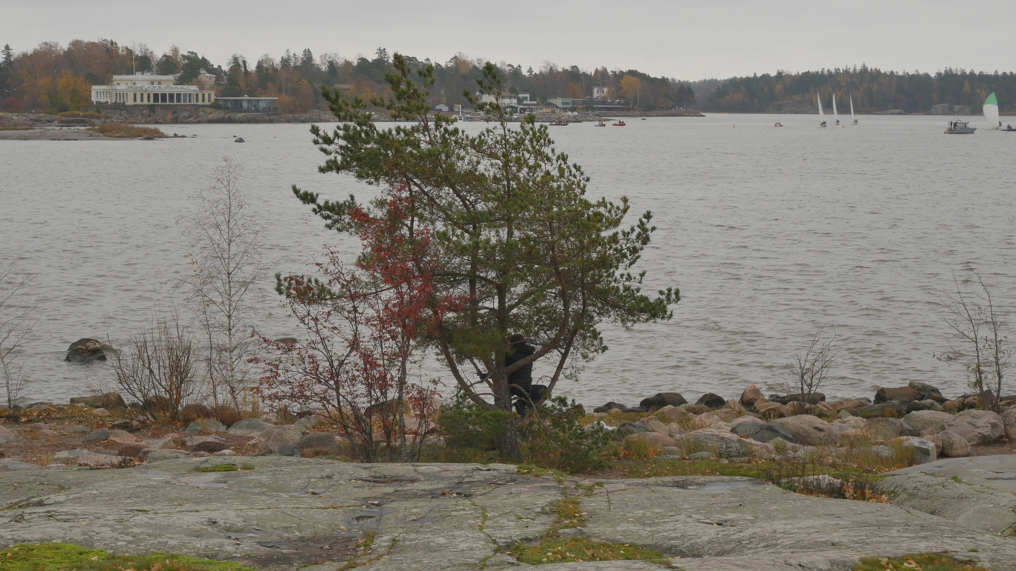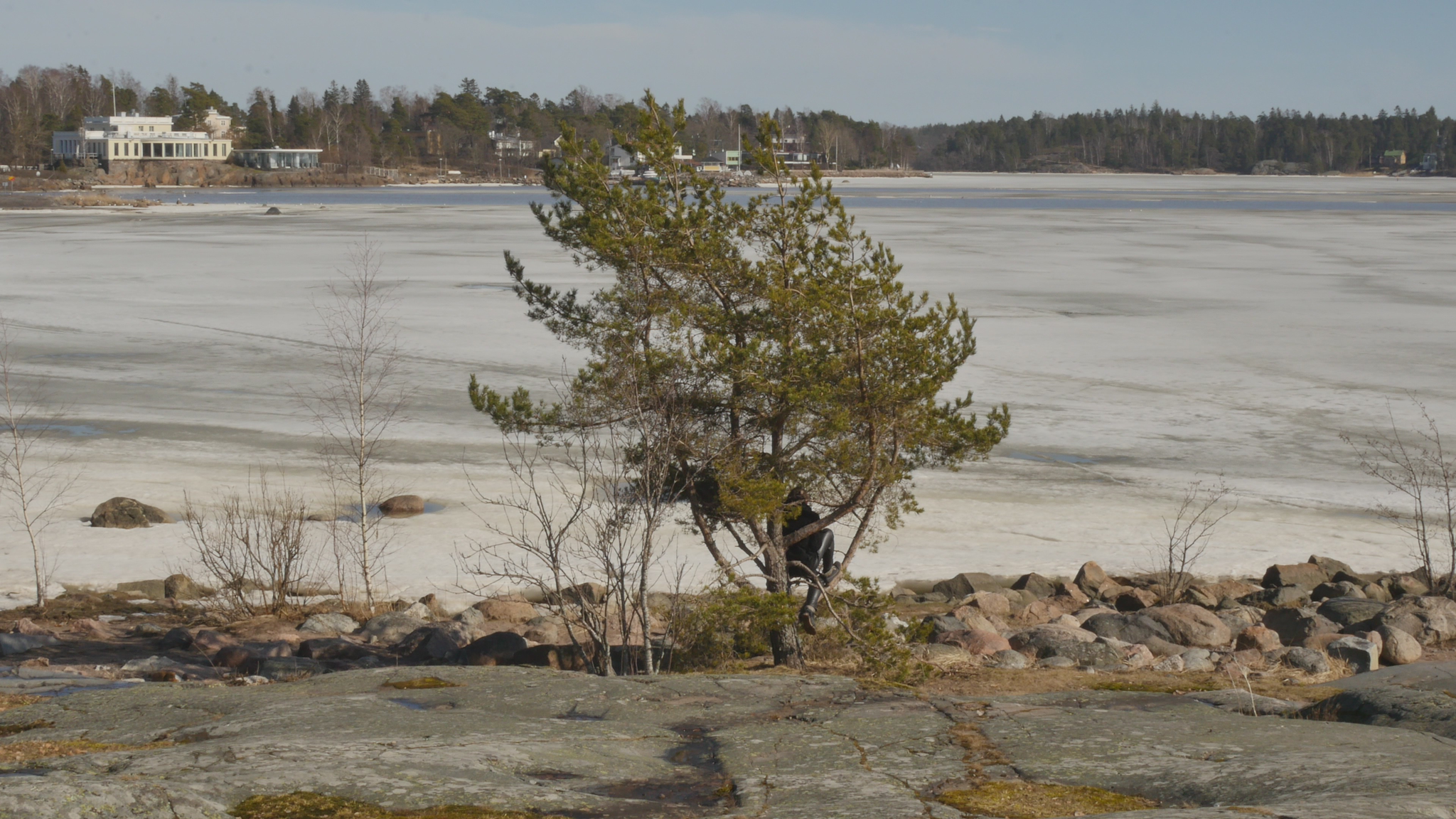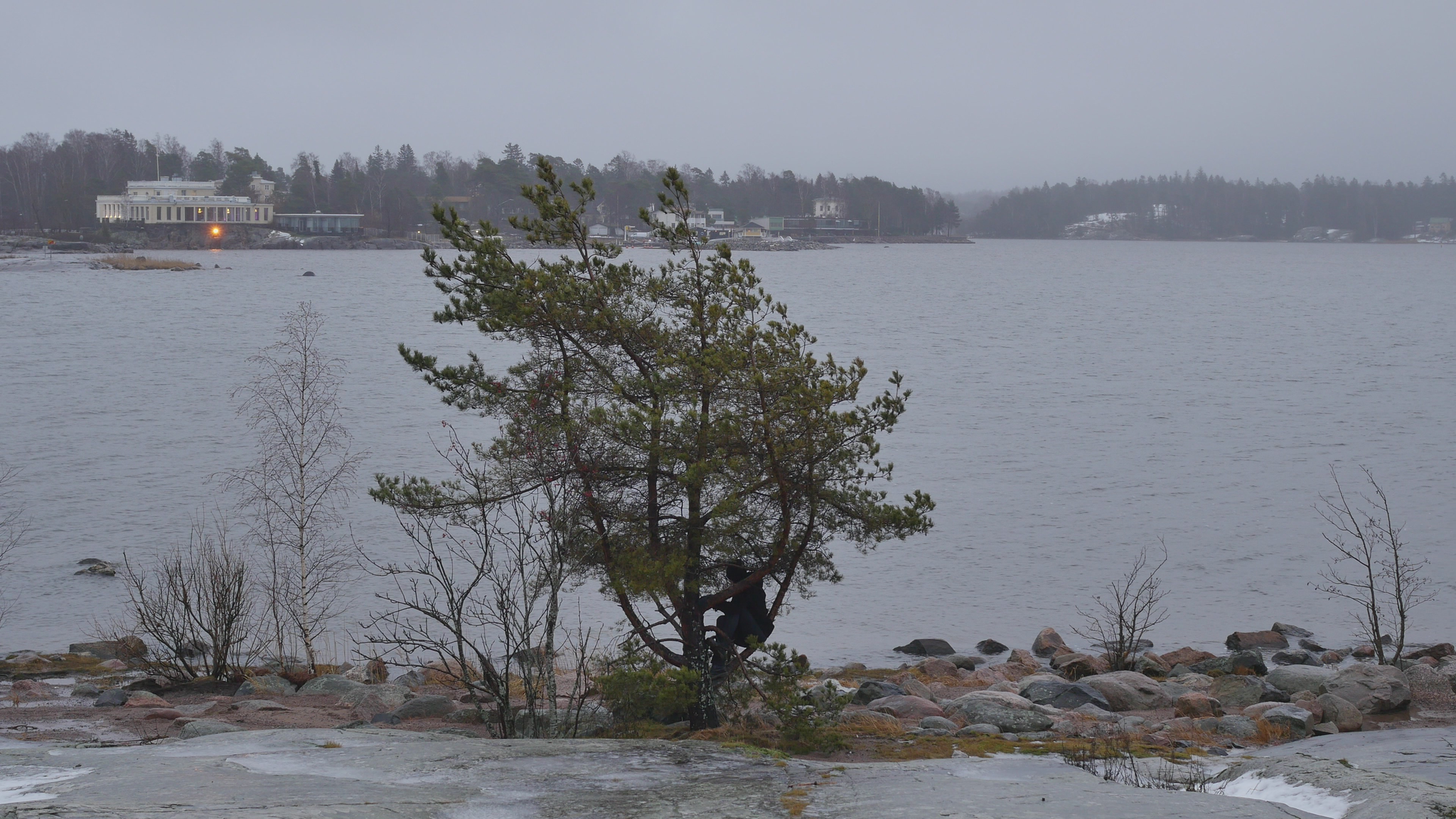 Hyvää keskiviikkoiltapäivää mänty, hyvää keskiviikko iltapäivää. Tuulee, ja tässä on tuulinen paikka vaikka vaikka kuinka yritän istua selkä tuuleen. 13. marraskuuta. Yllättävän lämmintä suhteessa kuitenkin mutta tuulenpuuskat ovat kylmiä. Tänään ajattelin puhua kanssasi ilmakehästä ja ilmapiiristä, suomen kielessähän ne ovat kaksi eri sanaa mutta siis englanniksi atmosphere. Kyllähän suomeksikin voi sanoa atmosfääri tai ruotsiksi atmosfär, ja se tarkoittaa siis sekä tätä ilmakehää joka maapalloa ympäröi, joka on osa biosfääriä tai sitä laajempikin kai. Ja sitten toisaalta ilmapiiri, joka suomen kielessä on suurin piirtein sama kuin tunnelma. Mutta atmosfääristähän puhutaan että jossakin seurueessa on tietynlainen atmosfääri tai ilmapiiri tai... Mutta jotenkin ilmapiiri on niin vahvasti ihmisiin liittyvä asia, että melkein vaikea ajatella edes että tässä olisi ilmapiiri, vaikea ajatella, että huoneessa olisi jonkinlainen ilmapiiri ilman, että siellä olisi ihmisiä. Tunnelma tietysti voi olla, joka tulee materiaaleista ja väreistä ja muodoista. No, ehkä ilmapiirikin. Mutta miksi tätä nyt ajattelin oli koska olin eilen, minulla oli hieno kokemus toimia verkon kautta toisena opponenttina väitöskirjaan, jonka nimi oli englanniksi Estranging Trams: Atmospheres of Trams in Art elikkä Raitiovaunujen vieraannuttaminen tai oudoksi tekeminen ja raitiovaunujen ilmapiiri taiteessa. Miksi minä nyt, mitäs minä raitiovaunuista tiedän, mutta koska kyseessä oli taiteellinen tutkimus vaikka tutkimus tehtiin ikään kuin kulttuurintutkimuksen alalla ja itse asiassa liikkuvuus- siis jopa yhteiskuntatieteiden alalla, se oli monitieteinen. Ja minä olin ikään kuin edustamassa sitä taiteellista asiantuntemusta ja taiteen tekemisellä olikin varsin merkittävä rooli siinä väitöstyössä. Se oli keskeinen metodologia koska väittelijä esimerkiksi piirsi raitiovaunuja, sekä raitiovaunujen sisällä, ihmisiä ja asioita ja näkymiä, mutta myös sitten raitiovaunuja ulkoapäin ja raitiovaunupysäkkejä. Sen lisäksi hän hän teki performansseja ja kaikenlaisia työpajakokeiluja suhteessa raitiovaunureitteihin ja myös raitiovaunuihin. Mutta siis mitä tämä meidän keskusteluihimme liittyy, niin lähinnä sitä kautta, että voisiko ilmapiiri olla ikään kuin asia jonka avulla kommunikoida ei-inhimillisten olentojen kanssa. Tämä väittelijä hän perusti työnsä semmoisen saksalaisen esteetikon, Böhme nimisen esteetikon teorioihin, jotka ovat kyllä vahvasti ihmiskeskeisiä koska Böhme nimenomaan korostaa, että atmosfääri on ikäänkuin puoliksi objektiivinen ja puoliksi subjektiivinen. Siihen voi vaikuttaa, atmosfäärejä voi luoda ja rakentaa erilaisin keinoin, mutta ne ovat aina kokemuksellisia. Ja jotenkin - mutta tietysti jos hyväksyttäisiin, että muutkin elolliset voivat kokea, voivat olla kokemuksellisia subjekteja kuin ihmiset niin silloin tämä minun kyykistelyni sinun oksallasi, se voisi olla sinulle kokemus. Ja samalla tavalla kuin sinä yhdessä tämän tuulen ja tämän kivikkoisen rannan ja aika epämukavan asentoni kanssa tuottaa aivan tietynlaisen ilmapiirin nyt tähän keskustelun. Olisihan se hauskaa jos voisi ajatella ikään kuin ilmapiiriä myös muiden siihen osallistuvien kannalta, ainakin elollisten sellaisten. No, mutta tietysti siinä on suomenkielen ilmiselvä rajoite, että meillä on kaksi eri sanaa, että niitten yhteys, ilmakehän ja ilmapiirin yhteys ei ole niin ilmeinen. Koska se on toki ilmiselvää, että esimerkiksi ilman koostumus jossakin tilassa, vaikka raitiovaunussa tai nyt tässä. niin se vaikuttaa meihin ikään kuin tiedostamattamme, vaikka emme tajua sitä, että tämä olisi joku tietty kokemus, niin jos esimerkiksi happea on vähän tai ilma on ummehtunut niin totta kai se vaikuttaa meidän aivoihimme ja muutenkin. Mutta tässä nyt on happea enemmän kuin tarpeeksi tämän tuulen takia, joka tapauksessa. Mitä muuta minulla olisi sinulle kerrottavaa. Olen huomenna lähdössä Tukholmaan kissojen kanssa taas, melkein kahdeksi viikoksi ja sitten tulen vasta joskus joulun alla uudestaan keskustelemaan kanssasi. Toivotaan että ei tule pahoja myrskyjä. Toivon sitä sekä omasta puolestani, että en joutuisi laivaan joka keinuu pahasti, mutta tietysti sinun kannaltasi, jotta ei tulisi myrskyjä jotka uhkaisivat kaataa sinut tässä rannalla. Mutta toisaalta olet kasvanut sillä tavalla pyöreään muotoon ja levittänyt oksasi eri suuntiin että luulisin, että sinulla on tässä aika hyvä tasapaino. Ei ole, sinulla ei ole niin kuin semmoista korkeaa runkoa, joka voisi sitten katketa, koska siinä on niin kova vääntövoima jos tuuli sitten sitä latvusta taivuttaa. Tästä tuli nyt tämmöinen lyhyt keskustelu mutta hauska että sain taas jutella kanssasi ja kaikkea hyvää nyt tähän marraskuun loppupuoleen. Kiitos taas.