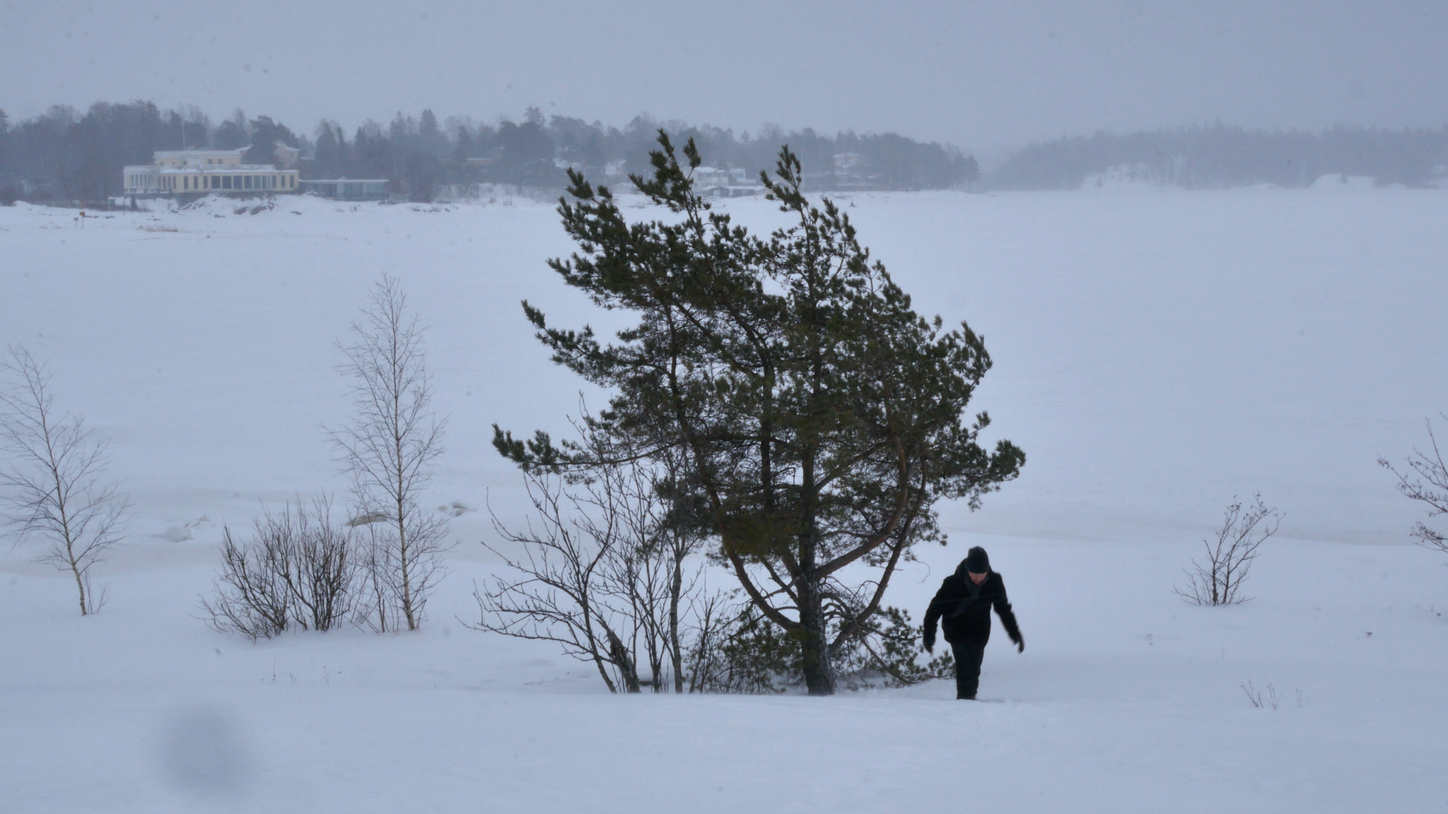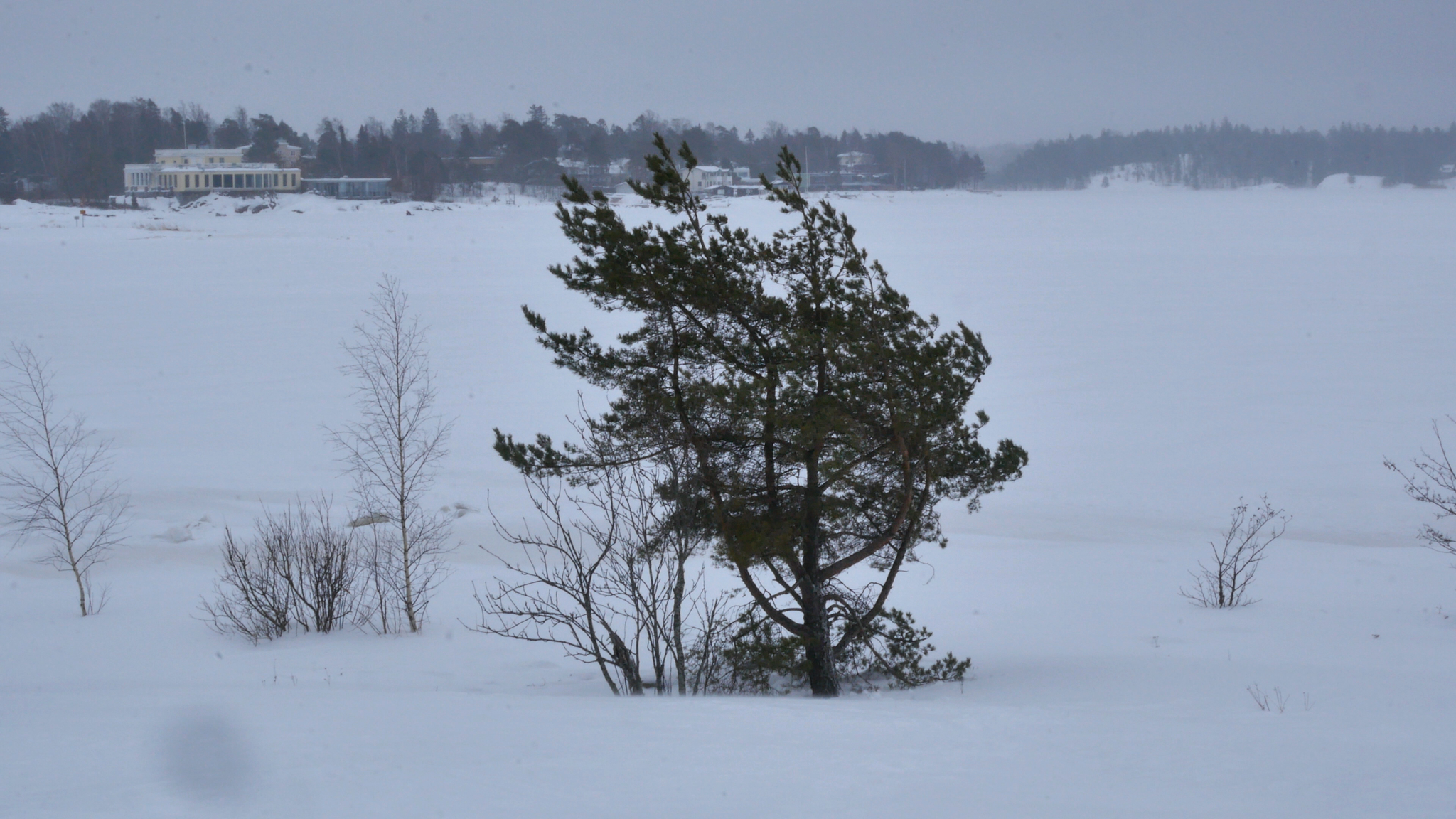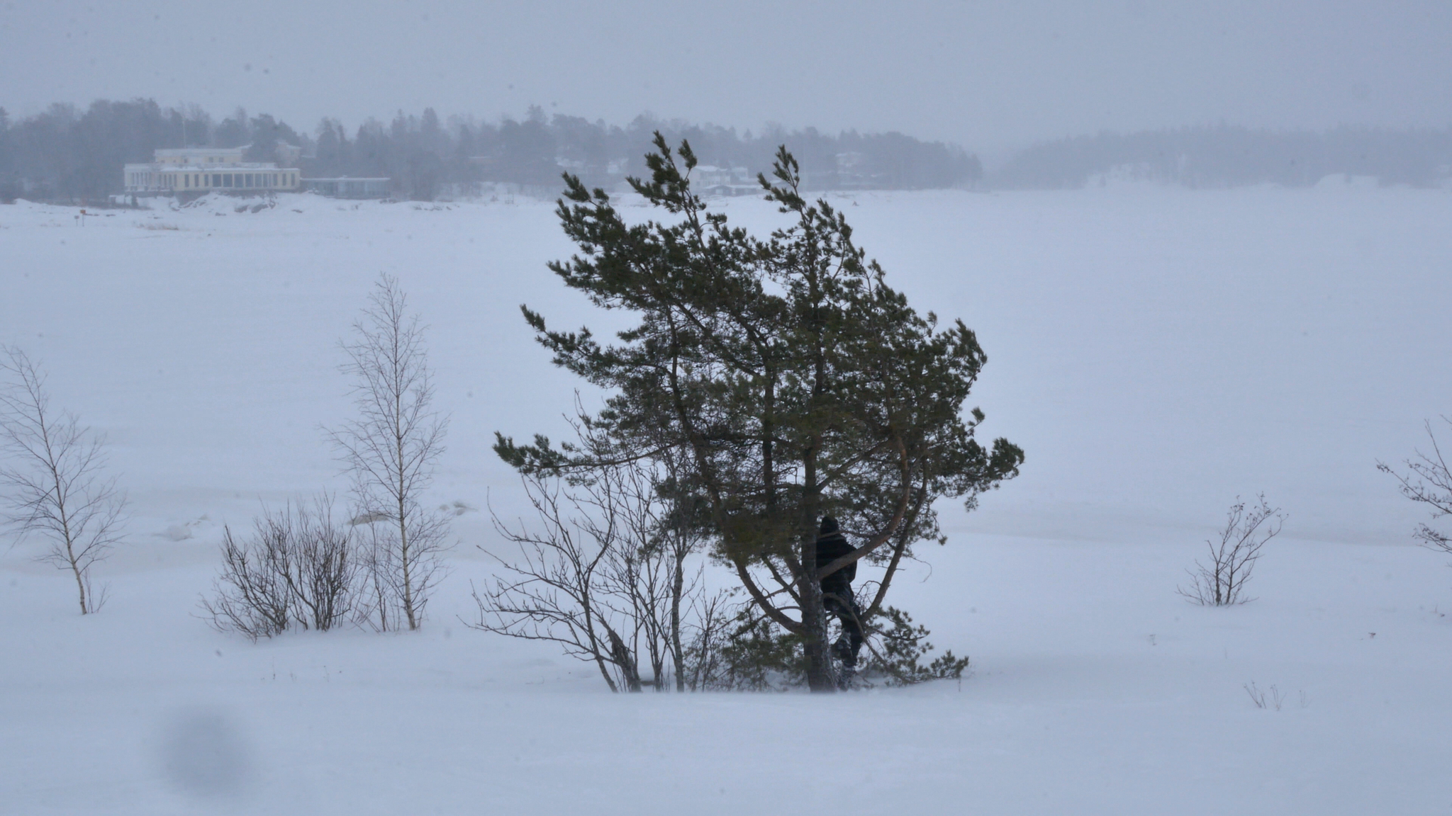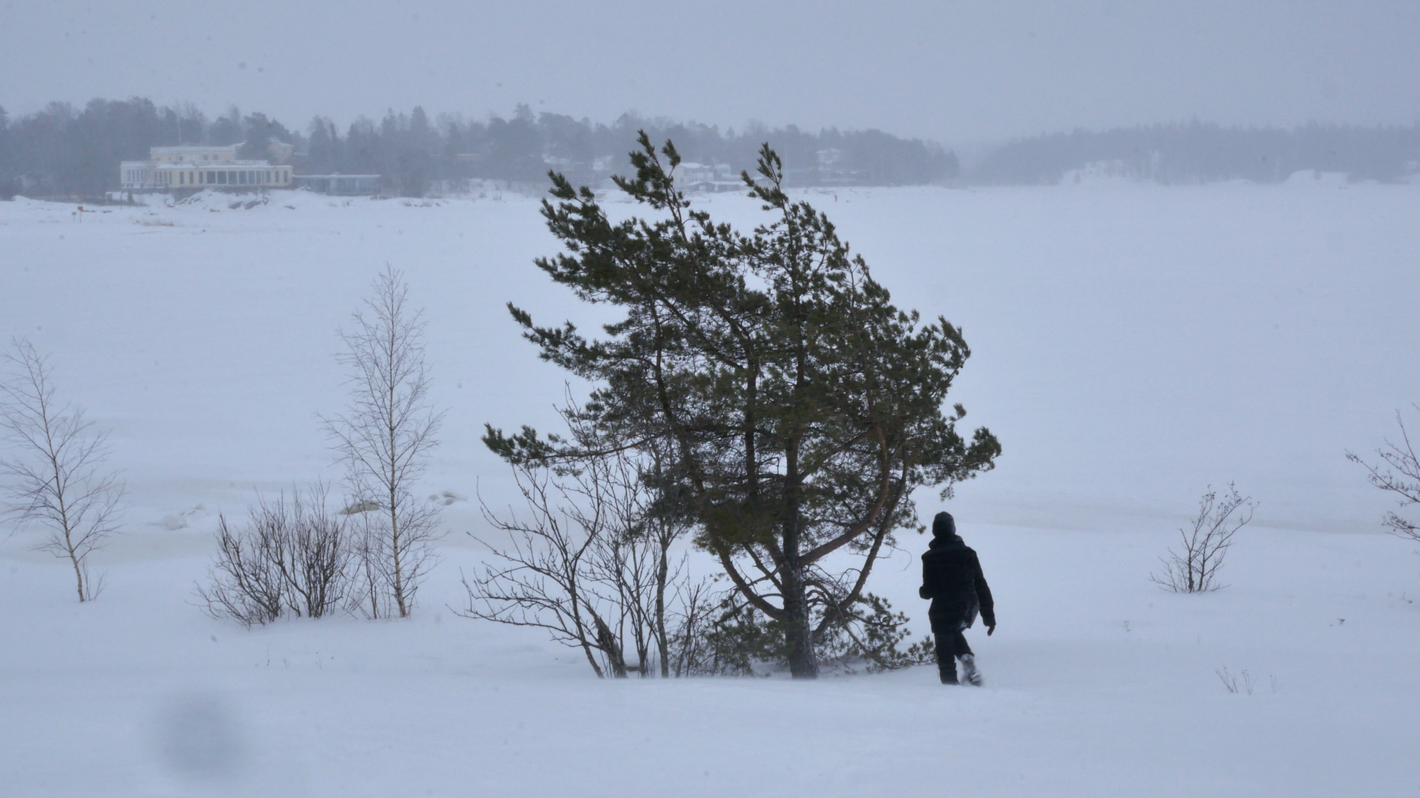 Päivää mänty, tervehdys tänä tuulisena sunnuntaipäivänä. Nyt todella tuulee. En tiedä miten voisin suojata mikrofonia tuulenpuuskilta. Pyryttää lunta ja on aika kylmä. Tämä on ensimmäistä kertaa kun tapaamme ja pahoittelen että tulin näin kömpelösti sinun luoksesi mutta tuulella on osuutensa asiaan. Haluaisin keskustella sinun kanssasi tulevana vuonna silloin tällöin ja ajattelin, että voisin ensin esittäytyä. Siis en ole täällä Mustikkamaalla tutustunut yhteenkään mäntyyn, mutta olen keskustellut monien mäntyjen kanssa muun muassa Kaivopuistossa ja Seurasaaressa ja Harakan saarella. Mutta nyt minä näen tästä mikrofonista, että on hyvin epätodennäköistä että mitään tulee kuulumaan tästä, joten se voi olla että minun täytyy tulla sinun luoksesi uudestaan ja tämä on vaan tämmönen ensimmäinen yritys. Mutta kiitos kuitenkin ja nähdään pian taas ja toivottavasti pääsemme tutustumaan hiukan leppoisammissa kuvioissa.